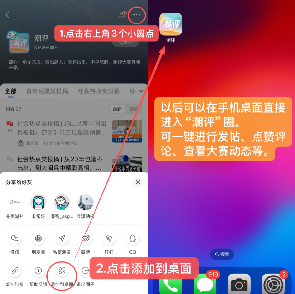 【最新通知】小编有话说!这是一则参与须知:欢迎各位评友们在潮新闻客户端踊跃投稿,只要将你的作品发布至“潮评”圈子即视为投稿成功,投稿时请在文中标注好你的“学校+姓名”。 请扫码加入圈子群聊(大赛官方群),更多赛事信息会在群里通知,欢迎在群里交流选题、讨论稿件。每次投稿后,欢迎你将作品转发至群聊并自荐,更容易被官方看到。 之后我们将会在所有投稿中精选采用优质稿件刊发在潮新闻客户端或浙江日报版面,入选的佳作可在群聊或圈子“佳作展示”专栏呈现,等待被我们“翻牌”吧! 别忘了加入“潮评”圈,并把“潮评”添加到你的手机桌面畅聊发帖吧~ 具体操作如下图指引:
