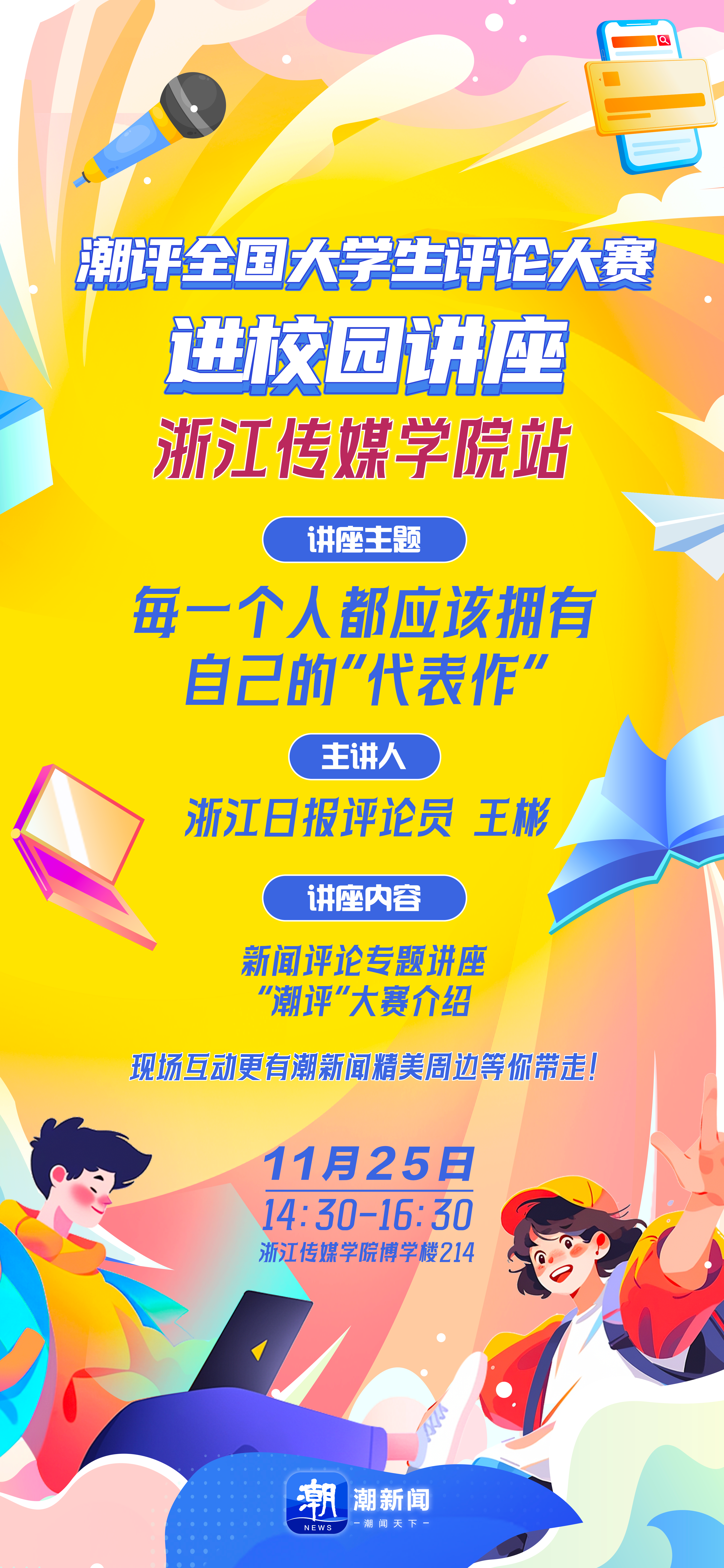 “潮评”全国大学生进校园活动来啦! 我们要来你的学校见你啦![哇] 热点事件层出不穷,观点交锋无处不在。 11月25日14:30,“潮评”全国大学生评论大赛进校园讲座将来到浙江传媒学院(钱塘校区博学楼214),我们将给大家带来一堂评论专题讲座,一起探讨如何让自己的观点更有条理、更有力量;如何用理性的声音,参与到我们所处的这个时代对话中来;如何在大学期间就以打造“代表作”的心态为自己积累作品。 此外,潮新闻资深运营老师将向大家讲解大赛的具体情况,现场我们还邀请了若干位参赛选手分享他们的“代表作”,并设有有奖互动的惊喜环节! 期待和大家一起探讨评论的魅力和价值!不见不散!