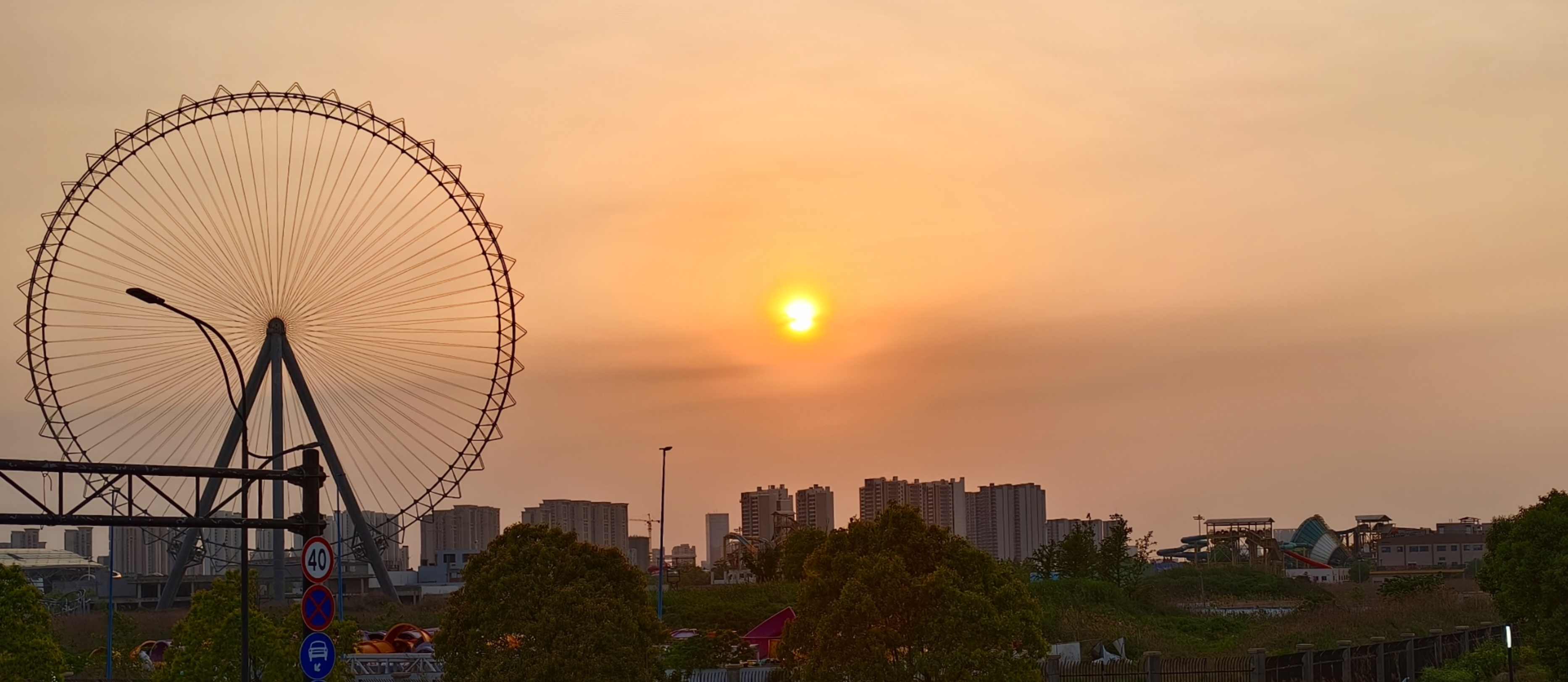 在黄昏的调色盘里,城市卸下喧嚣,摩天轮与落日完成一场盛大的交接仪式。