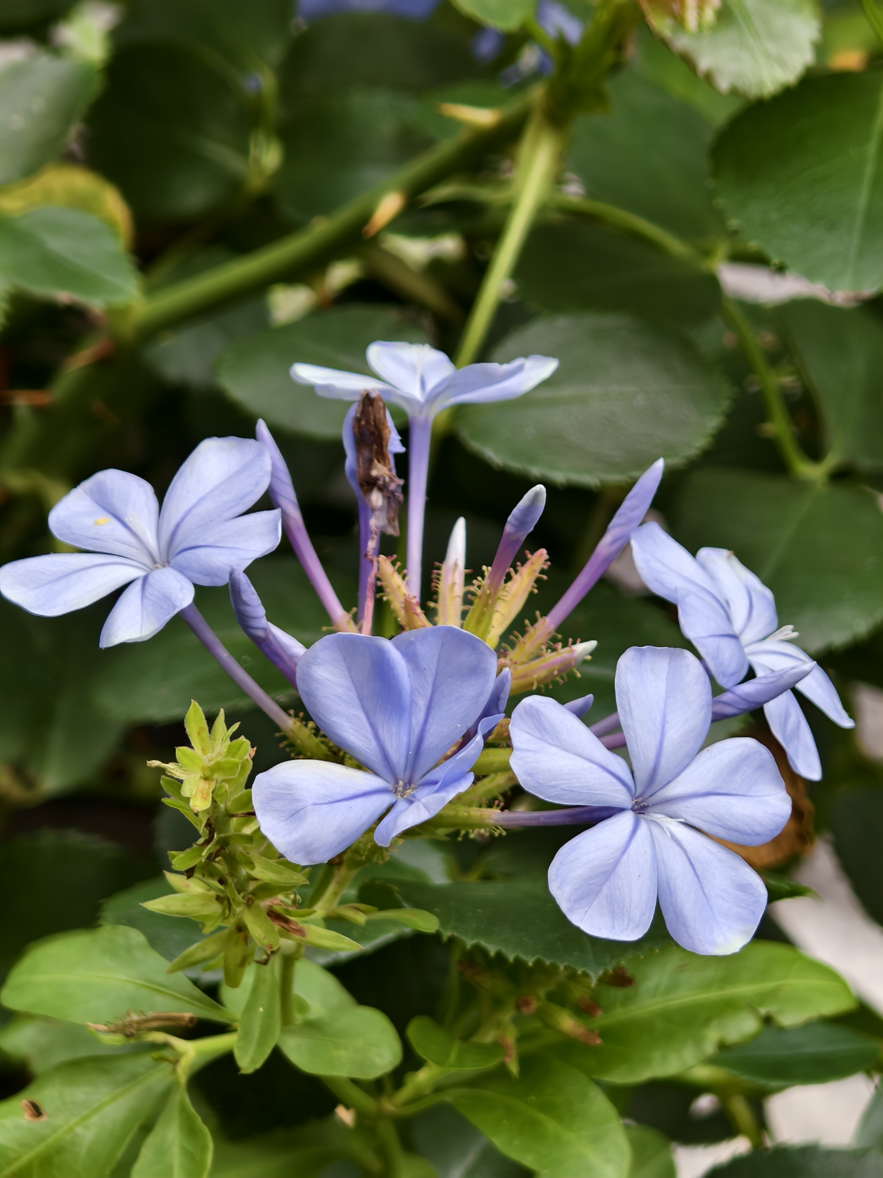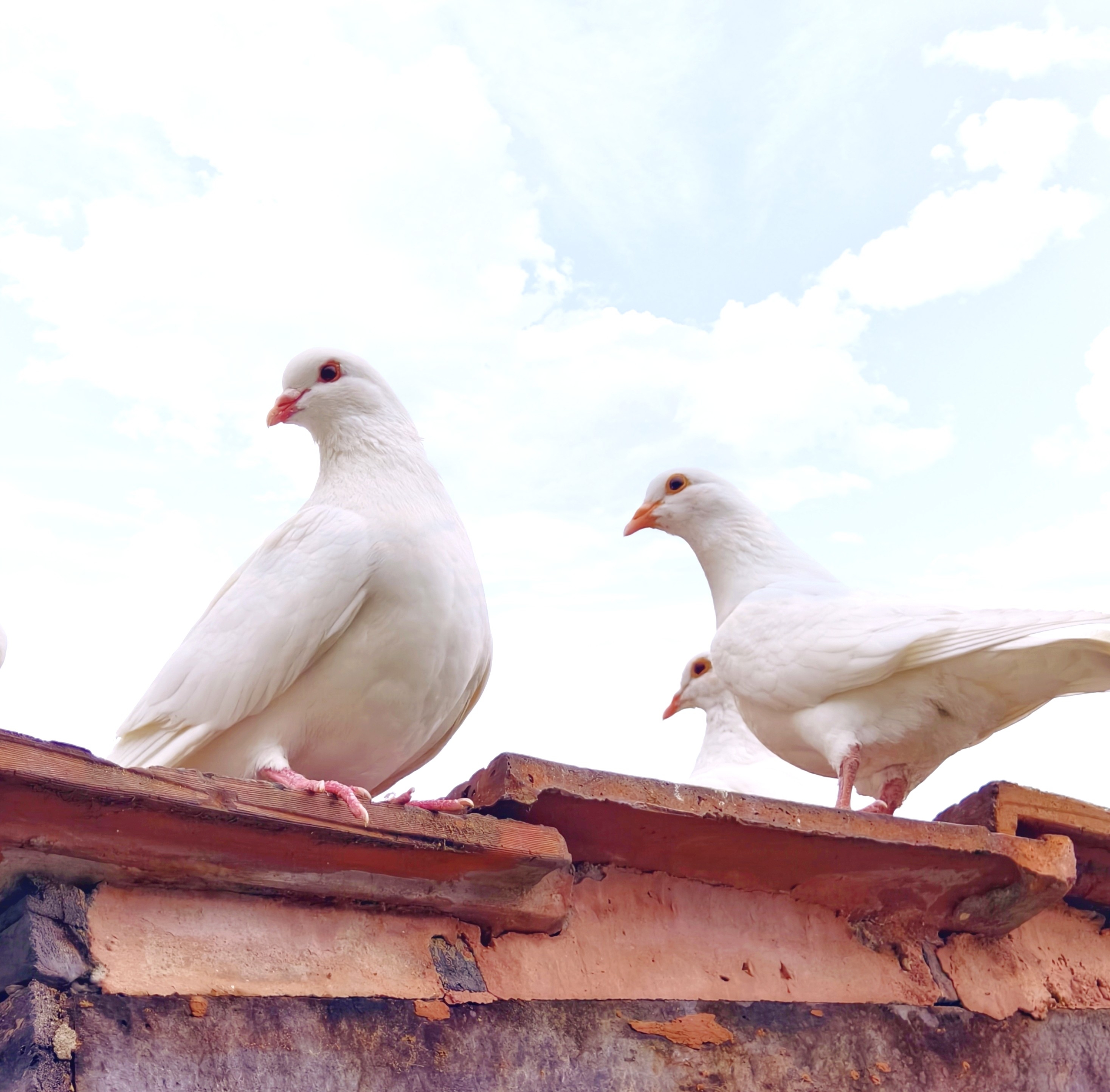鸽子在屋顶散步,蓝天白云作背景,红砖绿叶里开满了小蓝花,随手一拍都是大自然的温柔。