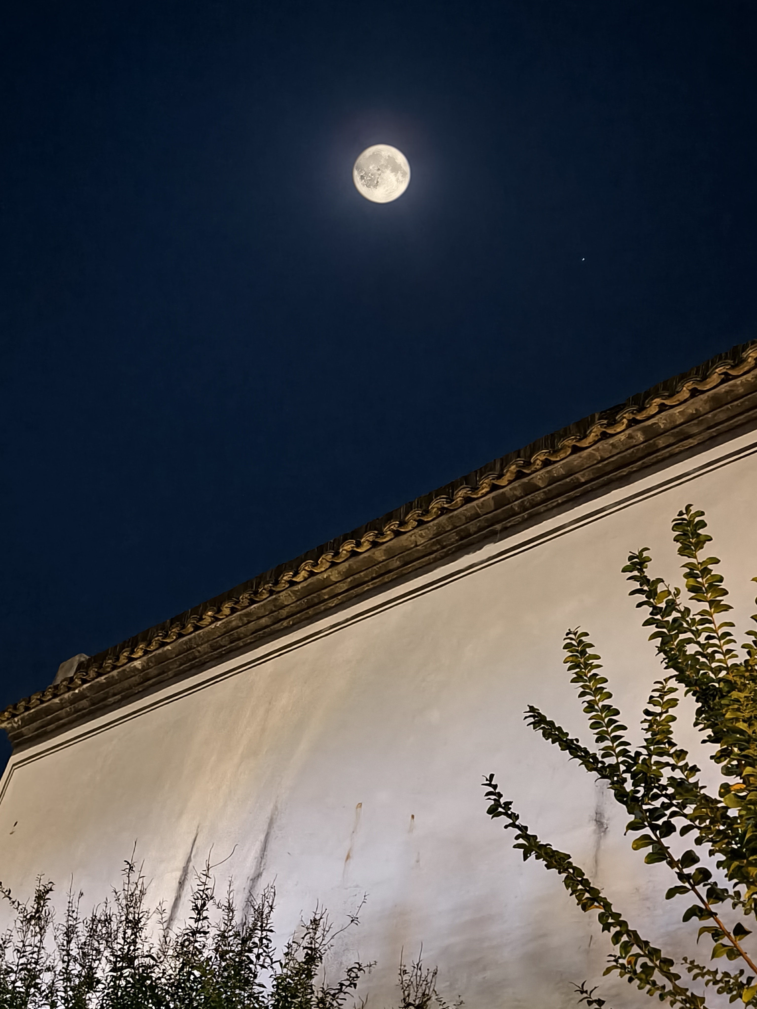 满月悬于黛瓦檐角,灯笼轻摇,映着白墙如宣纸铺展。竹影横斜处,一庭秋色,半城灯火,皆入我镜中诗行。