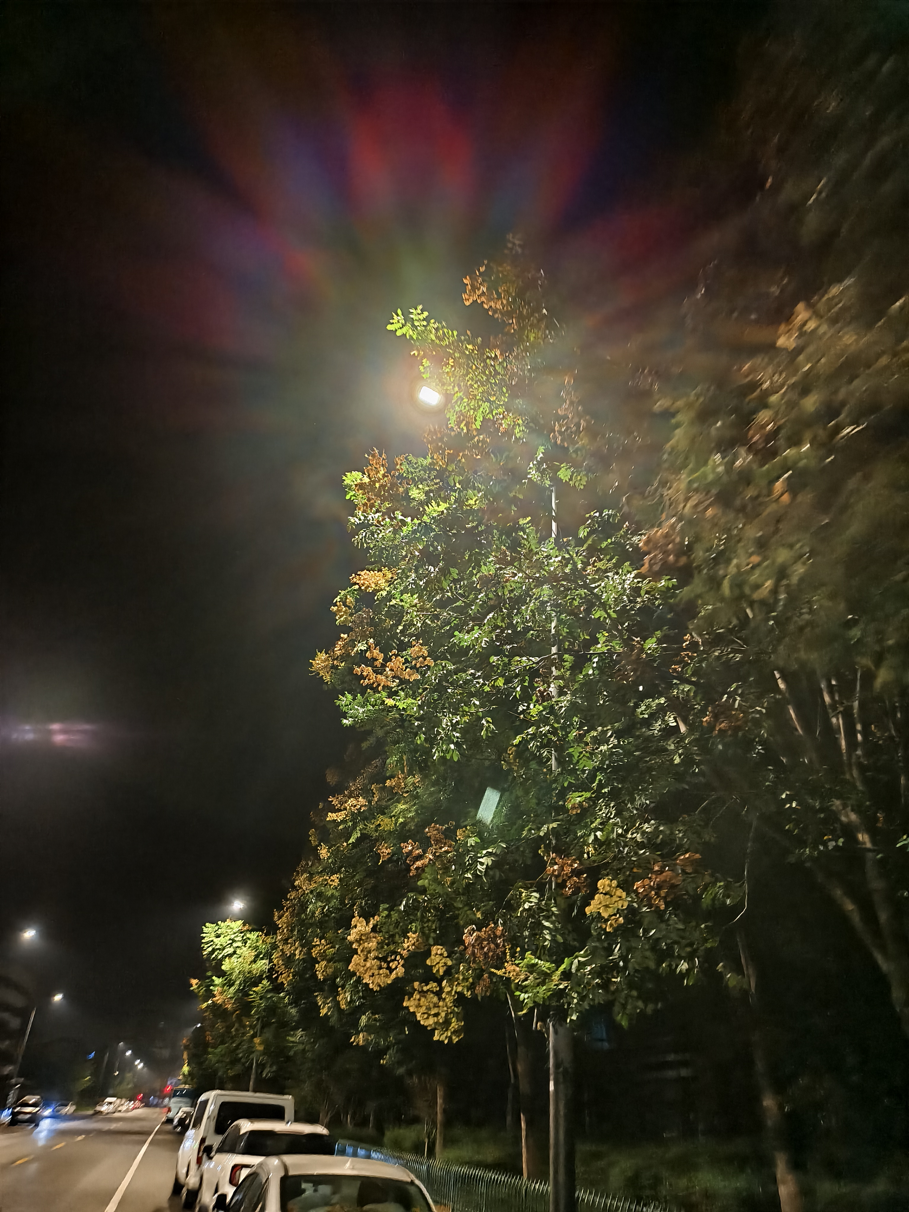 路灯亮起,树影婆娑,街边的车静静停着,光晕在夜里晕开,像城市轻轻呼吸。