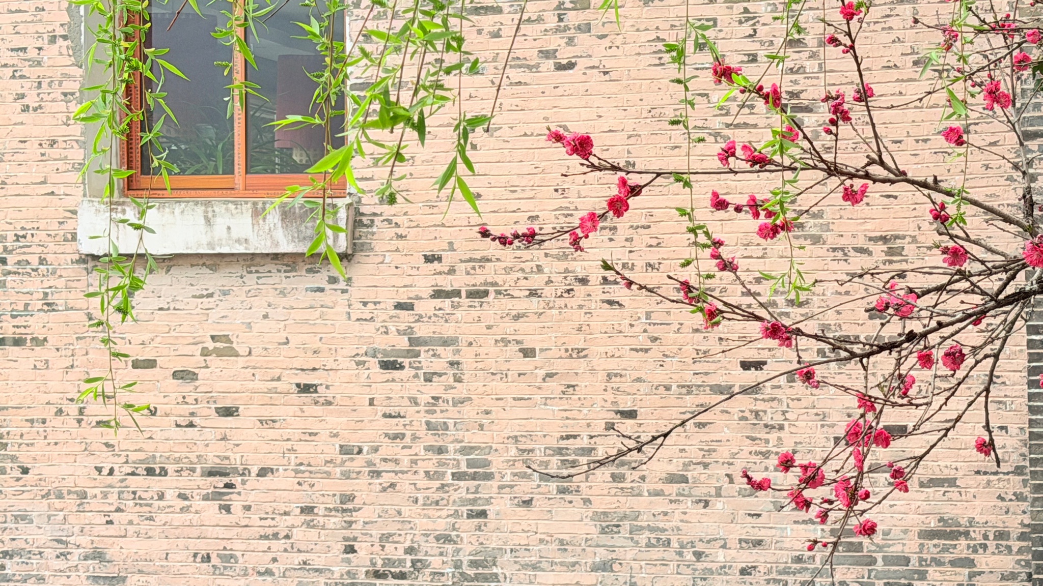 砖墙木窗旁,垂柳桃花闹春光~窗台绿意垂挂,江南庭院里偷得浮生半日闲~