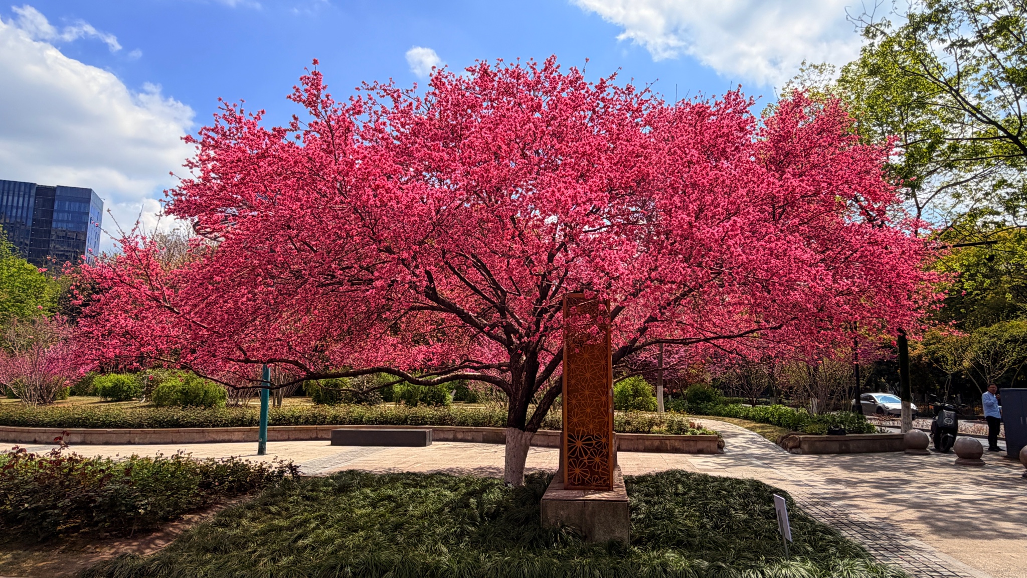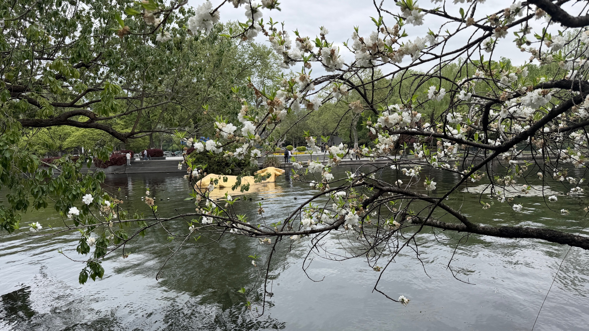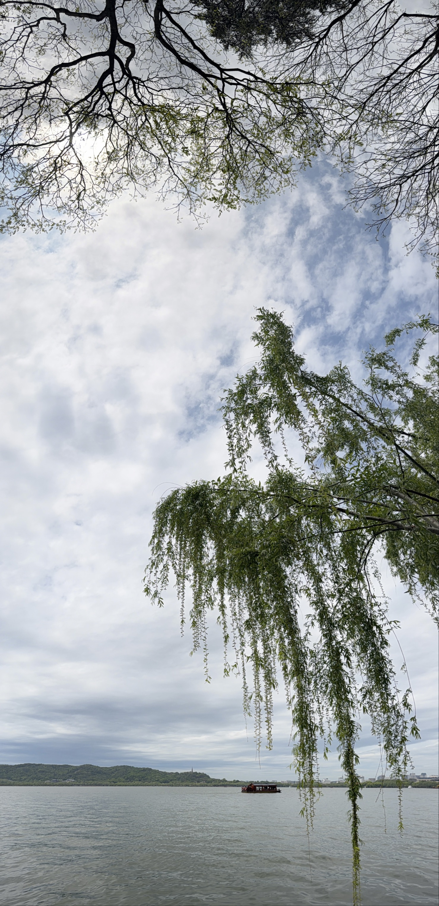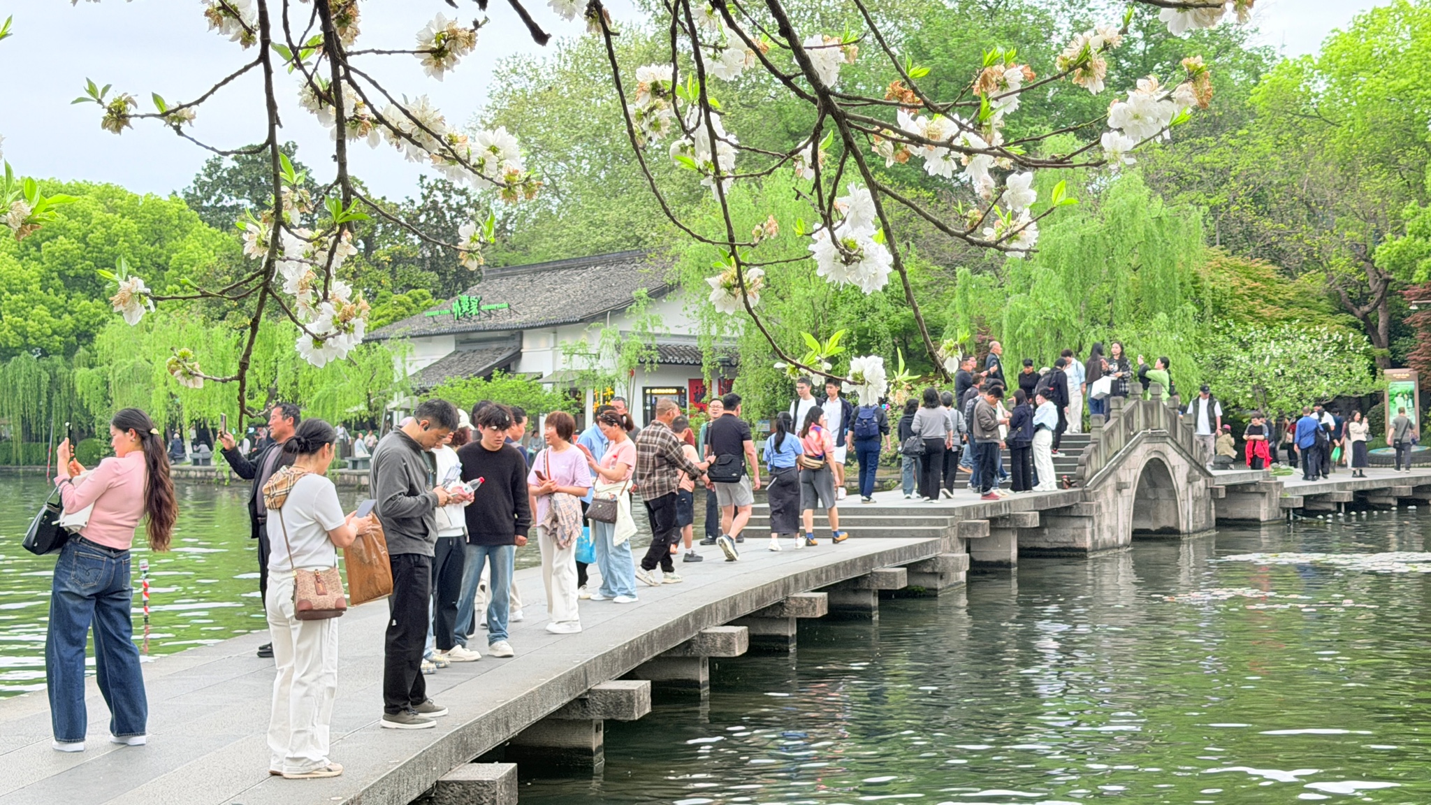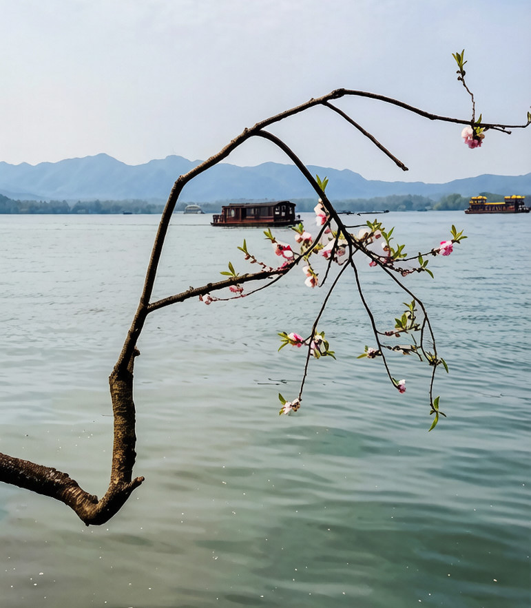 西湖春日:桃枝蘸水、樱花落船、远山入镜,这江南水墨,连风都是柔焦
