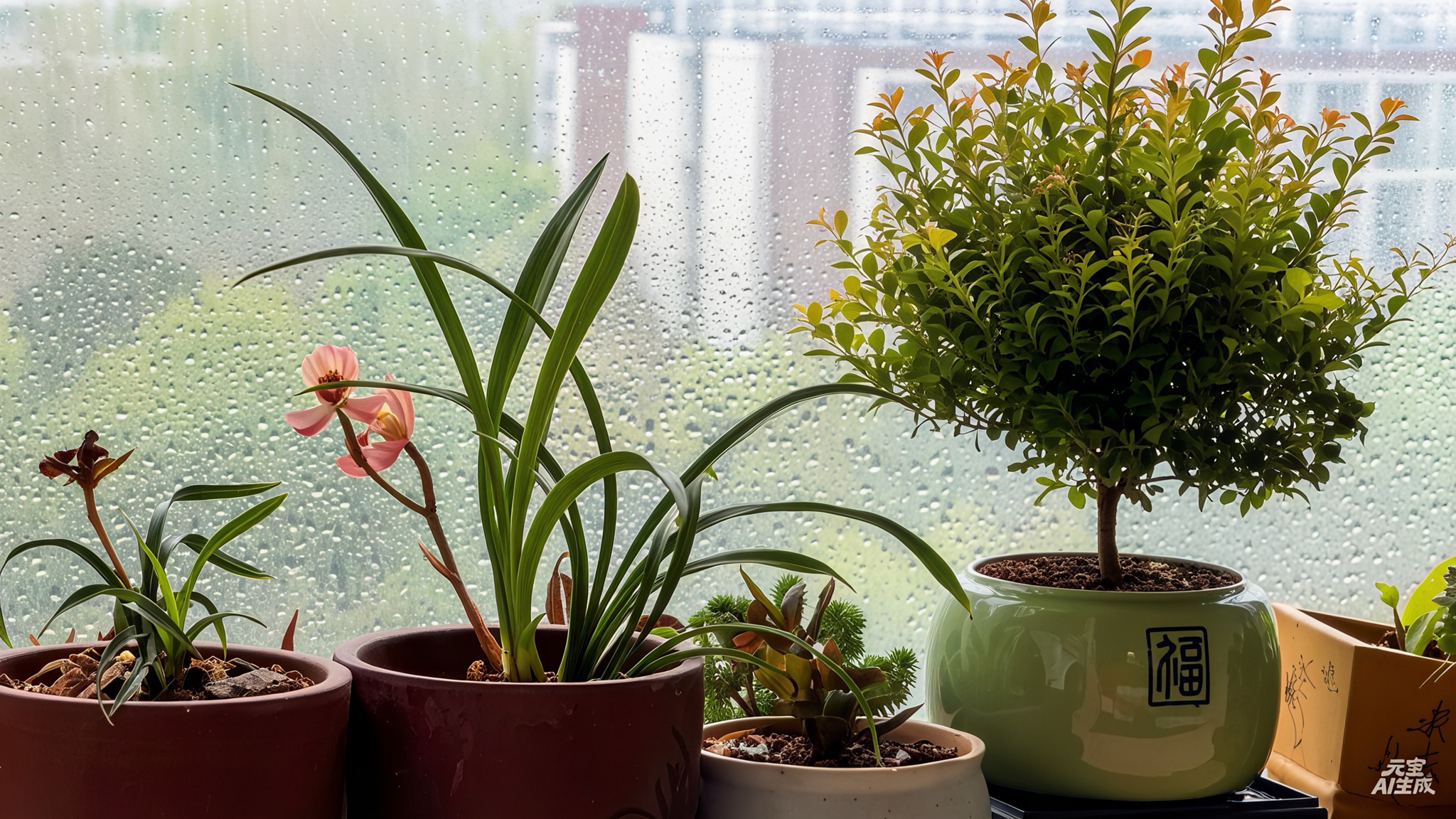 窗台小景,雨滴滑过兰花瓣,多肉在陶盆里晒着自然光,家里的春天正悄悄冒头~