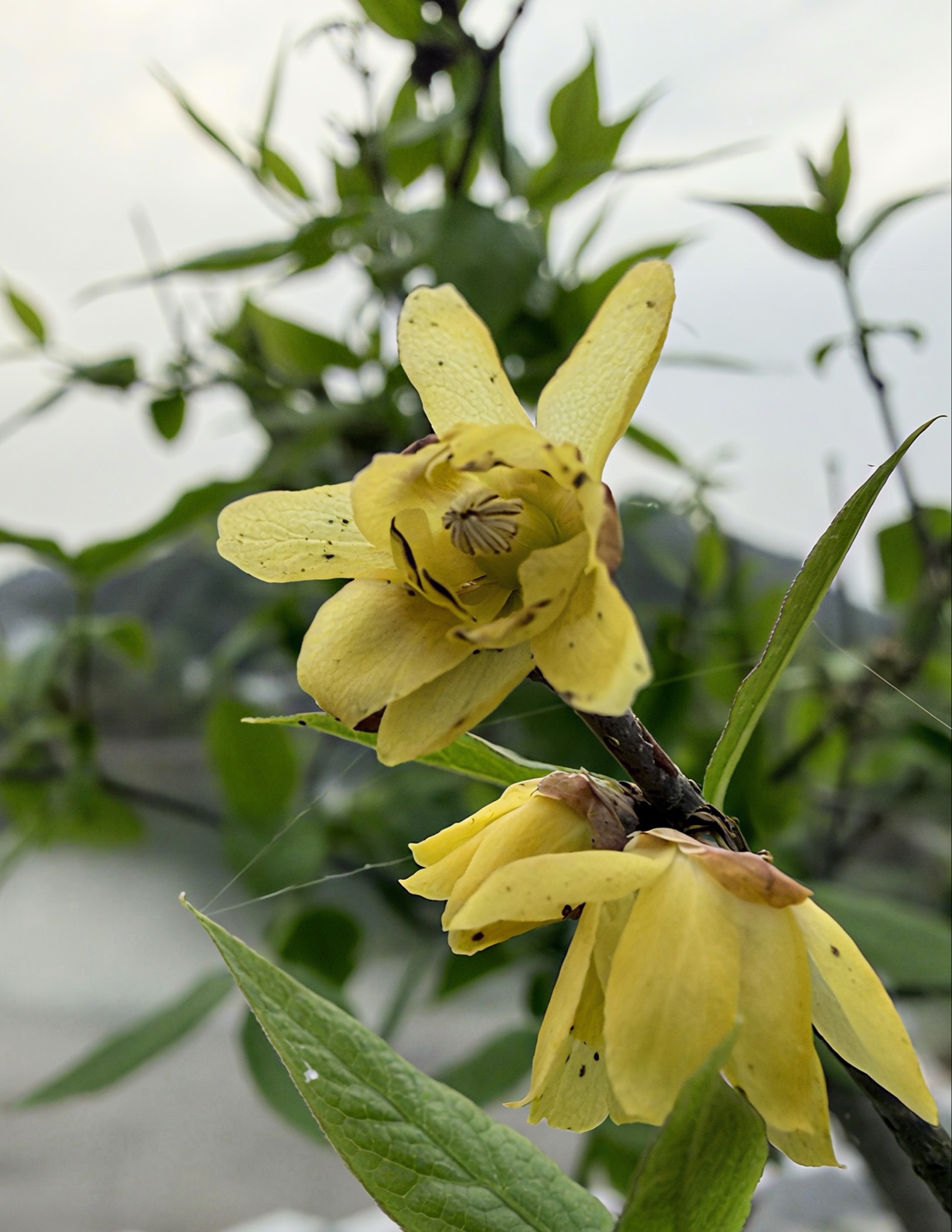 山野偶遇蜡梅,黄花绿叶映枝头,花蕊带点小斑点,春日气息扑面而来~
