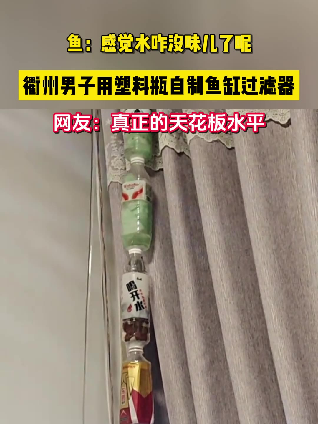 鱼:“感觉水咋没味儿了呢?” 衢州男子用塑料瓶自制鱼缸过滤器。