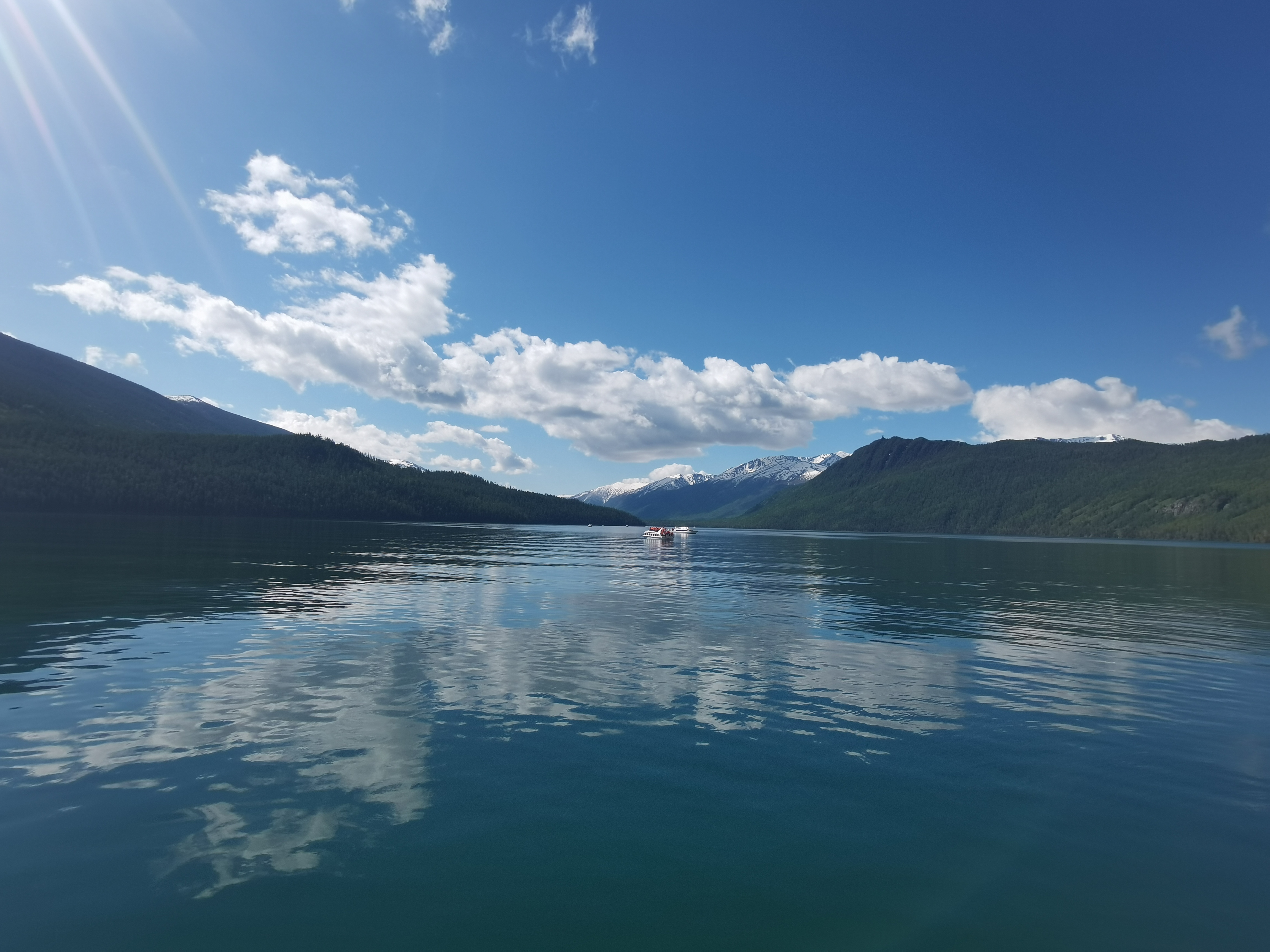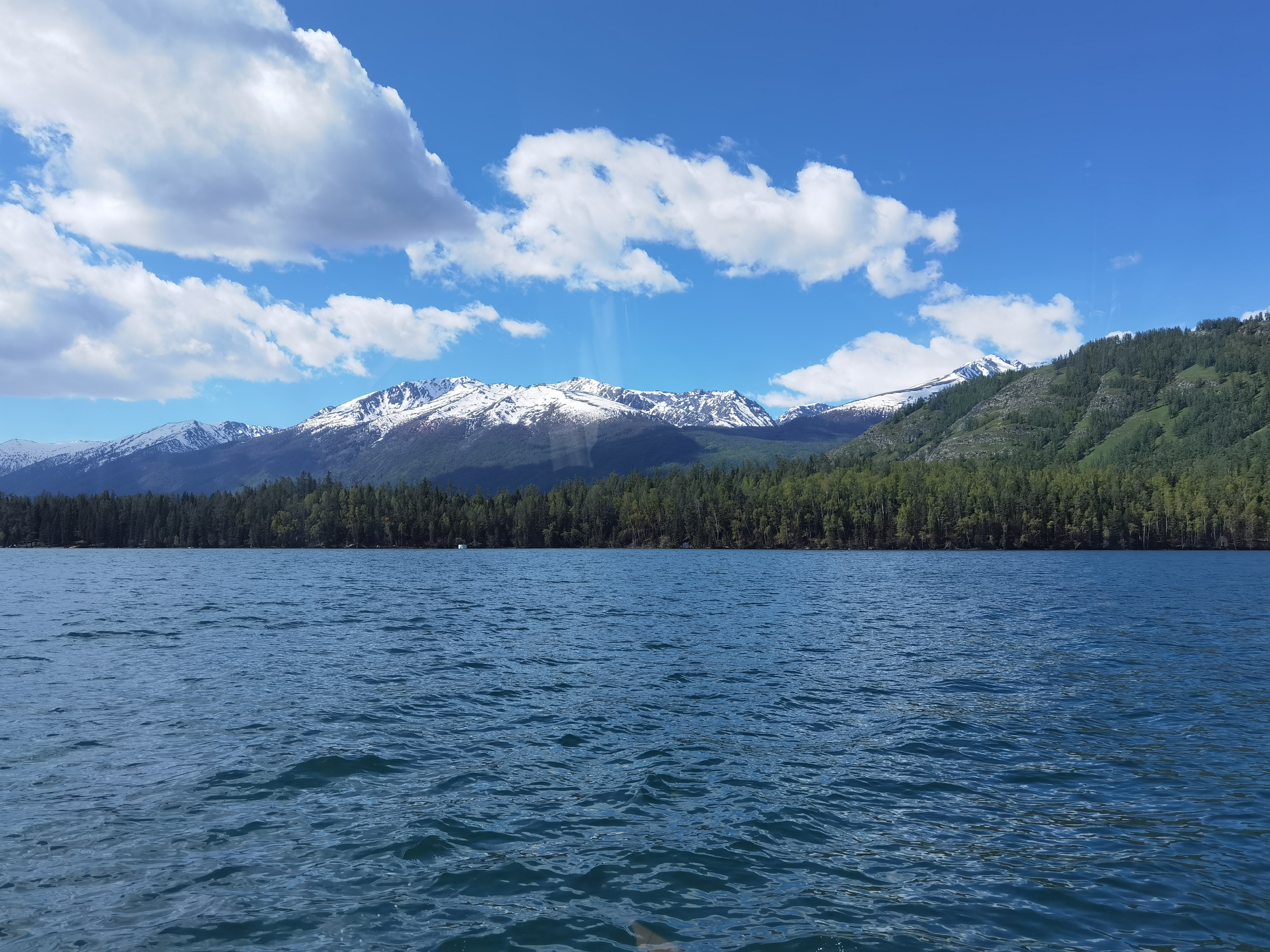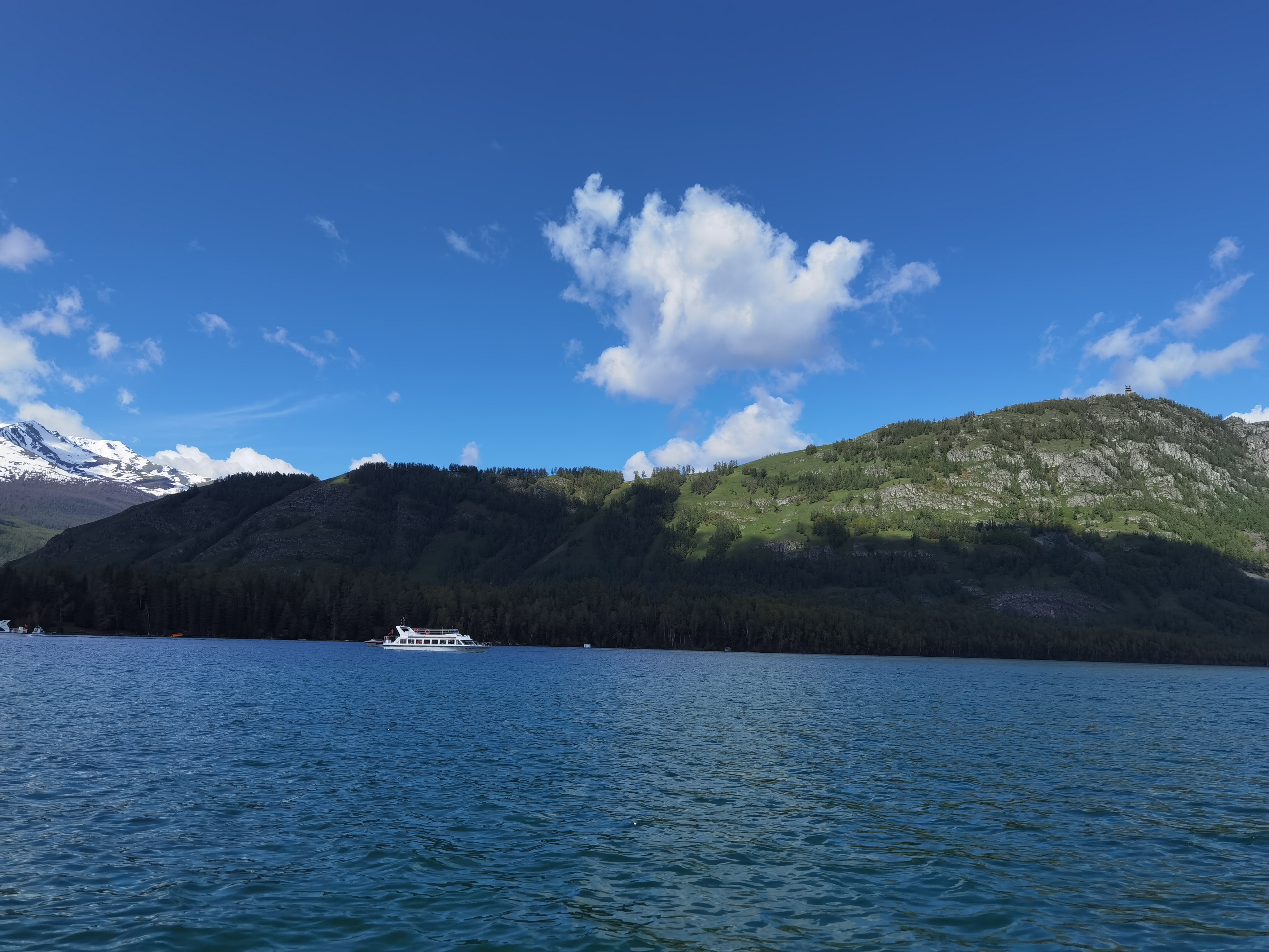 游喀纳斯湖 乘车移舟探湖怪,登高赏花为观鱼。 五月去新疆喀纳斯景区,先乘船,后登观鱼台。又从月亮湾徒步至卧龙湾,撑伞前行,风景甚佳。 咏得一首: 早晓有湖怪,波逾百米深。 远冰融近水,浓草混杂林。 赏芍悦俗目,观鱼抒老襟。 停足看月亮,徒步卧龙吟。