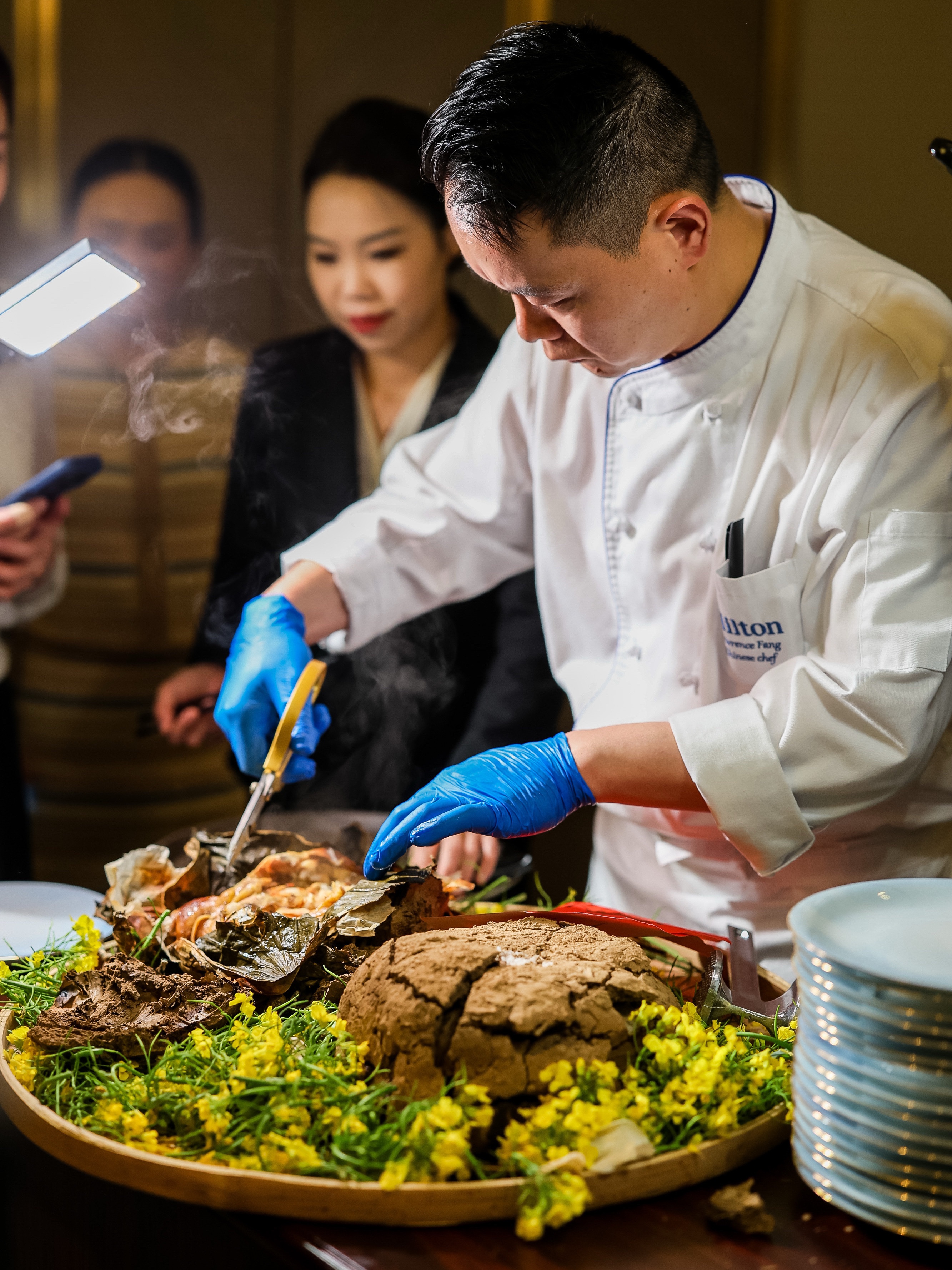 🎵北纬27度到29度交响曲|台州希尔顿×黑珍珠瓯江南,一席吃遍双城山海🌊⛰️ 台州希尔顿酒店云台阁中餐厅,最近联手温州黑珍珠一钻餐厅瓯江南,办了一场“北纬27度到29度交响曲”主题晚宴。 北纬27度到29度,黄金美食纬度。台州和温州,依山傍海,山珍海味兼备。这次由云台阁主厨方云峰师傅和瓯江南黄宗燕大师四手联弹,一餐吃尽双城风华。 👨🍳方云峰师傅,杭州临安人,从小与山林食材为伴,后来走遍台州市集、渔港、山野,挖掘民间快要失传的配方,把传统手艺和现代审美揉在一起。👨🍳黄宗燕大师,师承中国烹饪大师潘晓林,拿过全国烹饪比赛金牌、世界烹饪比赛金牌、中华金厨奖,是瓯菜传承创新的领军人物。 两位大师联手,开场就让人服气。 🦐 虾籽茭白长街蛏 长街蛏子肥厚饱满,配上咸鲜的虾籽和脆嫩的茭白一起炒,入口鲜、甜、脆、滑,四个字同时到位。 🦀 江蟹生 瓯菜里的冷盘王者。蟹肉呈半流质,却紧实有弹性,一口吸进去,有点吮吸冰淇淋的感觉。 🌿 藜蒿炝拌花螺、荠菜刀鱼腐皮卷、火丝空心菜苗 三道春日小菜,藜蒿脆嫩,刀鱼卷鲜香,空心菜苗清口,每一样都是春天的味道。 🐔 春茶烟熏葵花鸡配茶油手卷鱿鱼饭 茶香烟熏出来的鸡肉,带着淡淡烟火气,旁边是茶油拌的鱿鱼饭,海味和茶香意外地合拍。 🐟 香酥龙头鲞、卡露伽鱼子酱·低温糟香大元贝 龙头鲞炸得酥脆,咸香下酒。大元贝用低温慢煮,保留嫩度,鱼子酱和糟香一起入口,鲜得很有层次。 🥣 酸辣水潺汤 水潺嫩到一抿就化,汤底清亮,辣意温柔不冲,酸香开胃,喝完浑身暖洋洋。 🐟 红烧大鲳鱼 三斤重的本港大鲳鱼。台州有句老话:“三月鲳鱼熬蒜心”,这个时节吃鲳鱼最对味。红烧做法锁住鲜嫩,汤汁浓郁,鱼肉一瓣一瓣的,过瘾。 🧄 蒜子红焖金钱鱼皮 瓯江南的当家名菜。鱼皮焖到软糯黏唇,蒜香浓郁,色泽红亮,一口下去满满的胶质感。 🌱 油泼春笋安康鱼肝 安康鱼肝被称为“海底鹅肝”,细腻甜软,配着香脆的春笋片,油泼之后香而不腻,入口即化。 🦀 姜油老酒煎焗花蟹 花蟹用姜油和老酒煎焗,酒香渗进蟹肉里,姜味去寒提鲜,吃完连手指都要嗦一遍。 🌿 香椿酱炭烤牛肋骨 牛肋骨炭烤后外焦里嫩,配上春天限定的香椿酱,那股独特的香气和肉香搭在一起,很妙。 🧅 洋葱苗炒竹蛏王 竹蛏王肥厚脆甜,洋葱苗的辛香一激,鲜味直接翻倍。 🥬 豆瓣炒红苋菜 这一道清爽收尾,刚好。 🍘 炊圆(三种口味) 台州传统小吃做成三种:艾青佛跳墙、南瓜鲜肉、白色蟹粉。糯叽叽的外皮包着不同的馅,每一口都有新惊喜。 🦀 现拆三门蟹肉花草炒圆 开春时令菜。三门蟹肉现拆出来,鲜灵饱满,和软糯的炒圆拌在一起,是台州人春天餐桌上的白月光。 🍰 海盐咸奶油天台云雾茶奶冻 最后一道甜品。茶冻带着天台云雾茶的清香,上面是海盐咸奶油,咸甜交织,清爽不腻,收尾收得漂亮。 👅从温州瓯菜的精致典雅,到台州山海菜的醇厚本真,这一席让人彻底懂了什么叫黄金纬度的魅力。听说云台阁马上要出新菜单了,我已经在等了~🔥