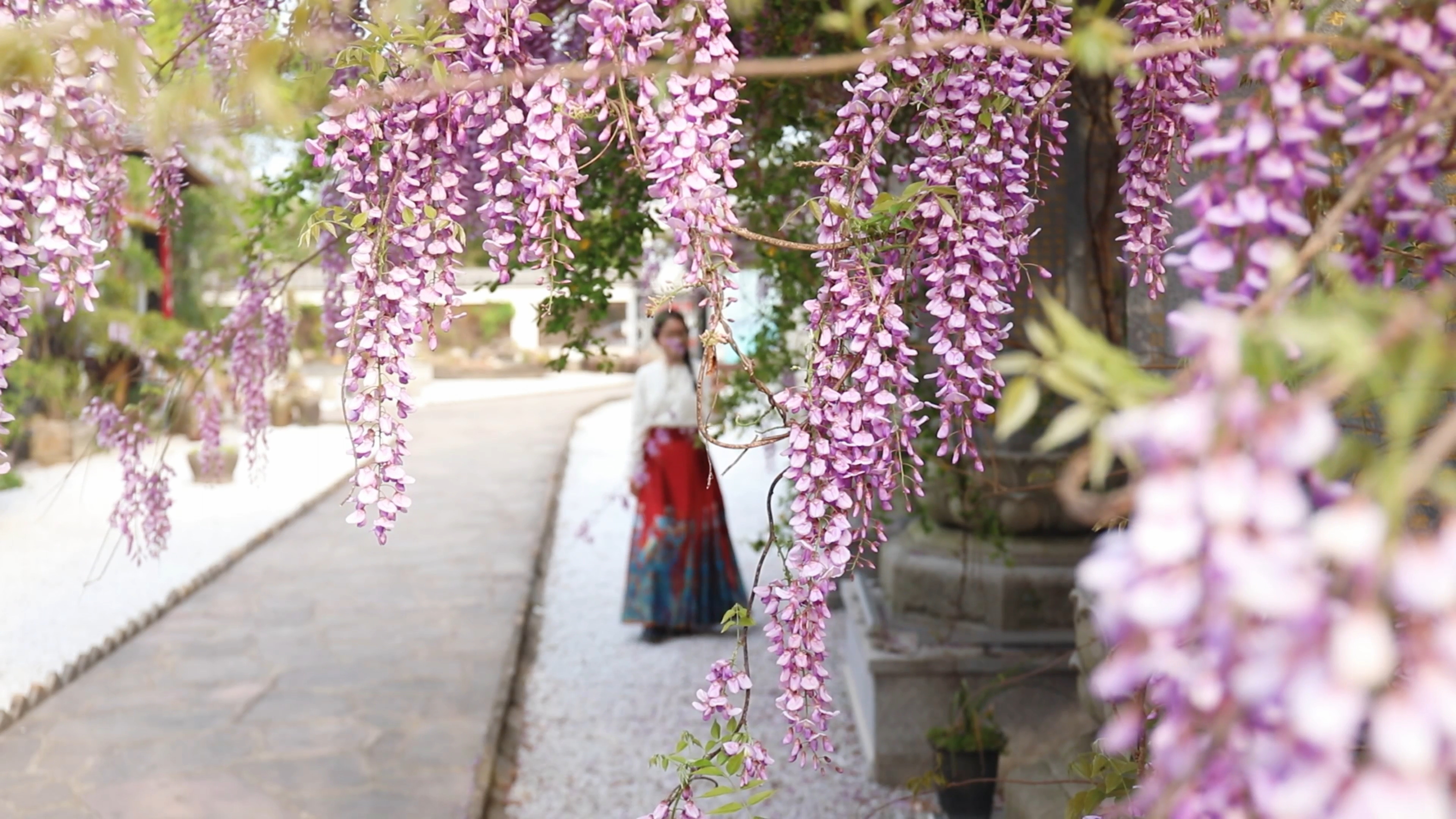 梅林君德书院的紫藤花又开啦💜 一帘紫雾垂落檐角,藤蔓绕着古建轻轻舒展 风一吹,花穗摇曳,香气温柔漫开 花瓣簌簌落在石阶上,满是春日浪漫 书院书香配紫藤花,氛围感直接拉满✨