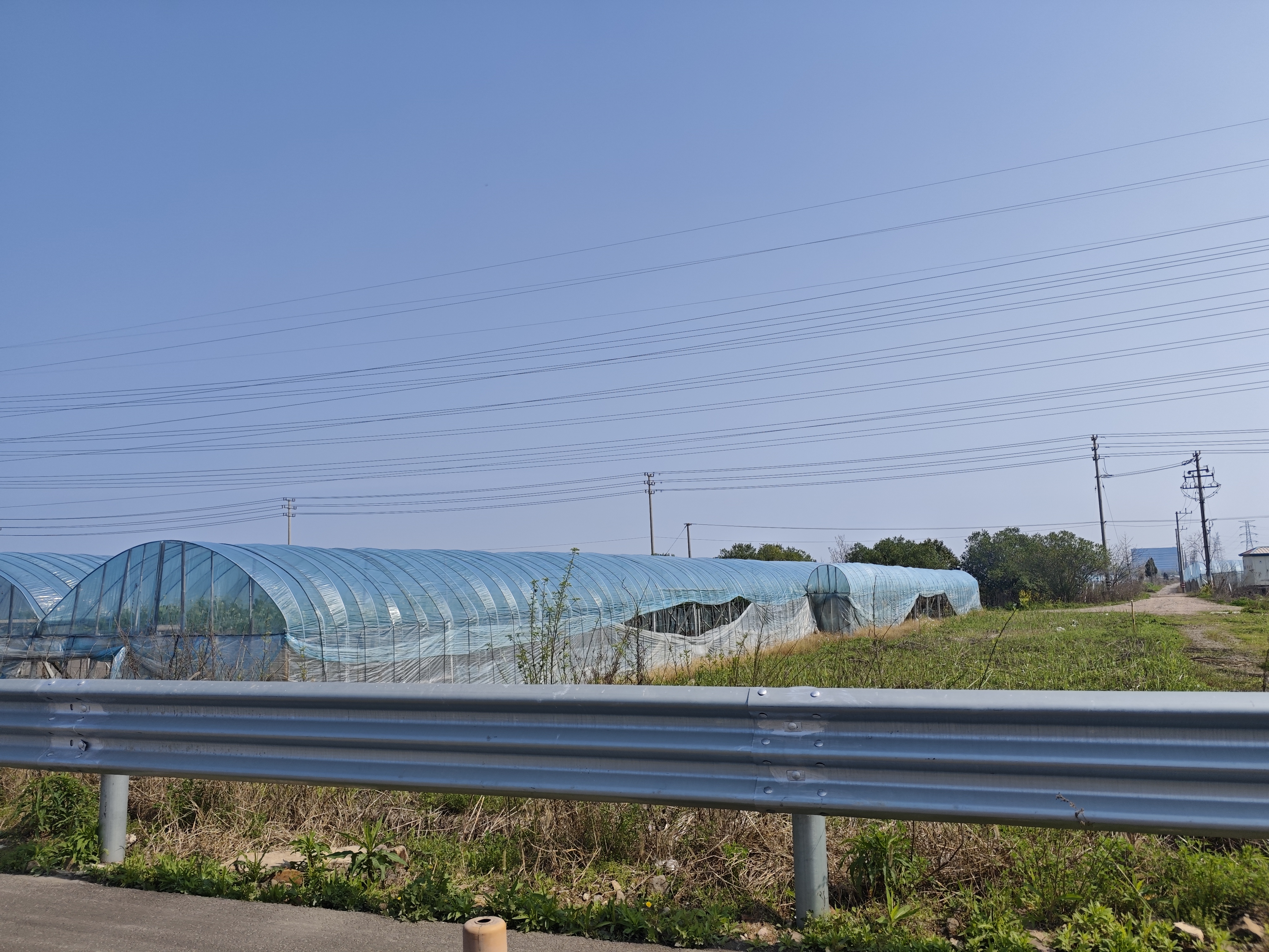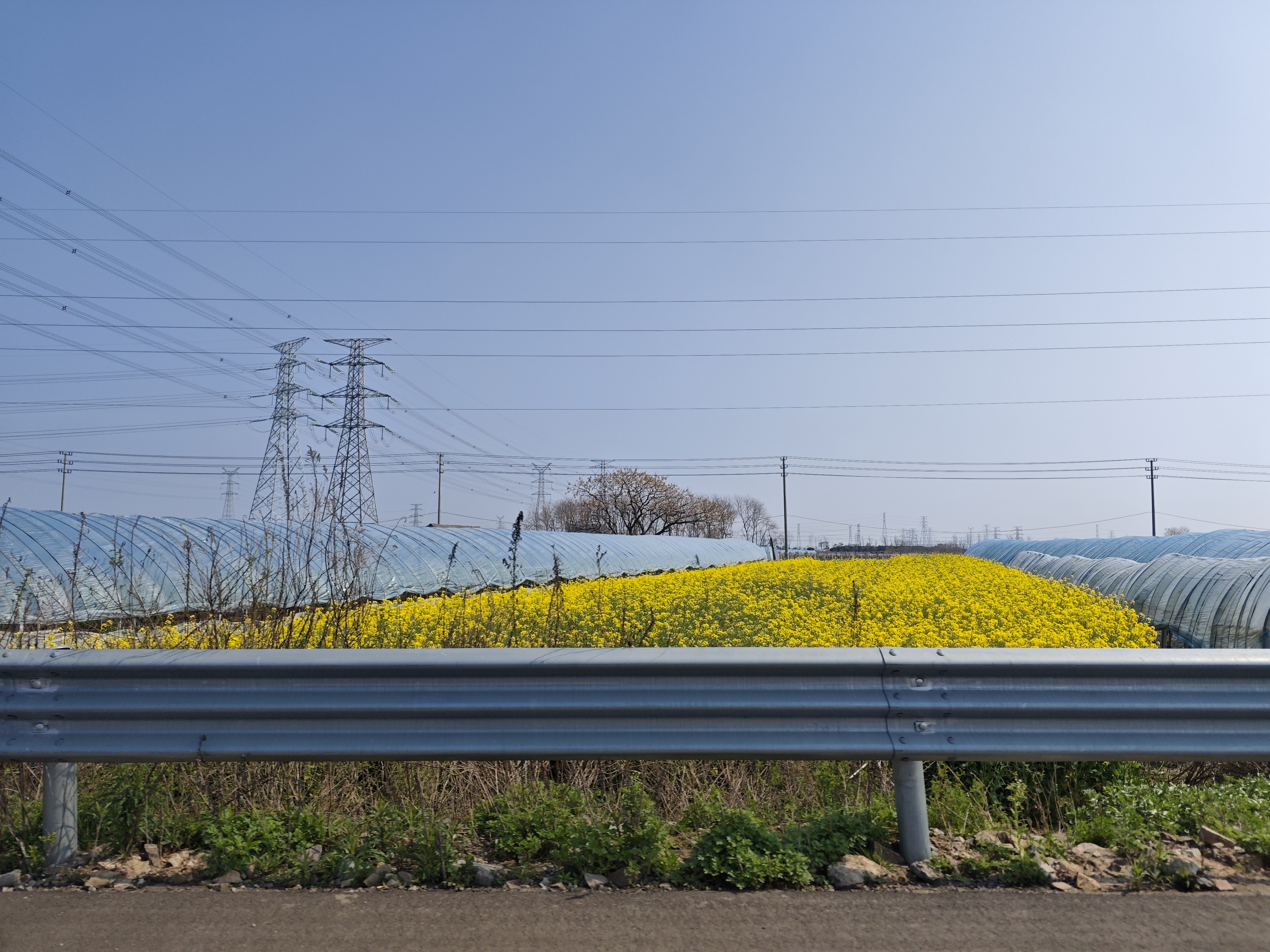 路畔春景 沿着公路徐行,春日的风掠过耳畔,裹挟着田野的气息。道路一侧,护栏如银带般延展,将车水马龙的喧嚣与另一侧的田园静美悄然分隔。 抬眼望去,蓝天澄澈如洗,几缕电线似琴弦横亘天际,高压电塔以钢铁之躯矗立,线条硬朗,却与周遭的柔美春景奇妙相融。近处,温室大棚如淡蓝的贝壳,错落排列,棚下绿意涌动,那是生命在暖室里蓬勃生长的模样。稍远处,金黄的油菜花田肆意铺展,像打翻的阳光,在风里漾起层层金波,与青绿的菜畦、疏落的树木交织成斑斓的织锦。 更有那形态各异的树木,有的枝繁叶茂,绿意葱茏;有的尚带枯瘦,却在枝头绽出新芽,似在与春天私语。偶见低矮的农舍,红瓦灰墙,静默伫立,仿佛是这片田园的守护者,见证着四季轮回、作物荣枯。 公路向前延伸,路灯整齐列队,似在指引方向,又似在守望这片土地的晨昏。远处的景物在日光下晕染开来,朦胧中透着生机,高压线塔的影子在地面拉长,与田间的阡陌、大棚的轮廓共同勾勒出一幅城乡交融的春日画卷。 这一路,城市的边缘与乡村的腹地在此衔接,工业的筋骨与自然的柔肠在此碰撞,而春天,便是那温柔的调和剂,让钢铁与泥土、喧嚣与宁静,都化作沿途醉人的风景,引着人,一步步走进这生机盎然的时节里。