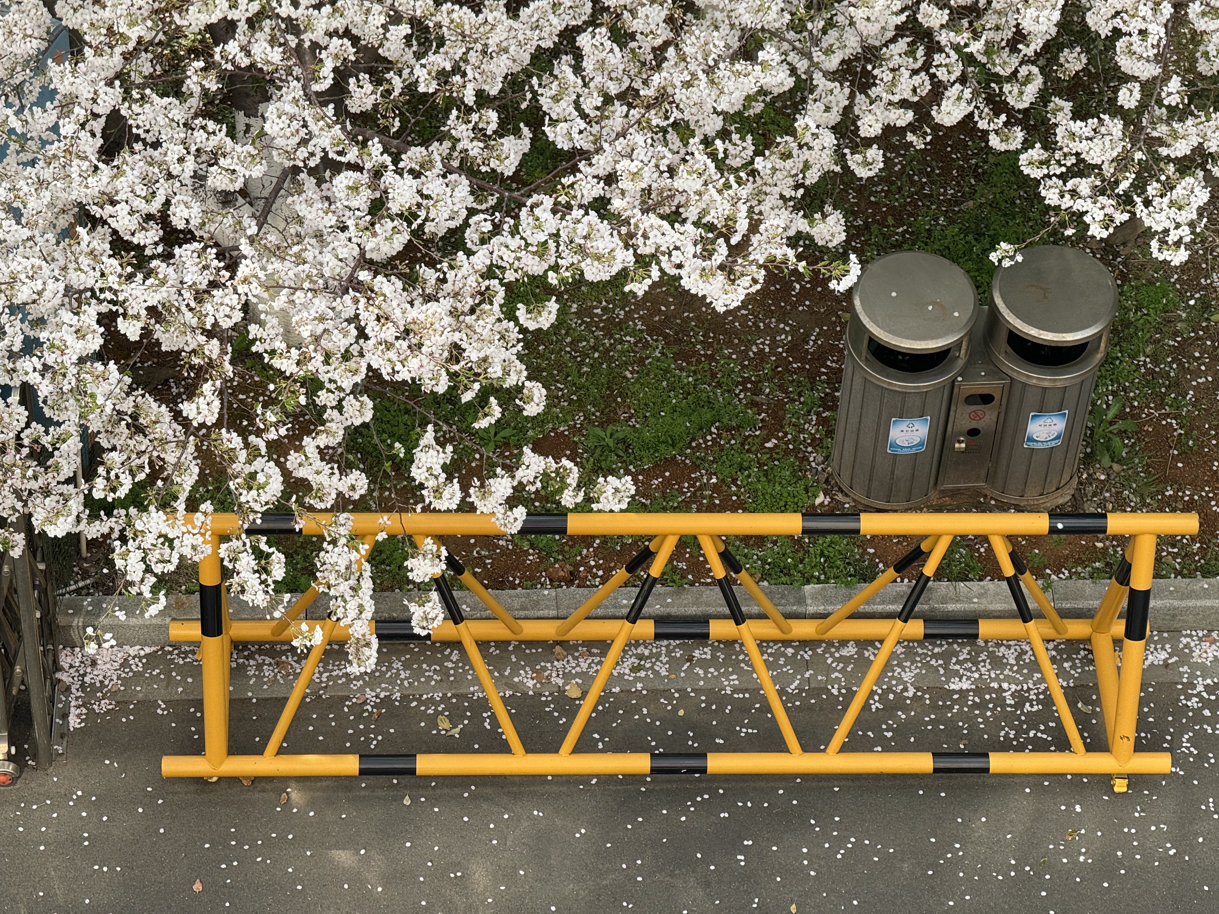 春之界碑 白色的雪,从枝头倾泻而下 不是冬的余寒,是春的絮语 在风里织成朦胧的网 黄黑相间的栏杆 横亘成一道沉默的界碑 将喧嚣的车辙,与静谧的花事 轻轻隔开 双筒的垃圾桶,立成金属的岛屿 在花影下,守着城市的呼吸 那些飘落的花瓣,是春的信笺 有的栖在栏上,有的吻过路面 终将归于泥土,或未知的远方 绿草在暗处铺展 承接花的坠落,也承接时光的轻响 这一刻,喧嚣被栏杆挡住 唯有花香,越过界限 在空气里,写满温柔的诗行