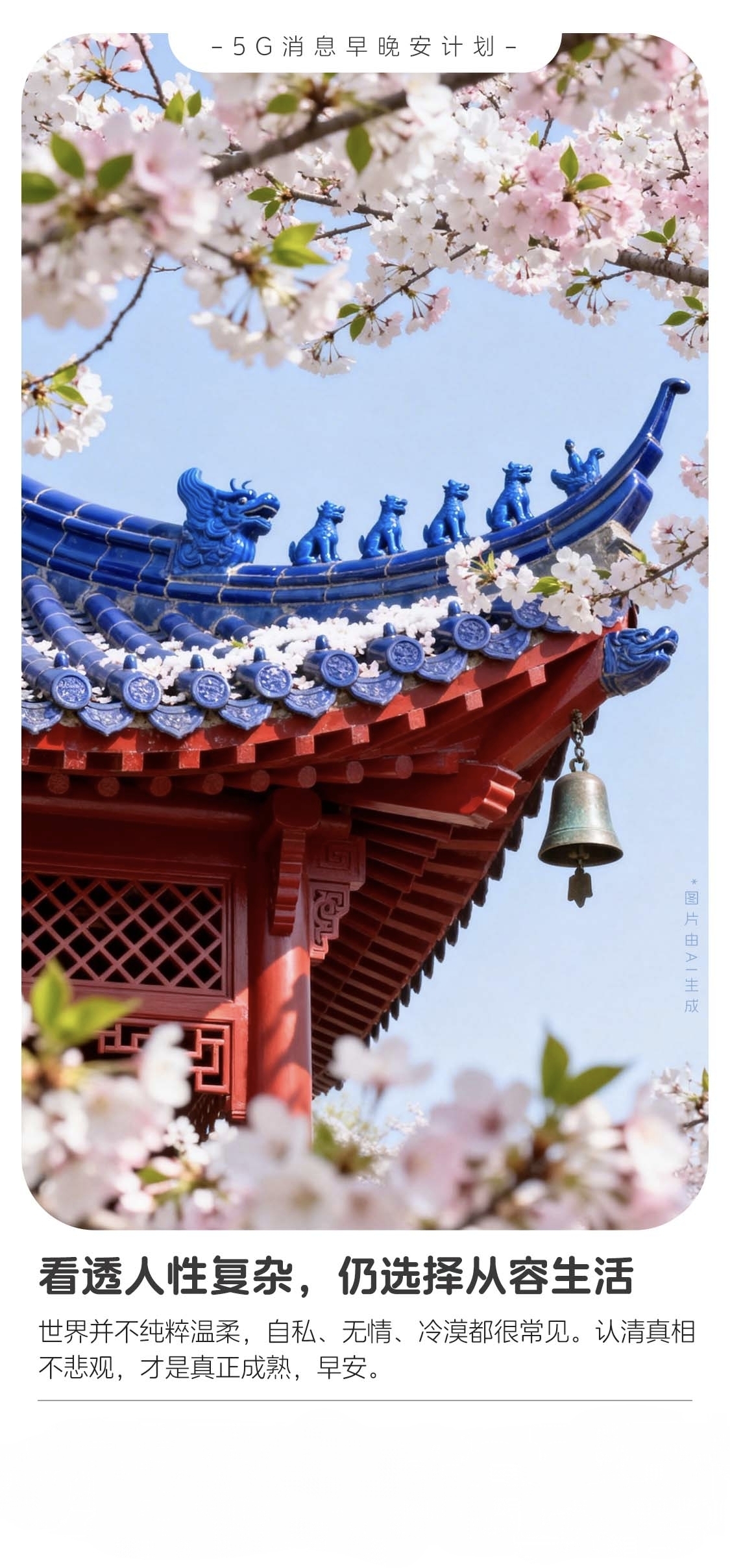 檐角铃语,樱雪人间 清晨的风掠过檐角,将一串樱花的碎梦抖落在琉璃瓦上。那座古雅的亭阁,以朱红的梁柱撑起一方天地,飞檐如青鸟展翅,衔着几缕淡蓝的天光。檐头的兽吻披着钴蓝的釉色,在晨雾里凝作静默的守护者,而檐下悬着的铜铃,正随着风的脚步,轻叩出细碎的清响——像谁在耳边低语,又像时光在檐角打了个盹。 樱花便在这时盛放了。粉白的花瓣簇拥着,从枝头垂落,有的栖在蓝瓦的棱线上,有的拂过朱红的窗棂,将古建的庄重晕染得温柔起来。风过时,花雨簌簌,落在檐角的兽吻肩头,也落在行人的肩头,仿佛整个世界都被这春日的私语包裹。那铜铃的震颤,混着花香与古意的余韵,在空气里织成一张朦胧的网,网住了时光的褶皱。 我们总在烟火人间奔走,见过自私的锋芒,触过冷漠的壁垒,可当目光落在这檐角的铃、枝头的樱时,忽然懂得:成熟不是对世界缴械投降,而是看透人性复杂的底色后,仍愿为一朵花的绽放驻足,为一声铃的轻响心动。就像这古亭,任岁月在瓦当刻下斑驳,仍以朱红的姿态迎向春风;就像这樱花,明知花期短暂,却倾尽所有,把芬芳揉进每一缕风里。 世界或许不够纯粹温柔,可我们仍可以选择从容。看檐角兽吻凝视人间百态,听铜铃摇落满袖清风,让樱花的温柔住进心底,在认清生活的真相后,依然热爱,依然从容。毕竟,真正的成熟,是带着对世界的清醒认知,奔赴每一个鲜活的清晨——就像此刻,铃音未歇,樱雪正盛,而我们要做的,不过是深吸一口气,把这份从容揣进衣兜,走向属于自己的人间。(图源中国移动)
