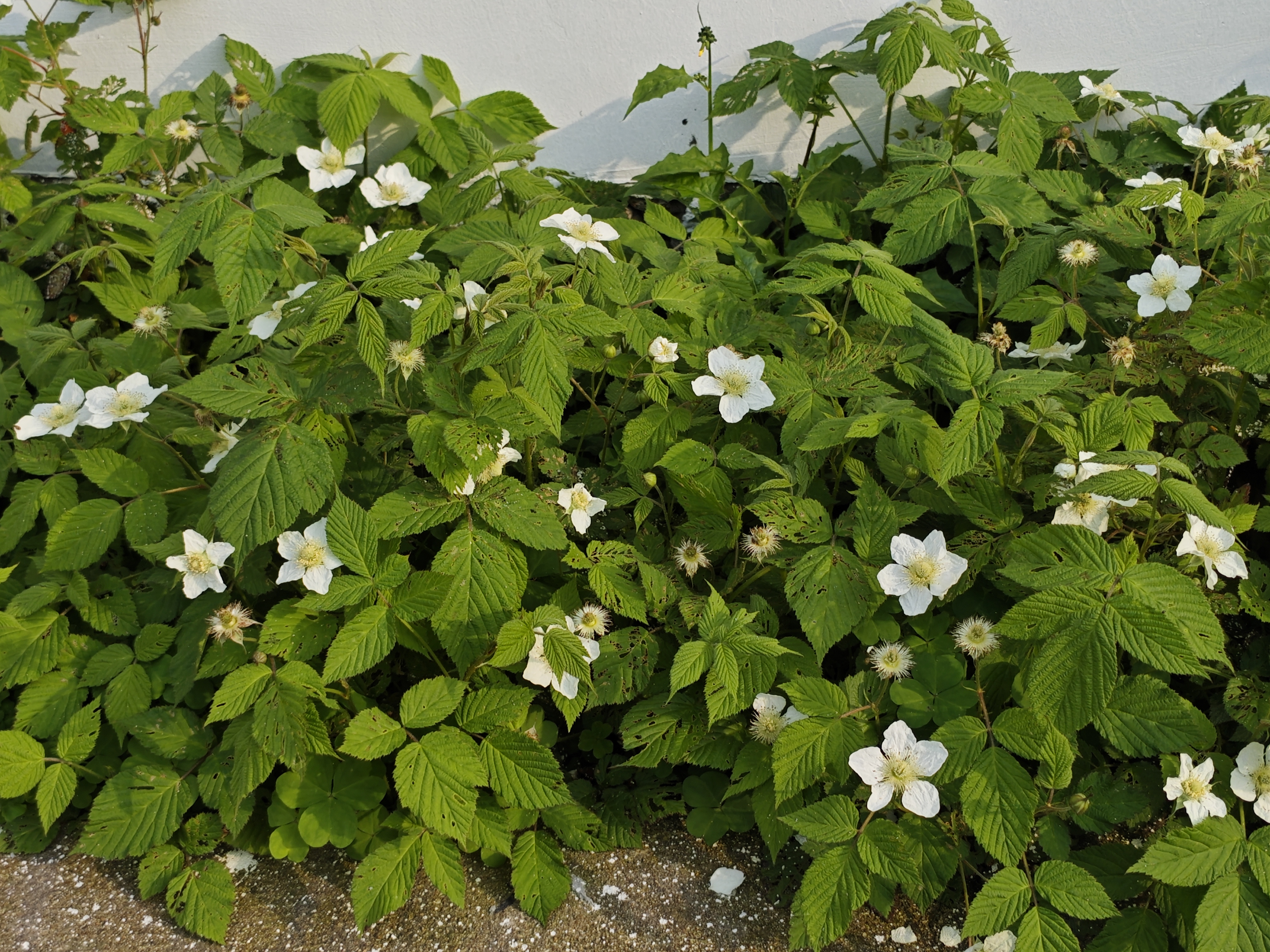 小院墙根的野莓丛,开得泼泼洒洒。白的瓣、绿的掌,在白墙前铺成蓬勃的浪。有些花谢了,结成蓬松的果托,像给大地缀了些绒绒的星子。风掠过,叶与花便低语,说着从抽芽到绽放的故事,每一片叶的舒展,每一朵花的盛开,都是生命在时光里的郑重签名。