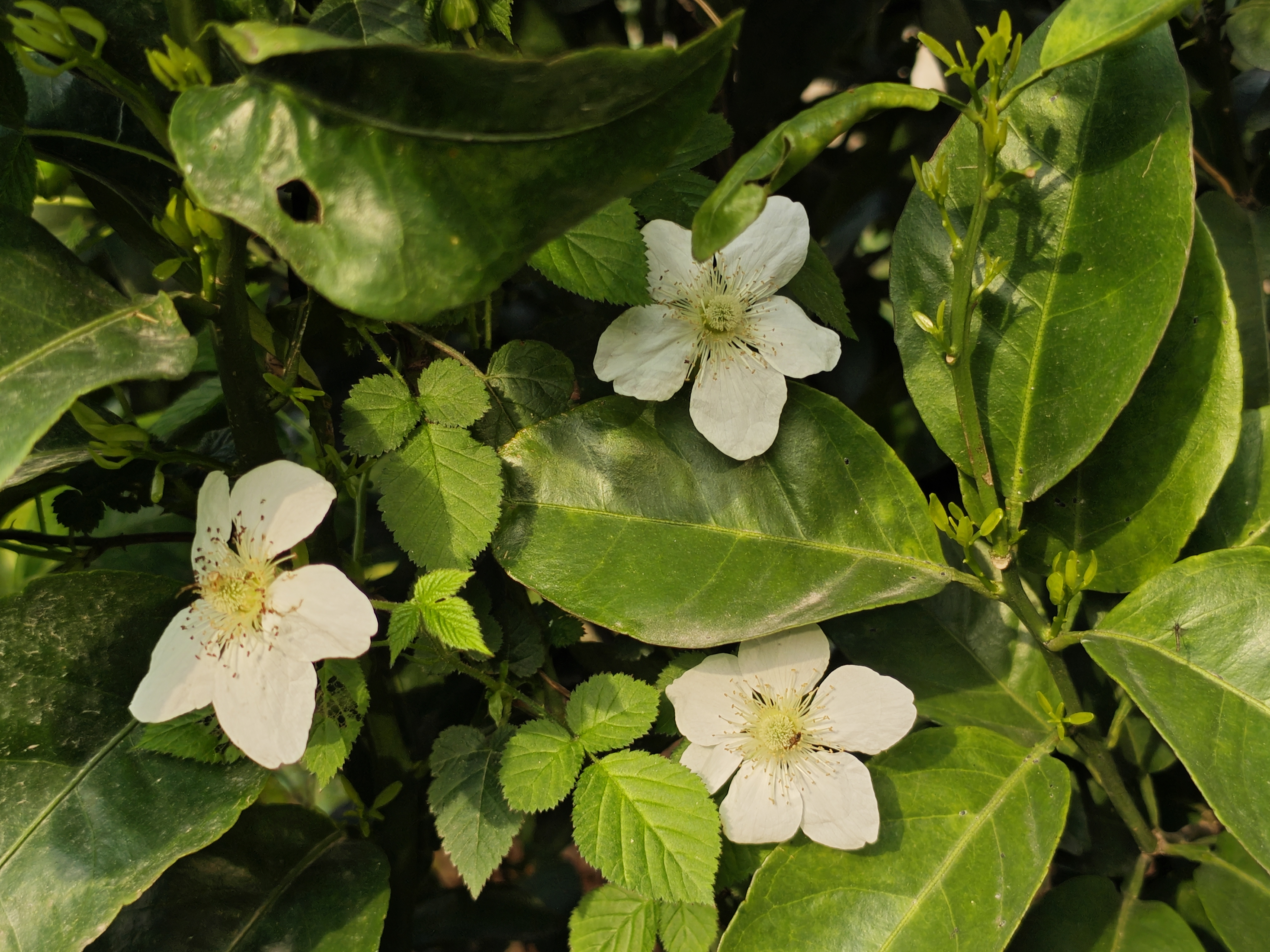 藤蔓攀着柑橘树的刹那,野莓的花便落了进来。五瓣的白,像雪裁成的蝶,栖在油绿的叶间。细蕊轻颤,风过时便抖落些甜香,引了蜜蜂来,在光影里织一场蜜色的梦。后来,这些花结了果,毛茸茸的小团子藏在叶后,像藏着无数个小小的惊喜,等一场熟透的甜,把夏日的余温酿成紫黑的浆。