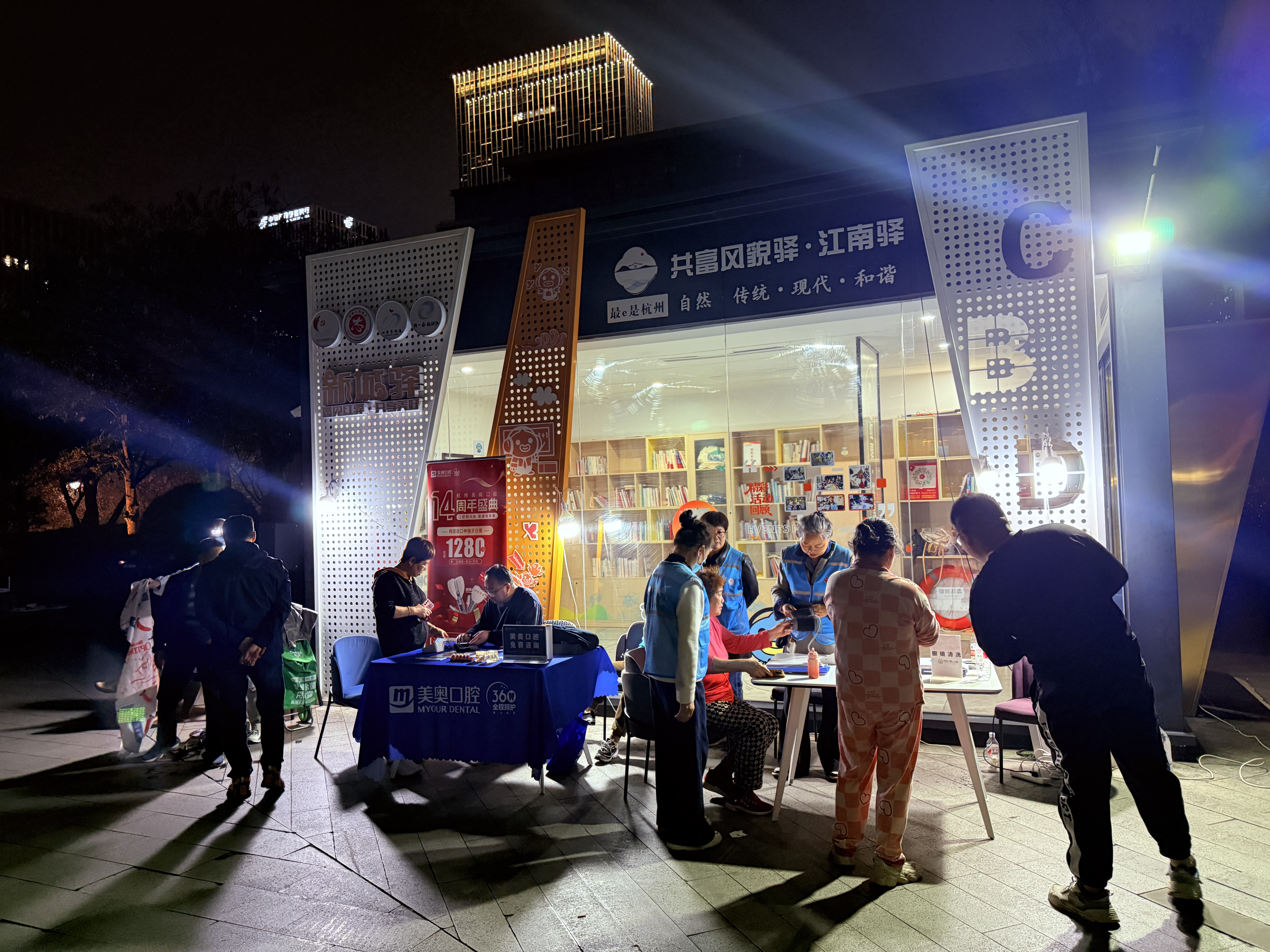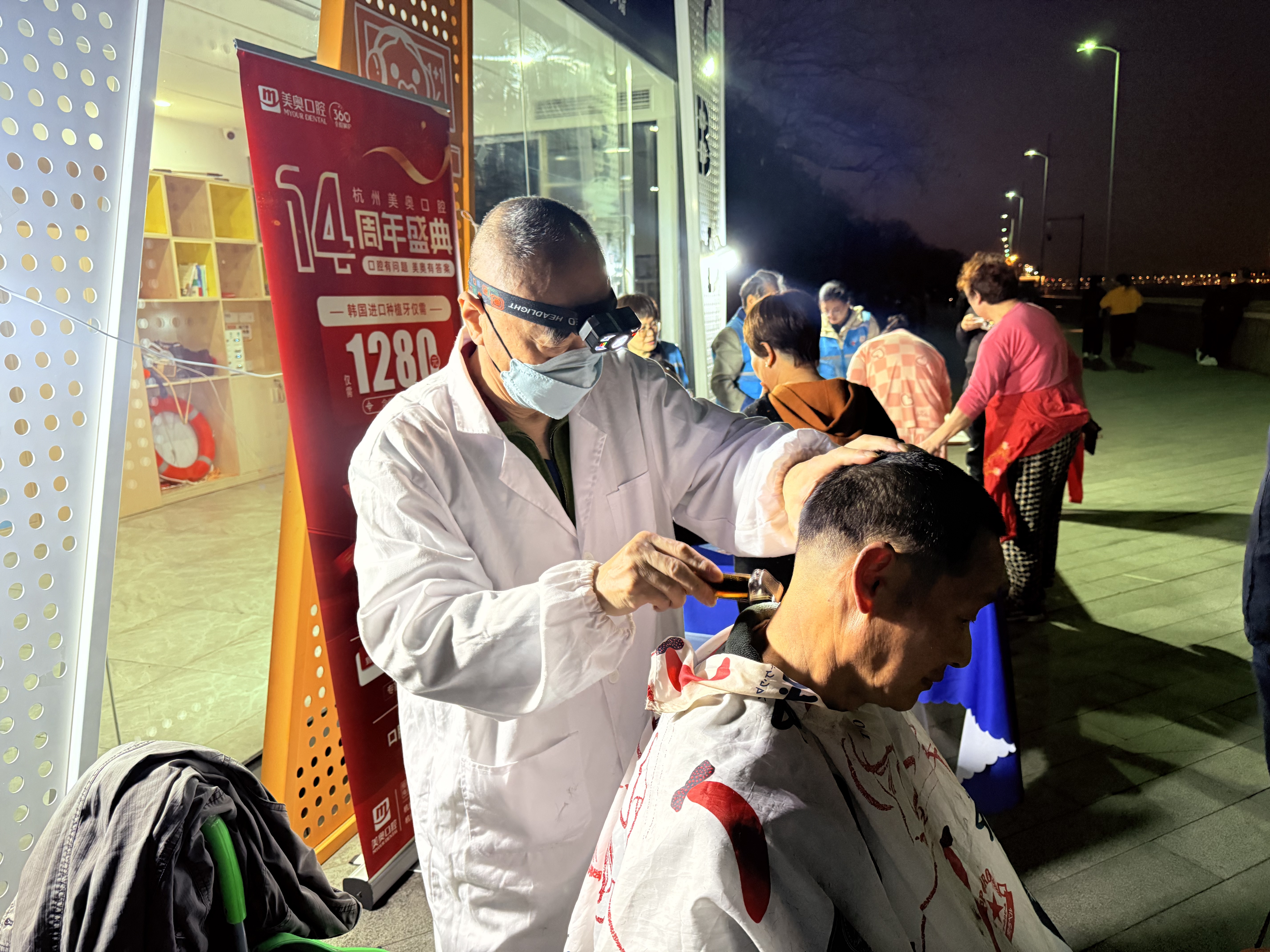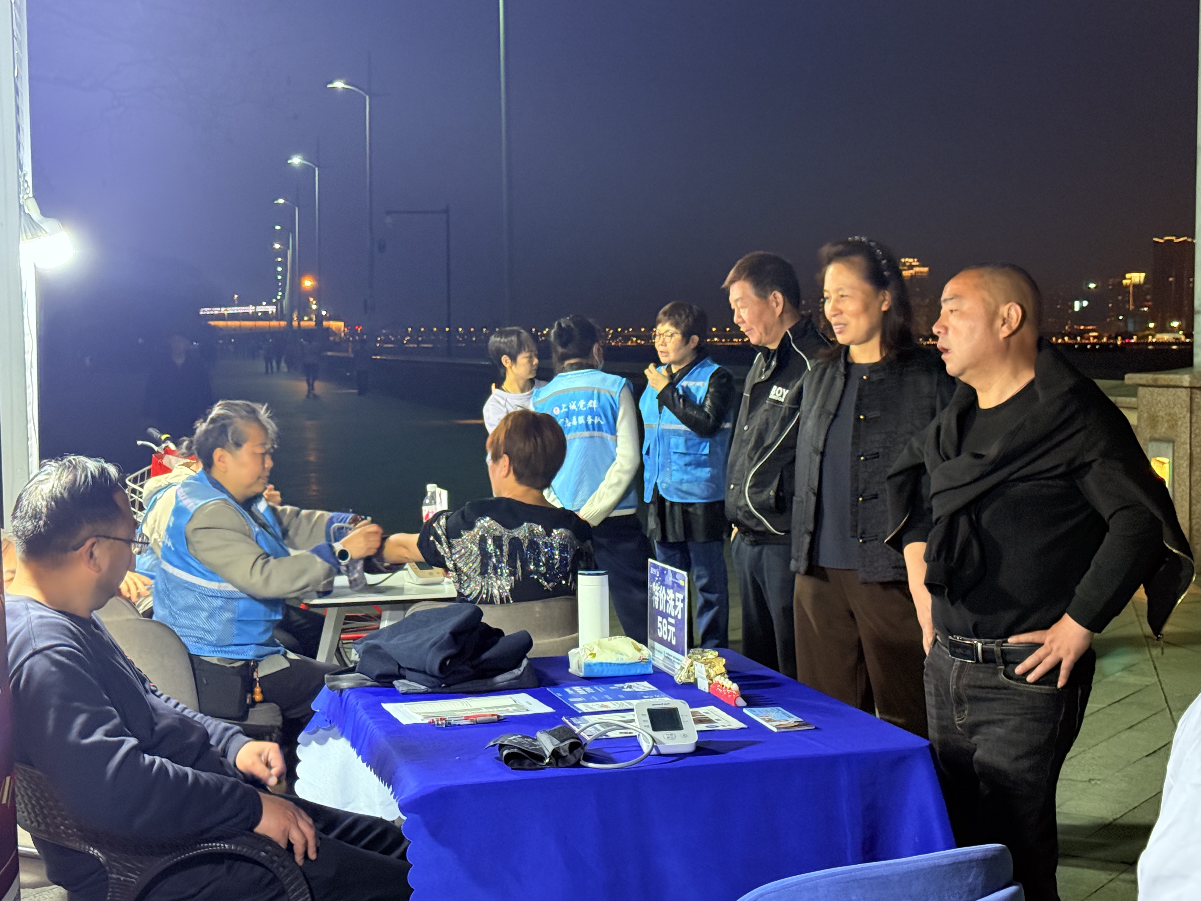 杭州夜色真美,钱塘江畔新城驿站门前,四叶草公益组织的志愿者身着蓝马甲忙不停~理发、中医推拿、口腔义诊、眼镜清洗、量血压等超暖心,雷锋月就该这样过!