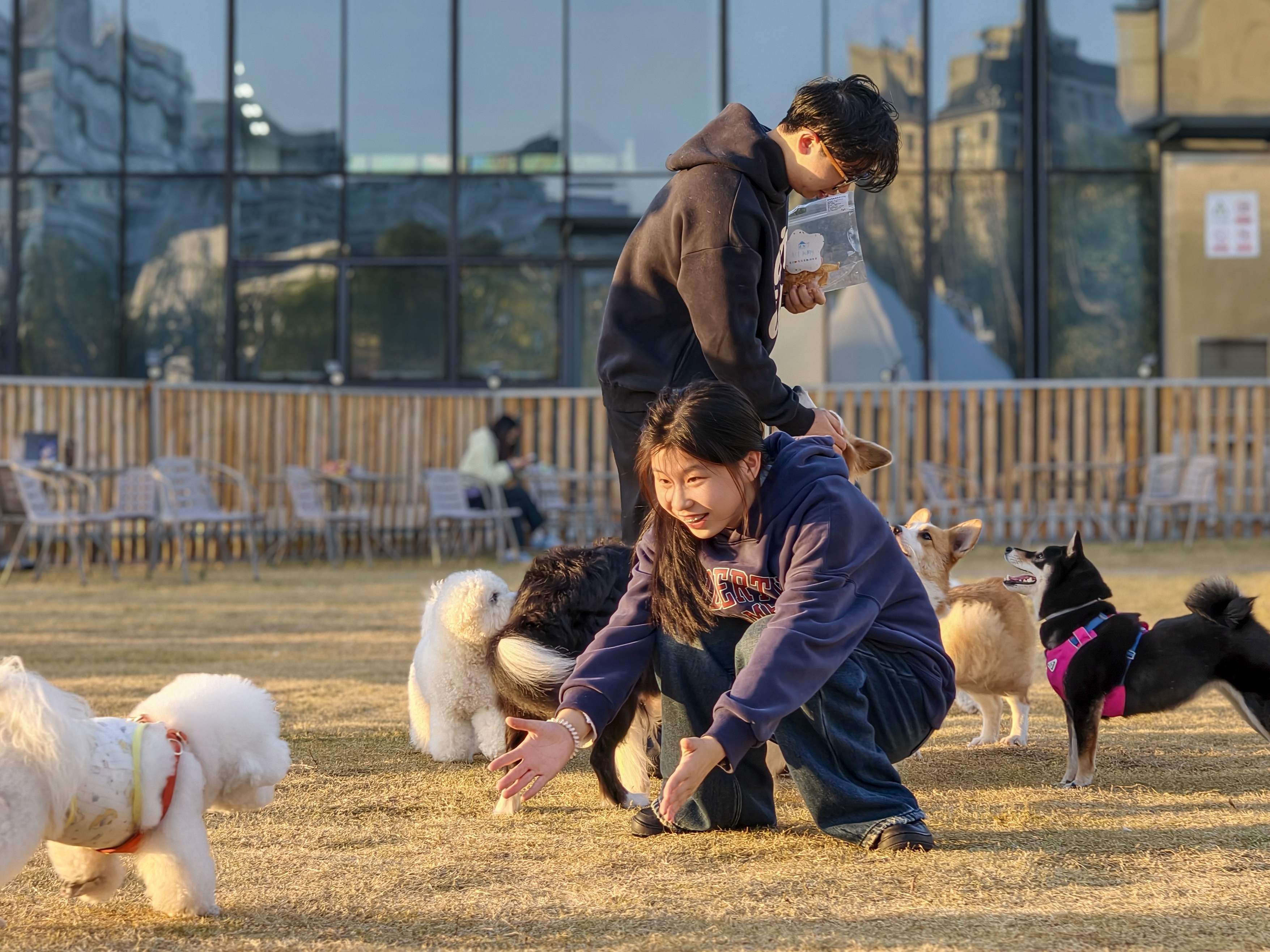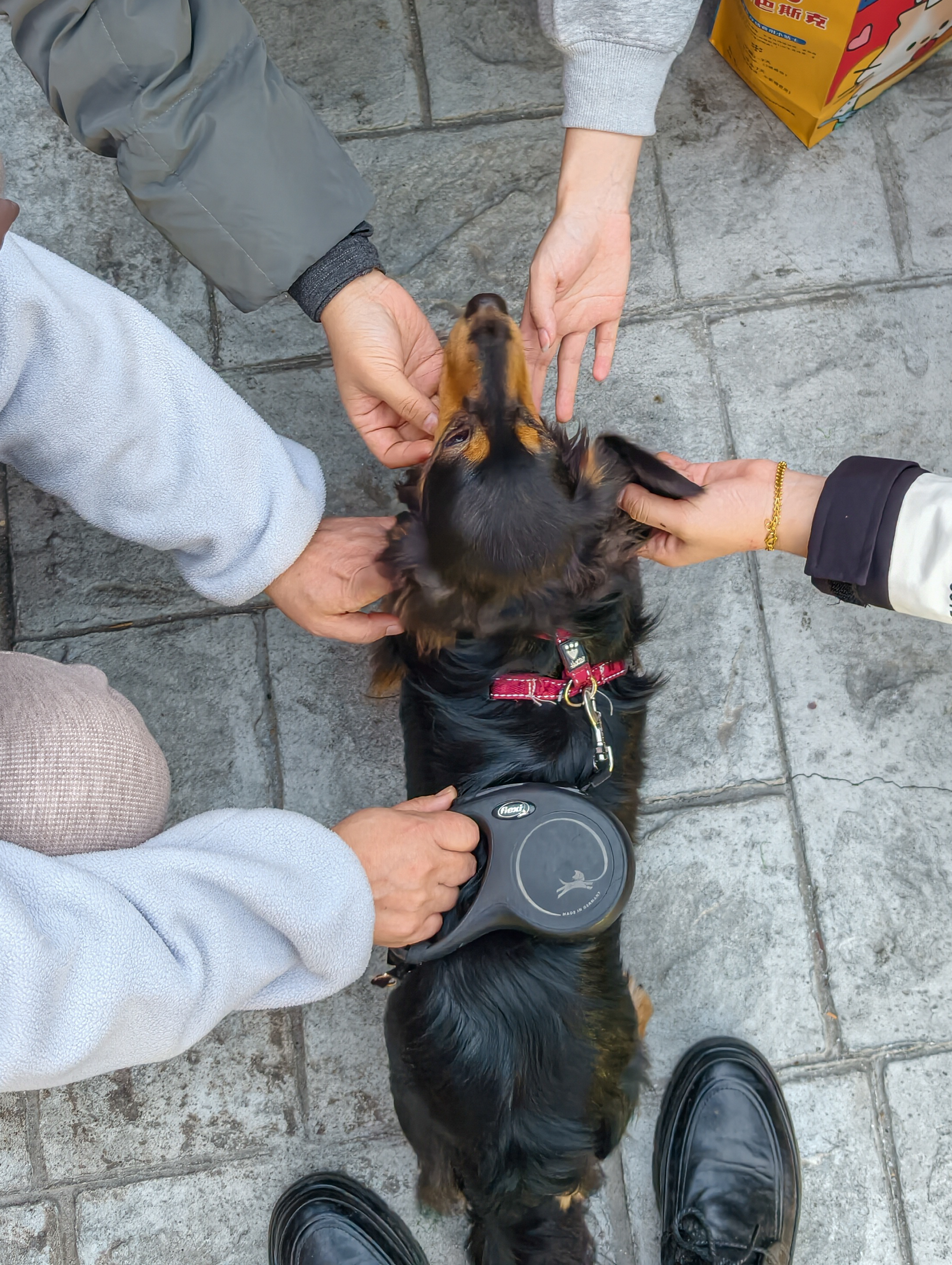 《撸狗》:几个年轻人被可爱的腊肠狗狗吸引,纷纷蹲下身子撸狗。