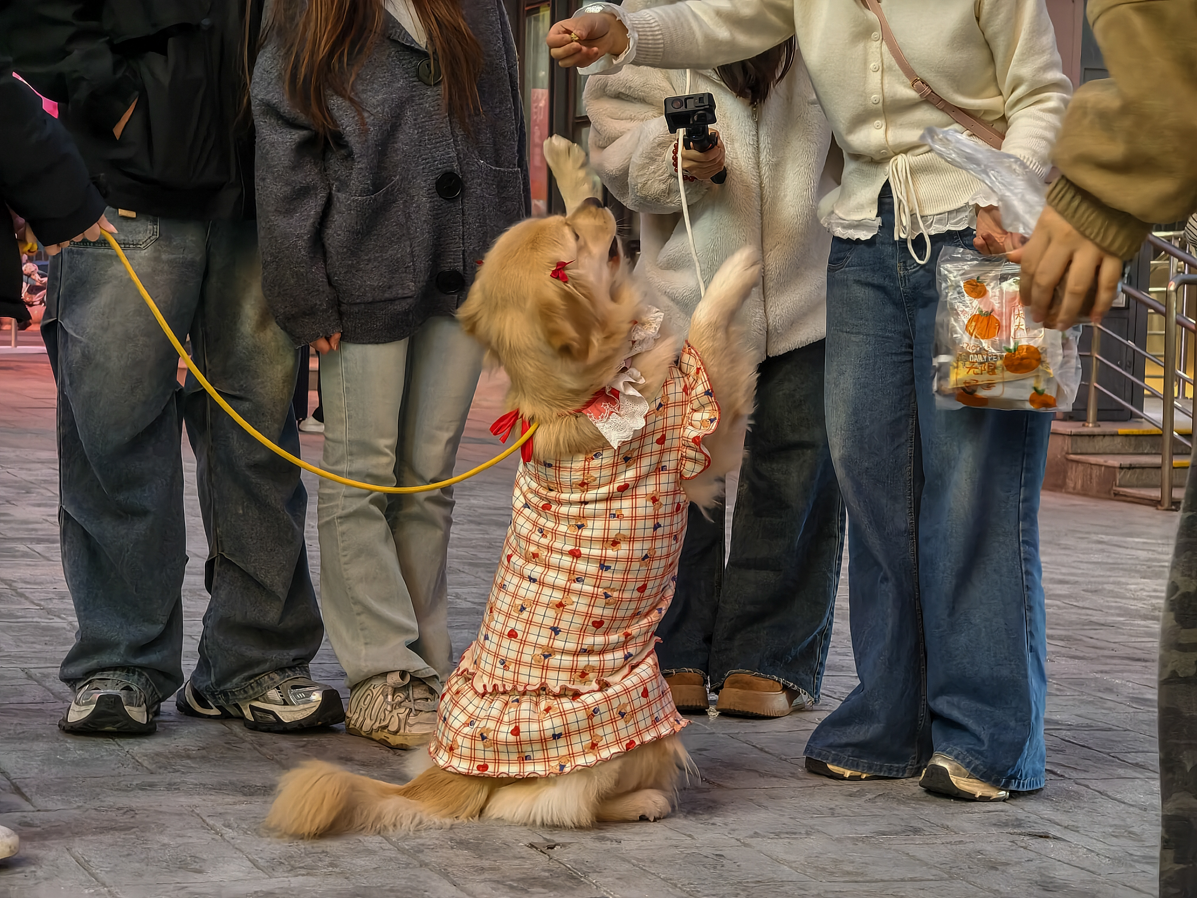 《才艺秀》:宁波某商场广场,一群年轻人正在看金毛犬表演才艺。