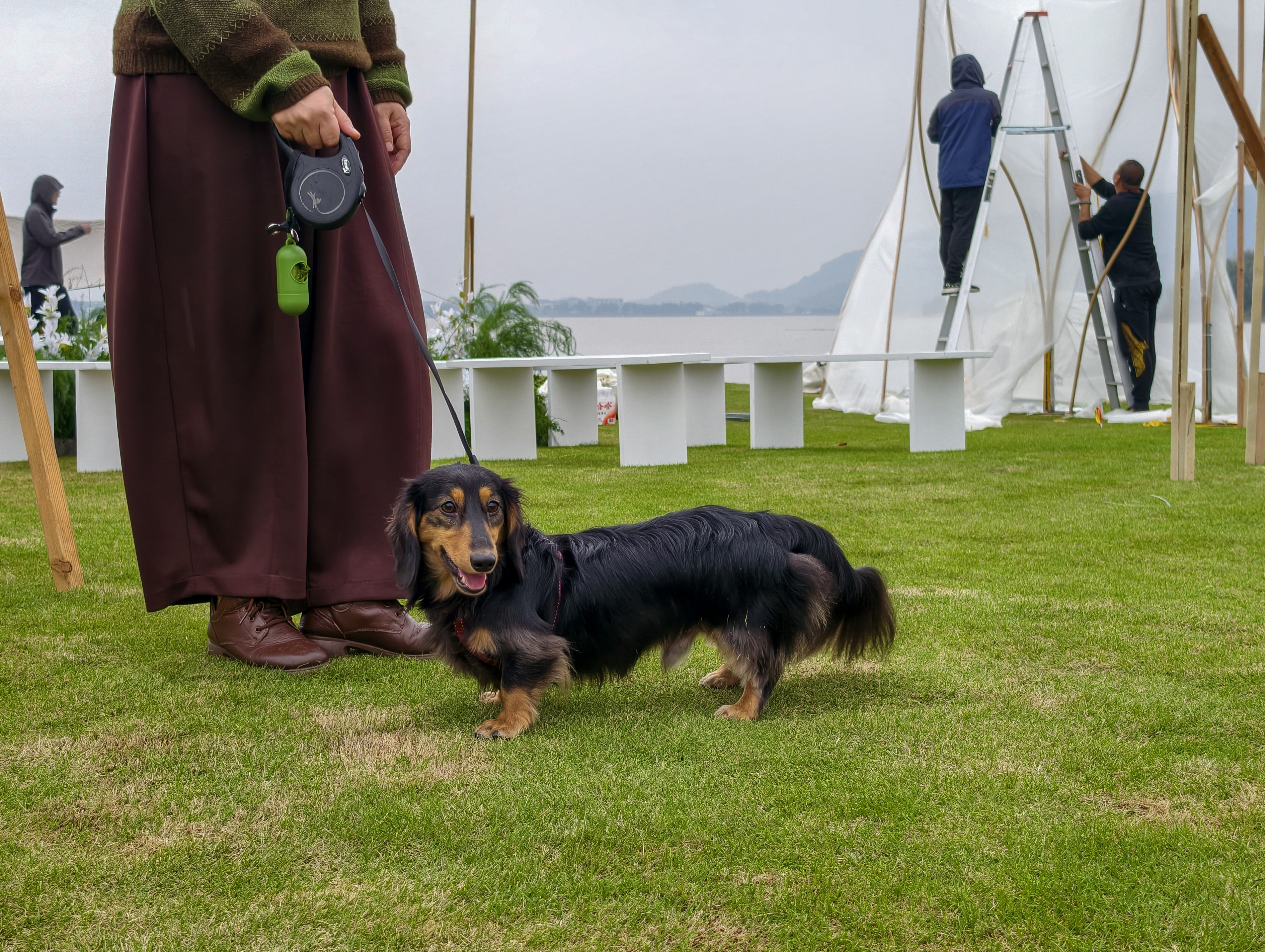 《遛弯》草坪婚礼上的腊肠犬。