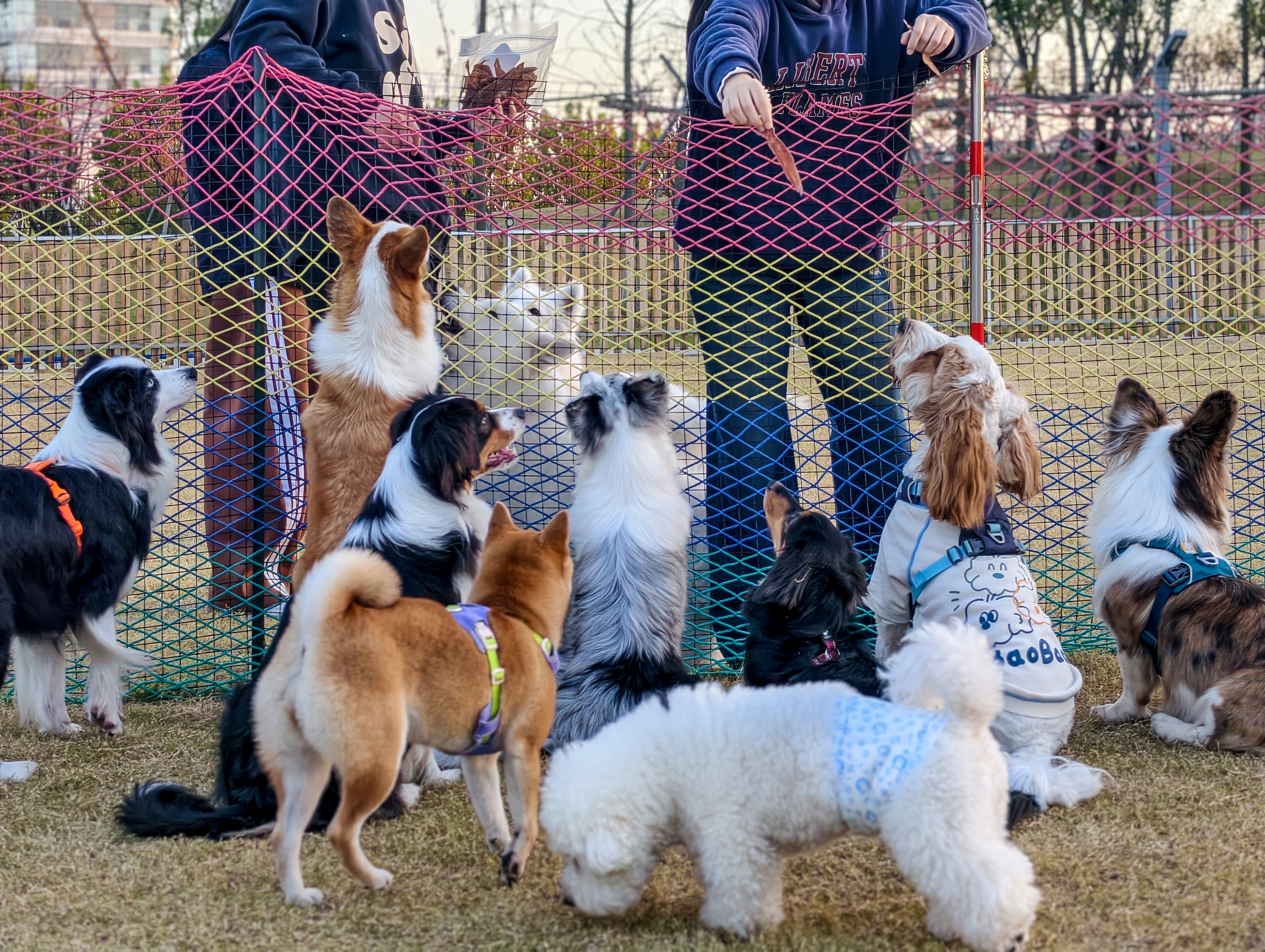 《我也要》:宠物乐园里,一群狗狗围着两个游客讨吃的。