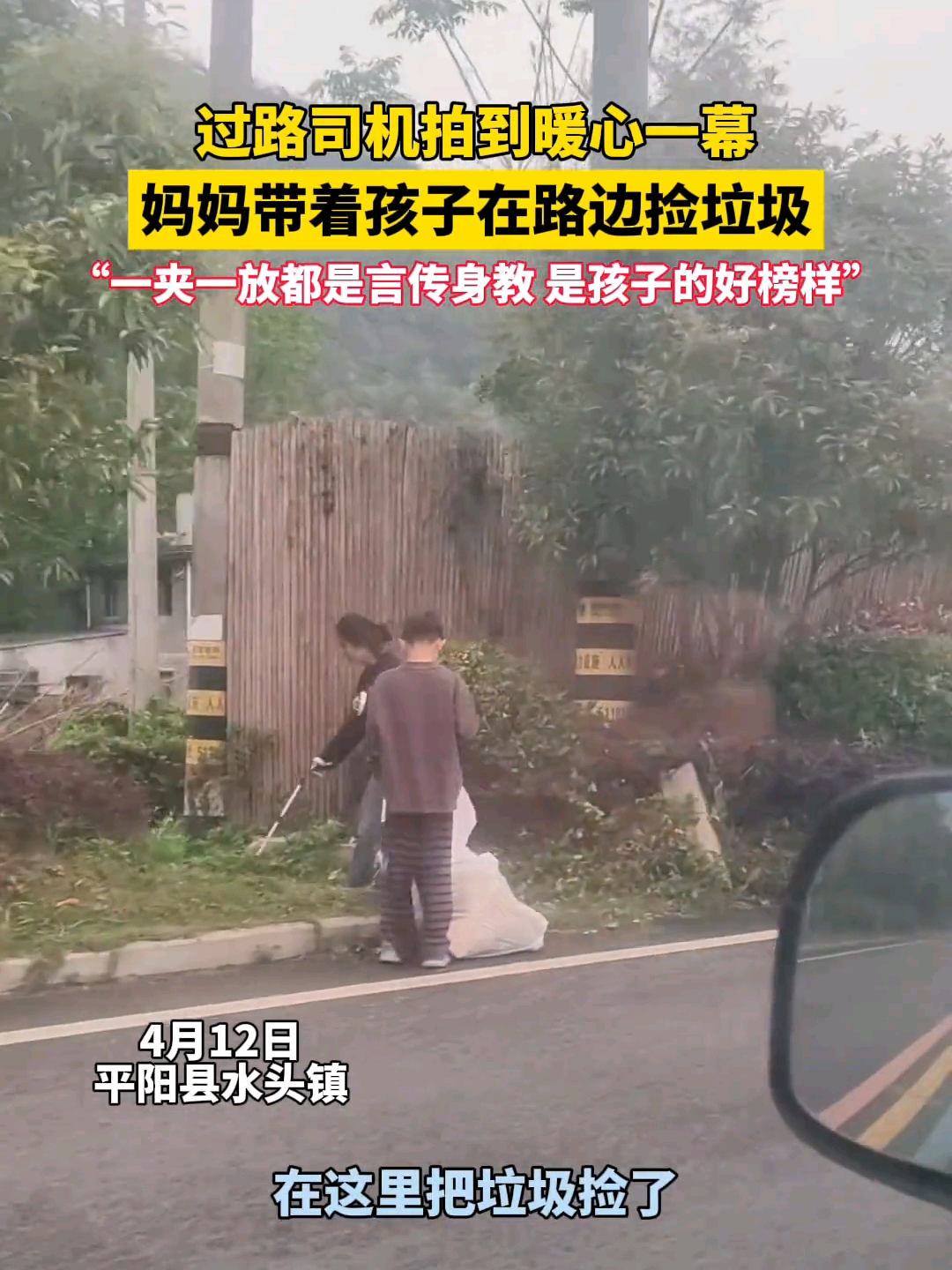 过路司机拍到暖心一幕,妈妈带着孩子在路边捡垃圾,“一夹一放都是言传身教 是孩子的好榜样”。