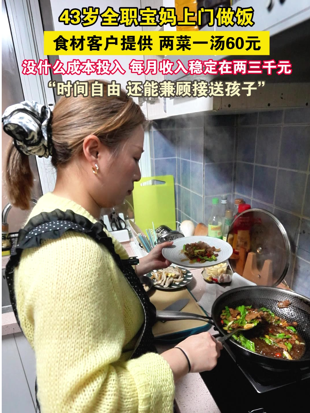 平湖43岁全职宝妈上门做饭,食材客户提供,两菜一汤60元。没什么成本投入,每月收入稳定在两三千元。“时间自由,还能兼顾接送孩子”