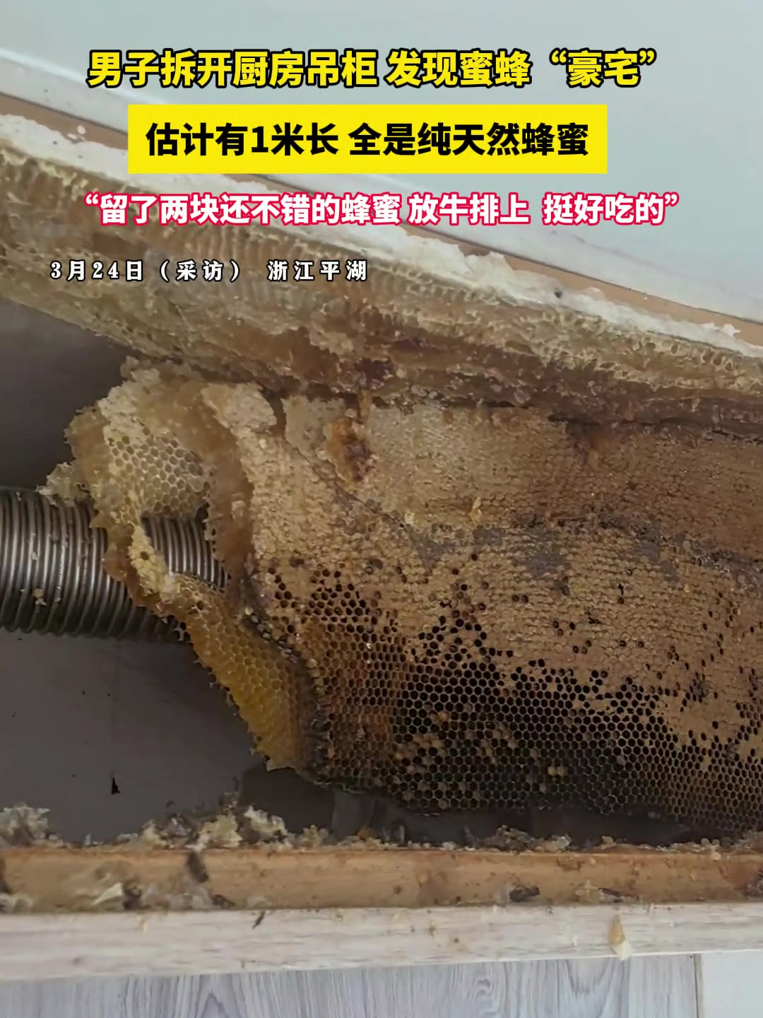 平湖男子拆开厨房吊柜,发现蜜蜂“豪宅” 估计有1米长,全是纯天然蜂蜜!“留了两块还不错的蜂蜜,放牛排上挺好吃的”