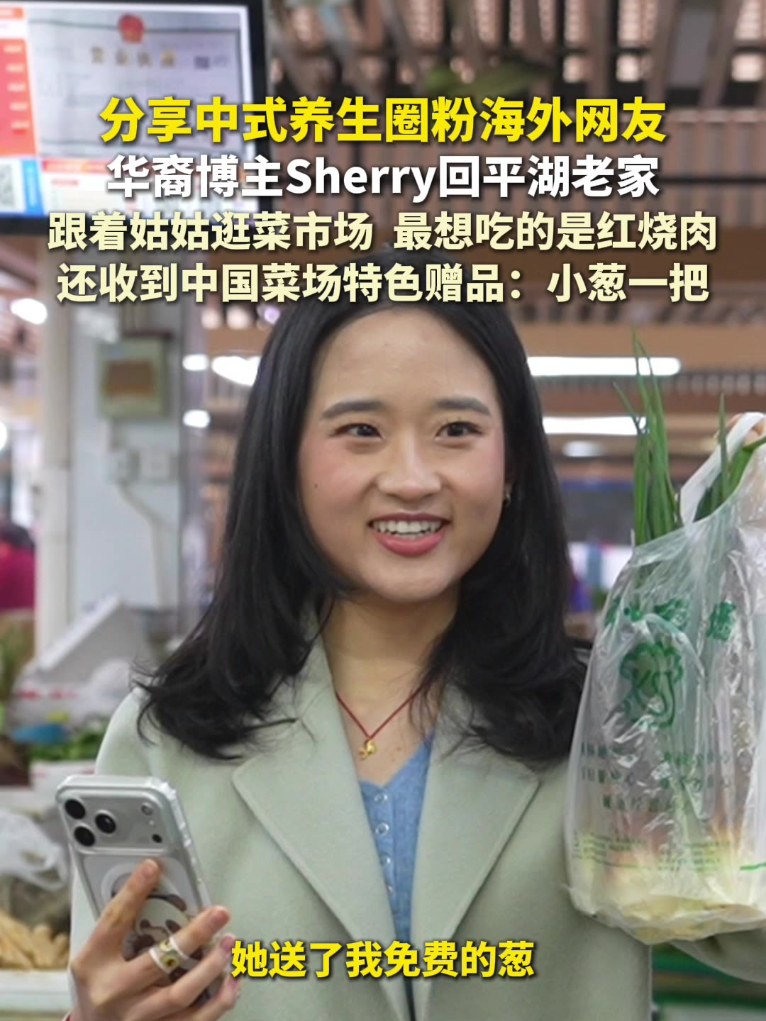 分享中式养生圈粉海外网友的华裔博主Sherry回平湖老家,跟着姑姑逛菜市场 ,最想吃的是红烧肉,还收到中国菜场特色赠品:小葱一把