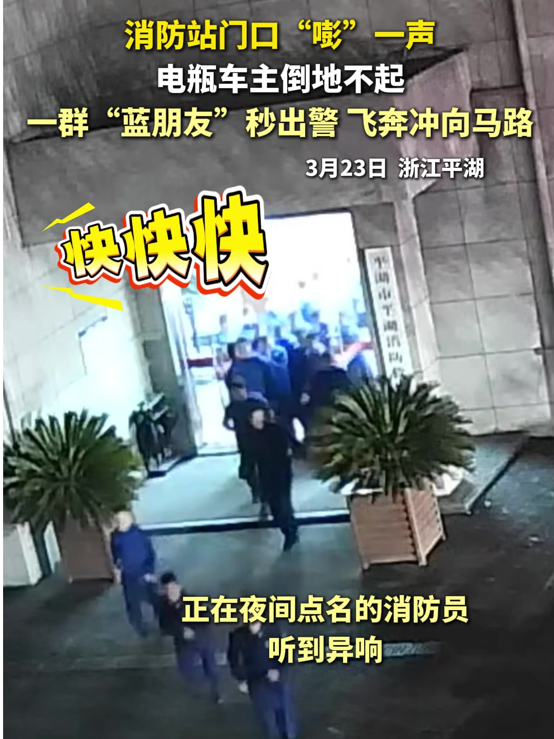 平湖消防站门口“嘭”一声,电瓶车主倒地不起,一群“蓝朋友”秒出警,飞奔冲向马路