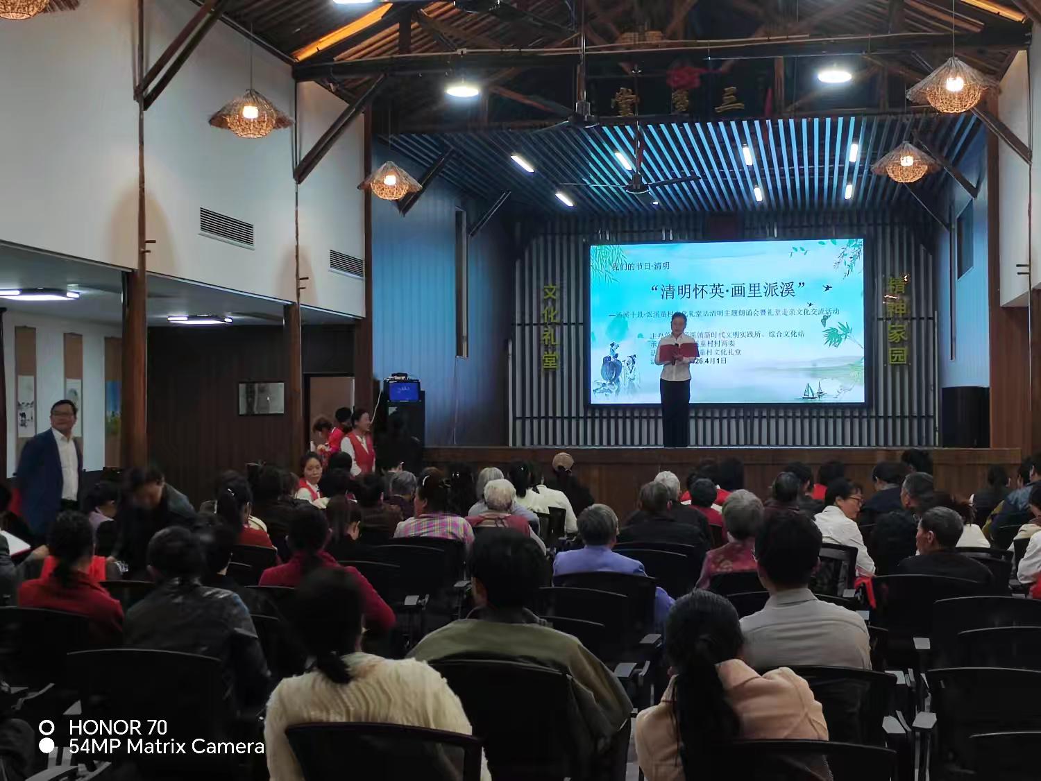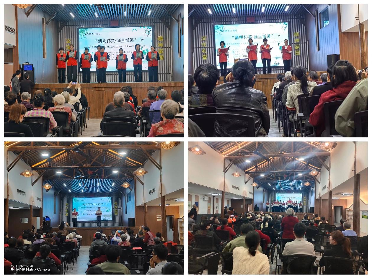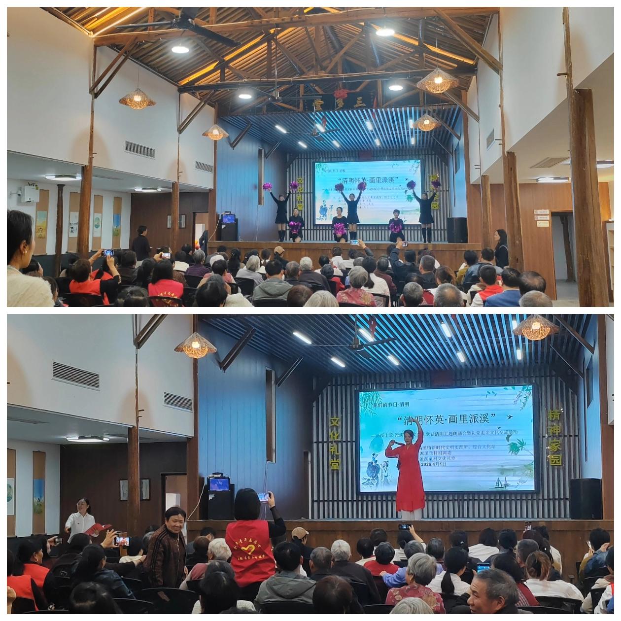 「金开有礼」我们的节日·清明|清明怀英·画里派溪 主题朗诵会暨礼堂走亲文化交流活动圆满举办 梨花风起正清明,追思怀远祭英魂。在清明节来临之际,为深切缅怀革命英烈的不朽功勋,赓续传承中华优秀传统文化与红色文脉,进一步推动礼堂走亲文化交流活动走深走实,“我们的节日·清明——‘清明怀英·画里派溪’”主题朗诵会暨礼堂走亲文化交流活动温情举办并圆满落幕。本次活动紧扣清明缅怀英烈、传承文脉的核心主旨,精心搭建文化交流平台。所有参演节目均由中戴、黄堂、东祝、厚大、汤溪各管理处择优推荐。 文艺展演环节精彩纷呈,尽显本土文化风采与新时代精神风貌。舞蹈《中国最精彩》舞姿灵动,尽显昂扬朝气;《万疆》气势恢宏,抒发对祖国的赤诚热爱;经典红歌《洪湖水浪打浪》旋律悠扬,唤起浓浓红色记忆;婺剧选段戏韵婉转,尽显传统戏曲独特魅力;更有方言歌曲等节目,接地气、有温度,赢得现场阵阵喝彩。此次活动以清明为纽带,以文化礼堂为桥梁,既让传统节日文化深入人心,又深化了各管理处之间的文化交流,丰富了群众精神文化生活。未来,也将持续开展各类文化交流活动,让文化礼堂焕发新活力,让乡土文化薪火相传。