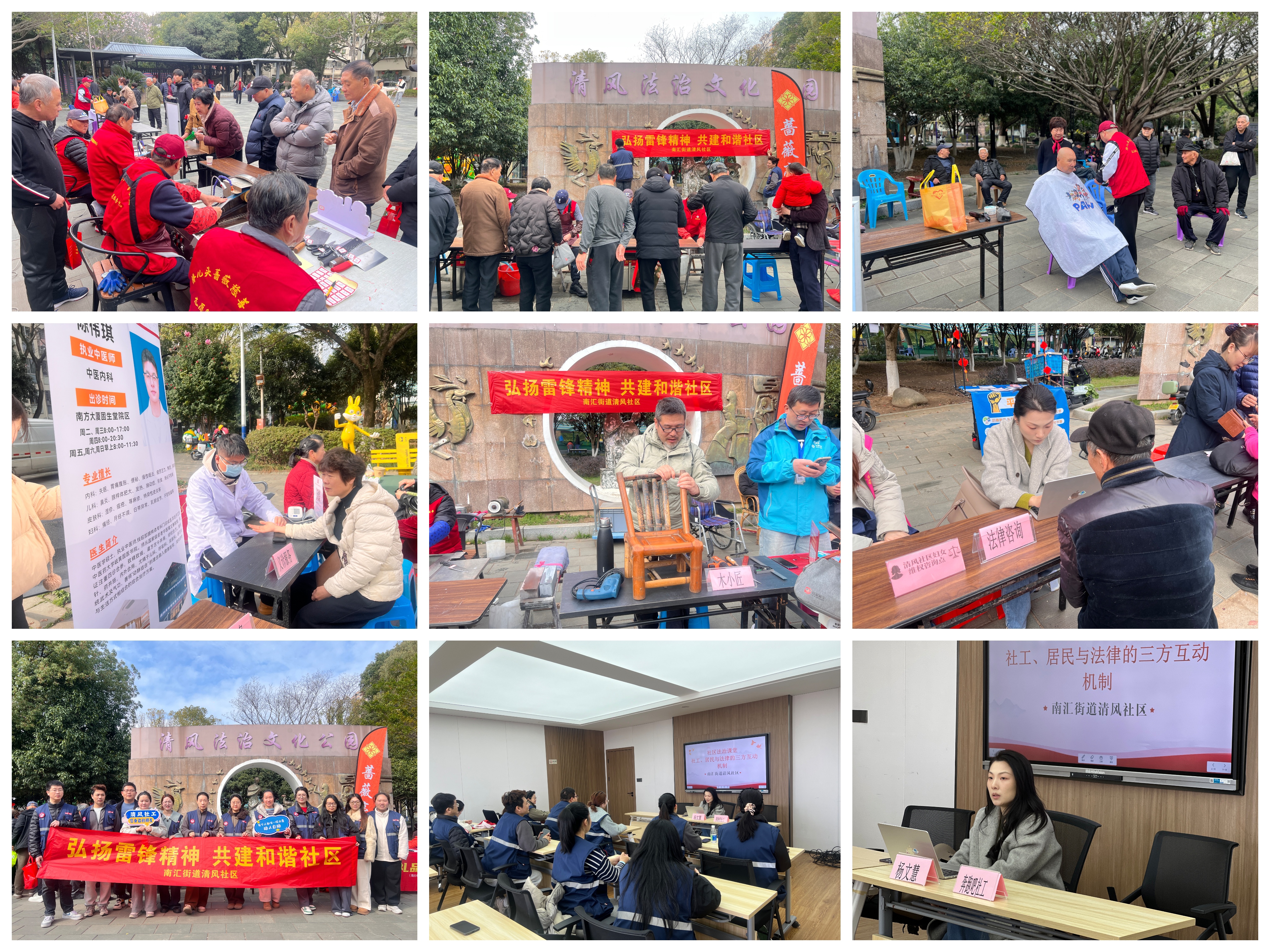 【弘扬雷锋精神,共建和谐社区 清风社区开展“奔跑吧社工·清风服务月”志愿服务活动】 为传承雷锋精神,践行志愿服务理念,清风社区以“奔跑吧社工·清风服务月”为载体,在下吕浦三区法治公园开展志愿服务日活动,将便民服务送到居民家门口。活动现场,工作人员耐心讲解消费维权知识;驻社区律师杨文慧设立法律咨询台,针对房产继承、邻里纠纷等问题提供专业指导。“蔷薇亭”服务区内,公益磨刀摊位前排起长队,师傅熟练操作让旧刀重焕锋利,居民连连称赞。“清风木小匠”志愿队俯身为居民修理桌椅板凳,传递绿色环保理念。中医、口腔义诊台前,医护人员细致测量血压、解答健康疑问;爱心义剪团队为长者免费理发,精湛手艺赢得一致好评。活动结束后,特邀杨文慧律师为清风社区全体社工开展专题培训,围绕家庭矛盾、物业纠纷等案例,结合法律实务与沟通技巧深入讲解,助力提升社区治理专业能力。本次活动通过便民服务与专业培训相结合,既满足了居民多元需求,又强化了社工队伍素养,让雷锋精神在细微处发光、在行动中传承。清风社区将继续以群众需求为导向,共建和谐幸福家园。