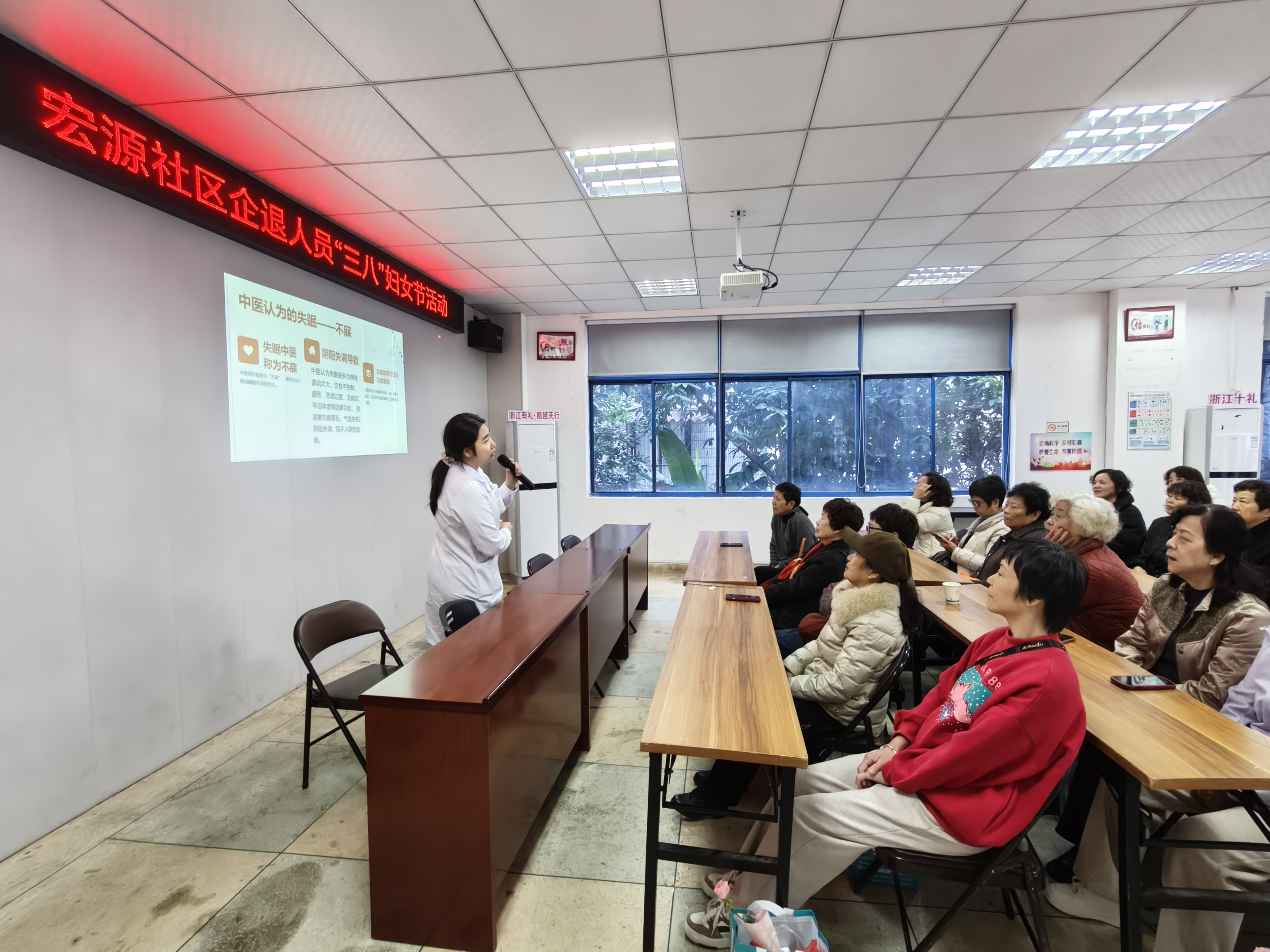 有礼日历 | 滨江街道宏源社区开展“养护睡眠健康·呵护最美的你” ——中医睡眠健康讲座 为庆祝“三八”国际妇女节,关注社区中老年女性睡眠健康,3月6日上午,温州市鹿城区滨江街道宏源社区特邀洪殿社区卫生服务中心中医科执业中医师方旭聪开展以“养护睡眠健康·呵护最美的你”为主题的老年人失眠中医保健专题健康讲座。本次讲座通过专业指导与暖心互动,帮助50余名阿姨们破解睡眠难题,送上节日健康关怀。 讲座中,方旭聪中医师针对老年群体常见的入睡困难、易醒早醒等问题,结合中医理论深入解析成因。多与脏腑功能衰退、气血不足、阴阳失调、情志不畅相关;分享安全无副作用的中医调理方式,包括穴位按摩(如安眠穴、神门穴、涌泉穴)、食疗药膳、中药代茶饮、情志调摄等简便易行的居家保健方法;科普老年人睡眠误区,纠正不良睡眠习惯,指导科学的作息规律与睡眠环境营造。 同时,现场还将设置互动答疑环节,中医师一对一解答老年朋友关于睡眠、养生的疑问,提供个性化调理建议。“原来失眠不能光靠数羊!今天学的按摩手法回家就试试!”居民刘阿姨边记录边感叹,其他阿姨也纷纷举手提问,专家逐一耐心解答。讲座结束后,社区工作人员还为每位阿姨递上一支淡粉色康乃馨和“助眠礼包”。 睡眠好,精神足,晚年乐。本次活动是宏源社区“银龄健康工程”的重要实践,旨在帮助老年人树立科学的睡眠养生观念,掌握实用的中医助眠技巧,从根源上改善失眠困扰,以平和的状态、健康的体魄安享幸福晚年。后续,宏源社区将持续开展各类中医养生保健活动,守护老年群体身心健康,为夕阳生活保驾护航。