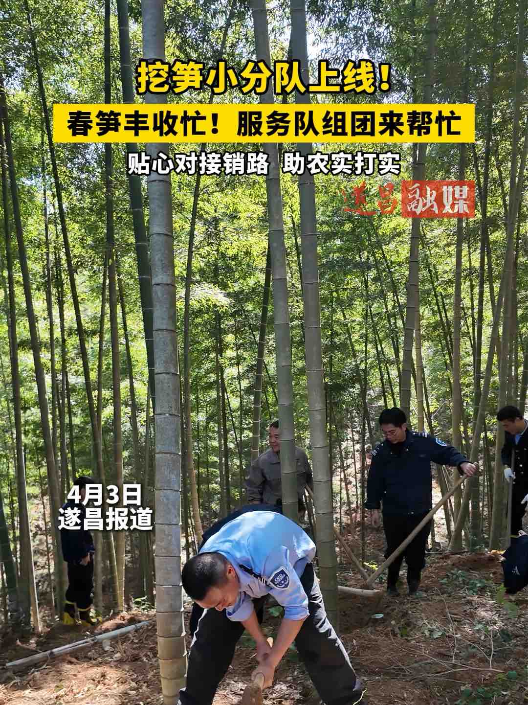 挖笋小分队上线!春笋丰收忙,服务队组团来帮忙。贴心对接销路,助农实打实。