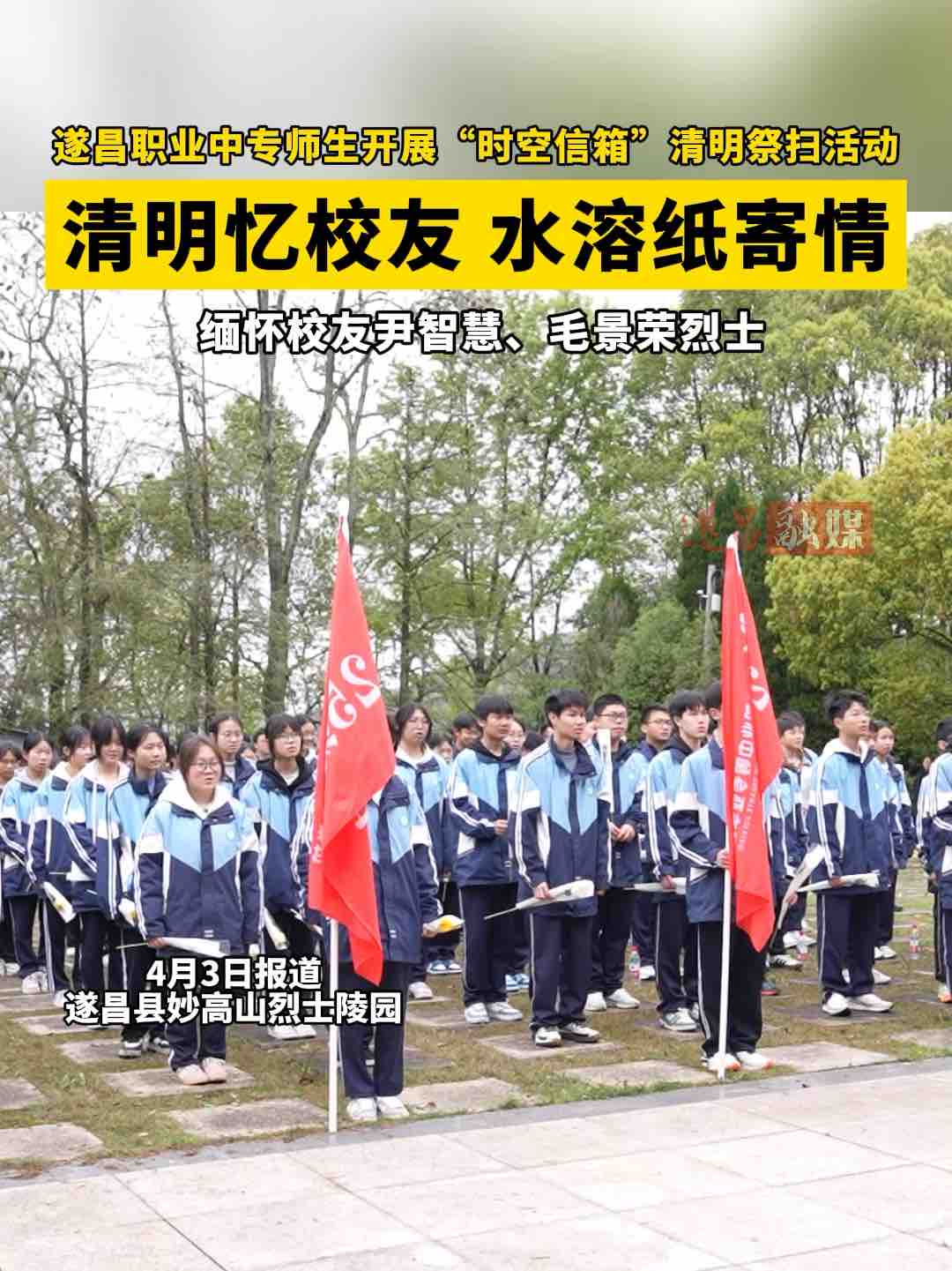 清明忆校友,水溶纸寄情,遂昌职业中专师生开展“时空信箱”清明祭扫活动,缅怀校友尹智慧、毛景荣。