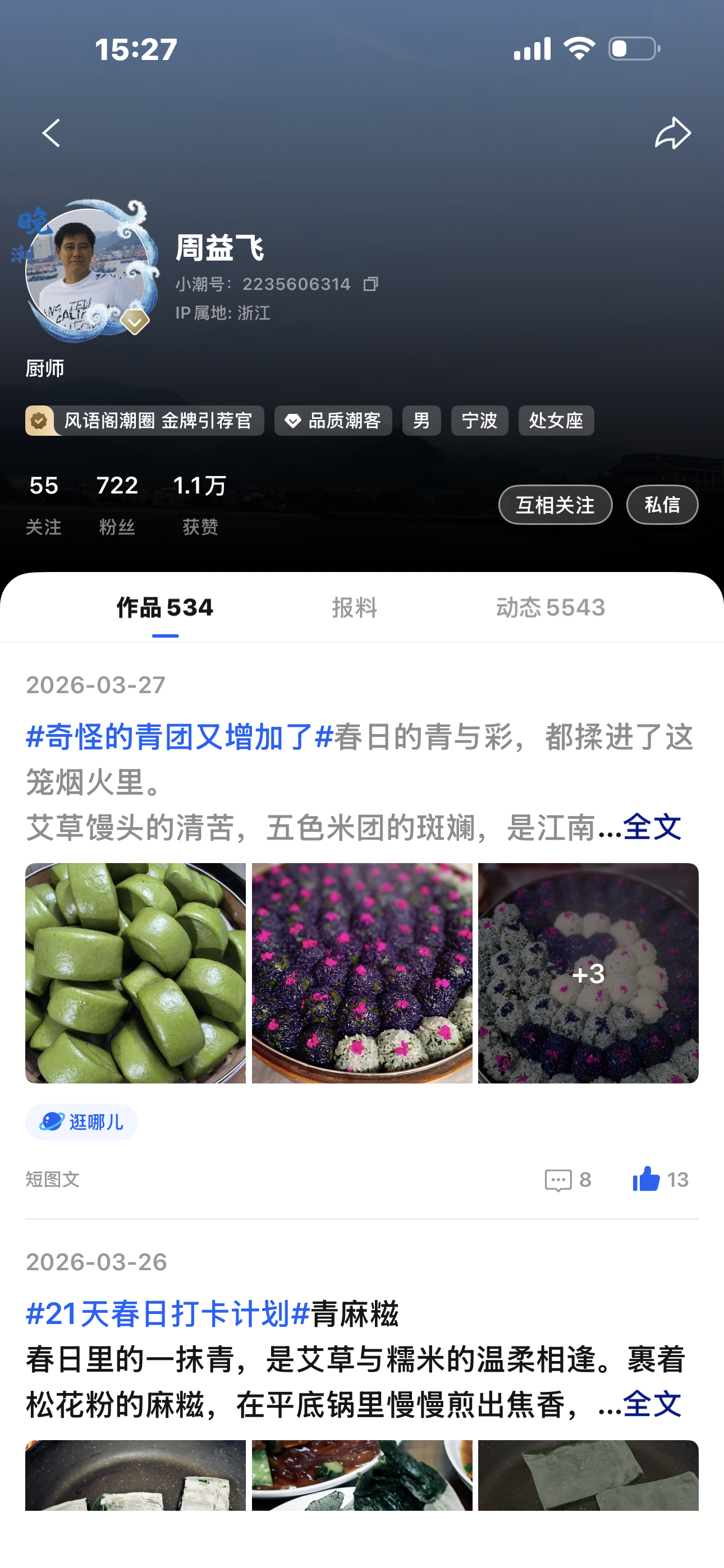 潮里潮气的圈友一周益飞 看到晚潮圈里周老师在写徐老师,陈老师在写邱老师,徐老师在写莹姐,各自画像,描述评论,精彩纷呈,好不热闹。我按捺不住手痒,也试着写一篇。今天我要写的是周益飞老师。 我们虽然从未谋面,只在圈内交流过几次,谈不上了解,更称不上熟悉,但通过几番文字往来,品读其作品后,我仍觉得与他有书缘,有亲近感,值得我舞弄拙笔,描摹一番,让大家看见闪闪发光的他。 去年十一月,一个偶然的机会,我重新进入了“潮新闻”栏目。虽说以前就注册过,但只是浏览新闻,从未发过帖子,不过是个匆匆过客。退休后,空闲下来,心里总有一个念头,想写写以往的经历,填补一下空虚,给自己留一份岁月的念想,也给平凡的人生一个交代。发现“晚潮”是个不错的平台,在这里可以自由发挥,直抒胸臆。编辑十分友好,发文审核速度快,很快就能看到自己的拙作。 怯生生地进入群聊,徐老师热情欢迎,周老师、励老师也是一见如故,还有胡老师、邱老师、湛老师、唐老师、孟老师、金老师、王老师、陈老师、汪老师、莹老师、雷老师、小徐老师、何老师、管老师等一干前辈宿将,毫无违和感。亲切友好的气氛一下打动了我,心头一热,有种宾至如归的感觉,好像游子找到了组织,依托感和归属感油然而生。我如饥似渴地拜读各位的杰作,美不胜收,也冒昧斗胆地妄评其美文,没有人责怪,只有鼓励和指点。 其中周老师,我还可以经常与其逗趣挪喻一二,距离感迅速拉近。记得有一次,我想打卡拿书,却不知如何操作。周老师马上加了我的微信,悉心指导。我称他为周老师,他风趣地说,不是老师是厨师。我以为他在打趣,后来到他主页里浏览,果然发现了许多美食文章,还有他当厨师的经历记叙,还有他身穿厨师服的工作照。我瞬间被震惊了:一个烟火满怀的厨师,竟能一手舞勺,一手挥笔,写下这么多感人至深、美轮美奂的文字,真是一个奇才! 原来我印象中肥头胖耳、满身油腻的厨师,竟也可以有如此深厚的文学情怀。请原谅,这不是我对厨师的偏见,可能我对这个群体不够了解,只尝过他们亲手烹饪的佳肴,从未见过他们写下的美文。从认识周老师起,我信了——厨师也能上得厅堂,舞文弄墨,吟诗作赋。 周老师说话风趣幽默,性格耿直,为人实诚。记得有一次临近深夜,他在圈内晒煮螃蟹,引得我垂涎欲滴,于是我笑问他在哪里美食,发个定位我赶过去共享,他还真发了个定位给我。这份实诚,让我心生感动! 他很活跃,担任风语阁金牌引荐官,经常在各个圈子里发帖活跃气氛。他很热情,对待圈友如亲如故,点赞评论,不吝美辞。他很有才,被评选为2025年度潮新闻最具活力创作者。他很勤奋,笔耕不辍,出文精彩,描景状物,抒情自然,情景交融,令人称奇。他很热心,在圈内教大家如何烹饪美食,具体到如何准备食材,每步操作要领,交代得一清二楚,让大家学会了好多佳肴美味的制作。 总之,周老师的闪光点处处皆是,我一言难尽,期待大家一起发现。为此,我强烈推荐周老师为闪闪发光圈友。