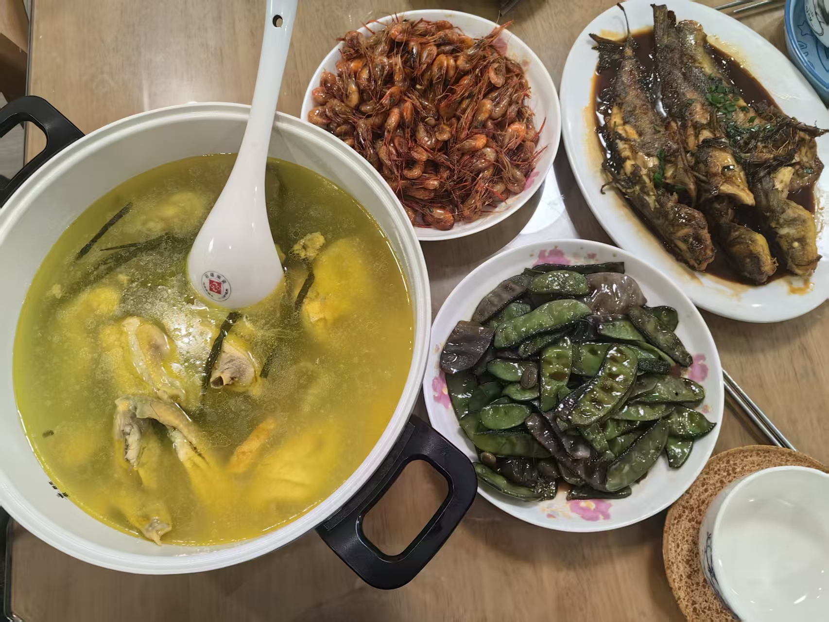 每逢腊八节,一定少不了腊八粥!老家的腊八粥和许多地方不一样——是咸味的。主要食材是当年新鲜的本地大米和糯米+香酥芋艿、茨菇、花生米、青菜或大白菜、黄豆、红豆(赤豆)等土特产。腊八粥一般都是中午开始熬煮,晚上开吃。这样烧成的腊八粥,糯糯的,稠稠的,香味十足,颜色有红有黄,有绿也有白,一看就十分诱人。还有个关键细节,就是吃腊八粥的时候,要加一点猪油——可谓画龙点睛,那个香、那个肥啊,真是忘不了的小时候的味道!因为好吃,所以一般平时吃一碗的小孩们都要吃两碗,都要吃到很饱,甚至有点撑的程度。每逢腊八节那天晚上,一家人欢聚一堂的氛围,一点都不亚于春节了。