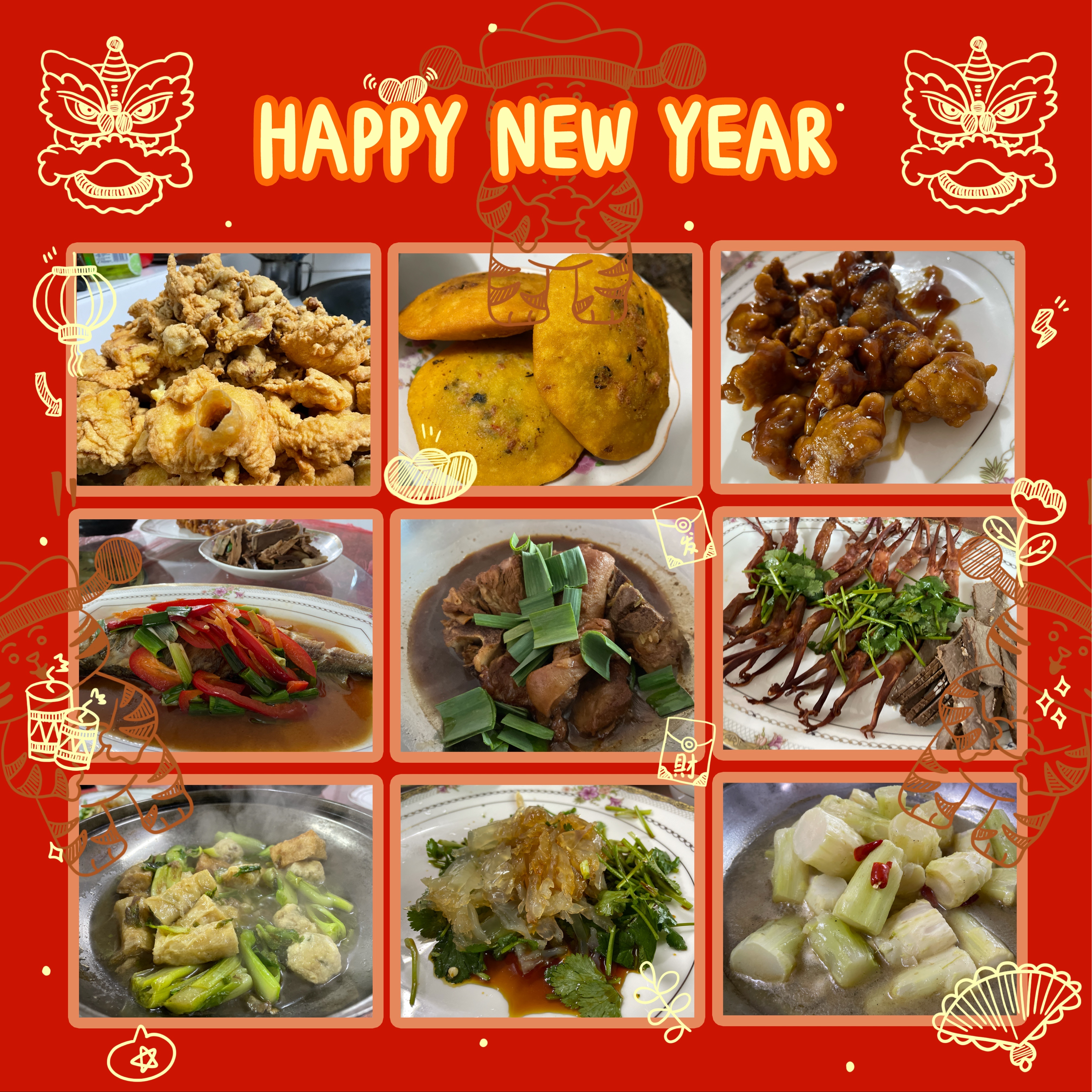 #晒新年餐桌# #晒新年餐桌#很庆幸能回婆婆家吃上年夜饭,原本以为疫情回不了,索性今年没有其他亲戚,一家五口简简单单,菜量减少,数量不减,一起光盘,当然除了一点鱼头剩下了,为了来年的好兆头嘻嘻😜 松花肉,玉米果,肉丸子,糖醋里脊,油豆腐,春卷,从原材料到成品,全靠婆婆一双勤快的手,都是老底子的手艺,只在过年才能吃到的舌尖上的美味!在我眼里,比鸡鸭鱼肉各种海鲜都要好吃N倍😂 祝大家除夕快乐,虎年大吉✌️