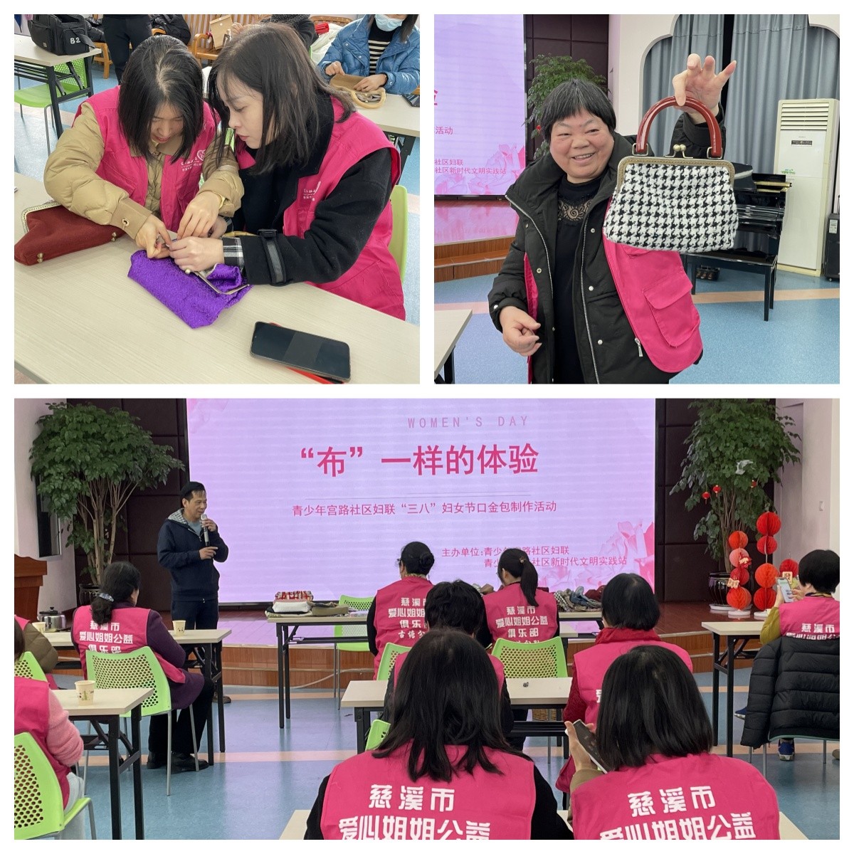 温情三月,浓情三八——古塘街道青少年宫路社区开展三八女神节活动 在三八妇女节即将来临之际,为给社区内的“女神”们献上一份节日惊喜与别致体验,3月5日上午,古塘街道青少年宫路社区联合慈溪市实验幼儿园组织开展了“‘布’一样的体验”三八妇女节口金包制作主题活动,邀请周芹老师带领二十四位“女神”一同制作口金包,共同体验古典手工的魅力。