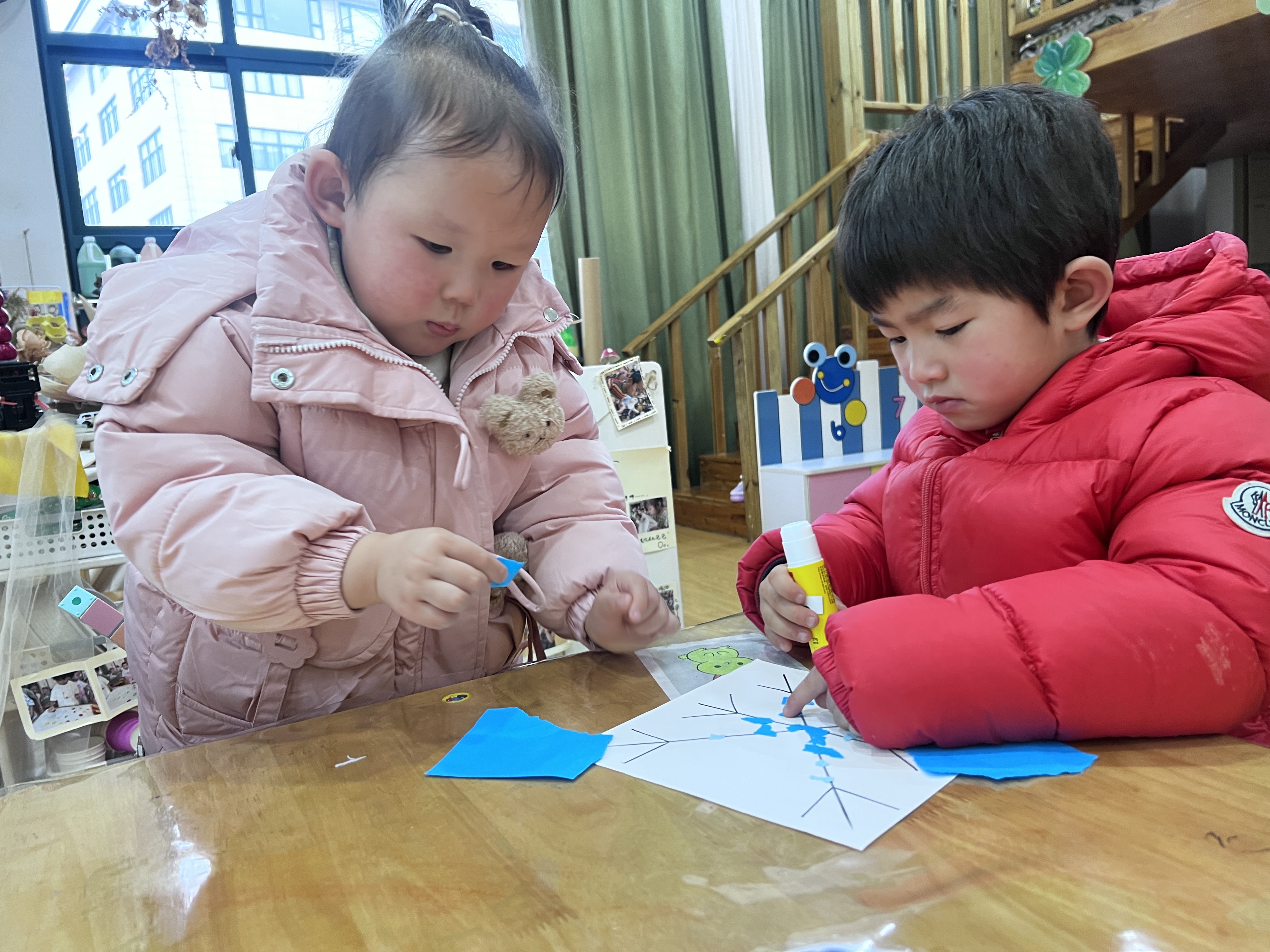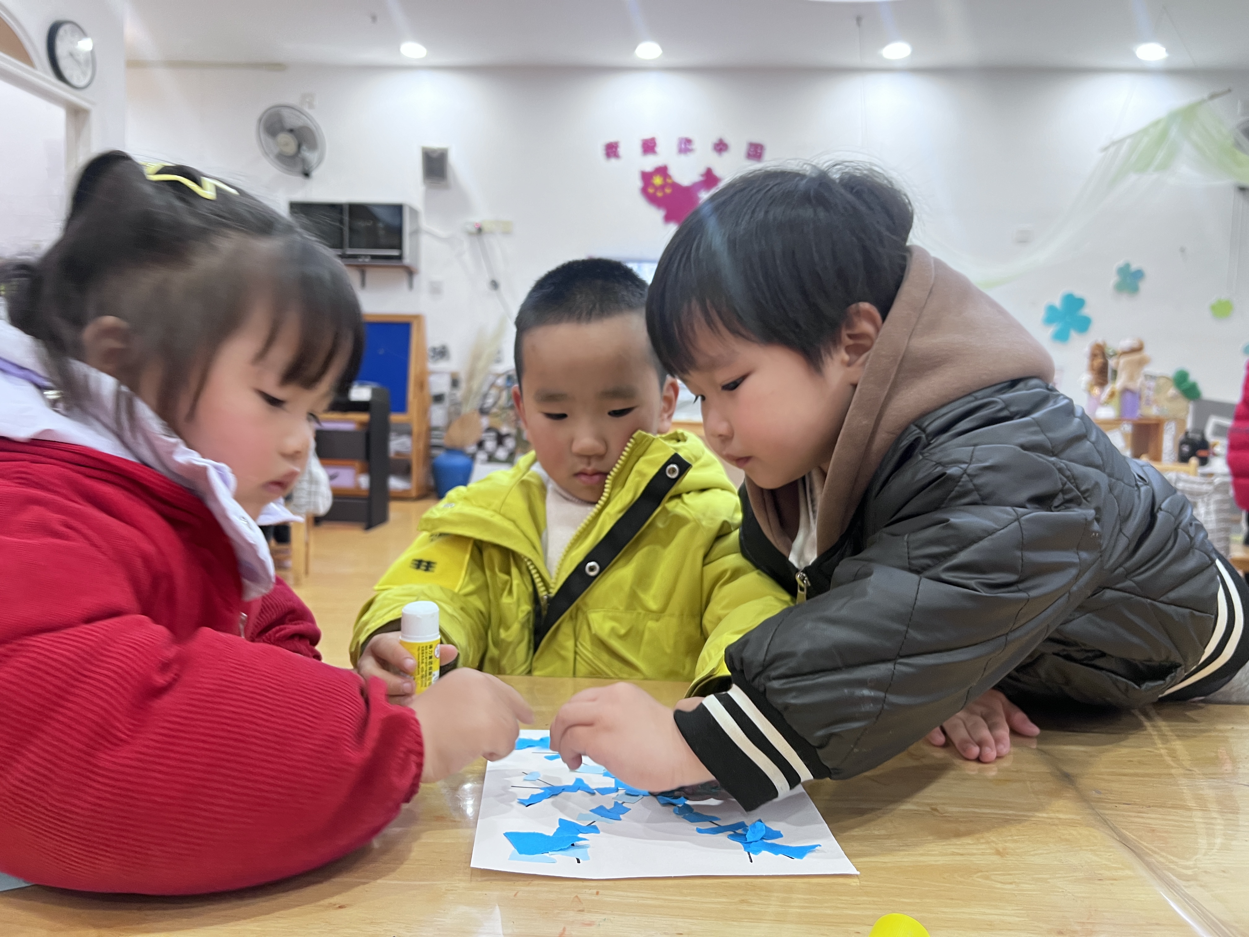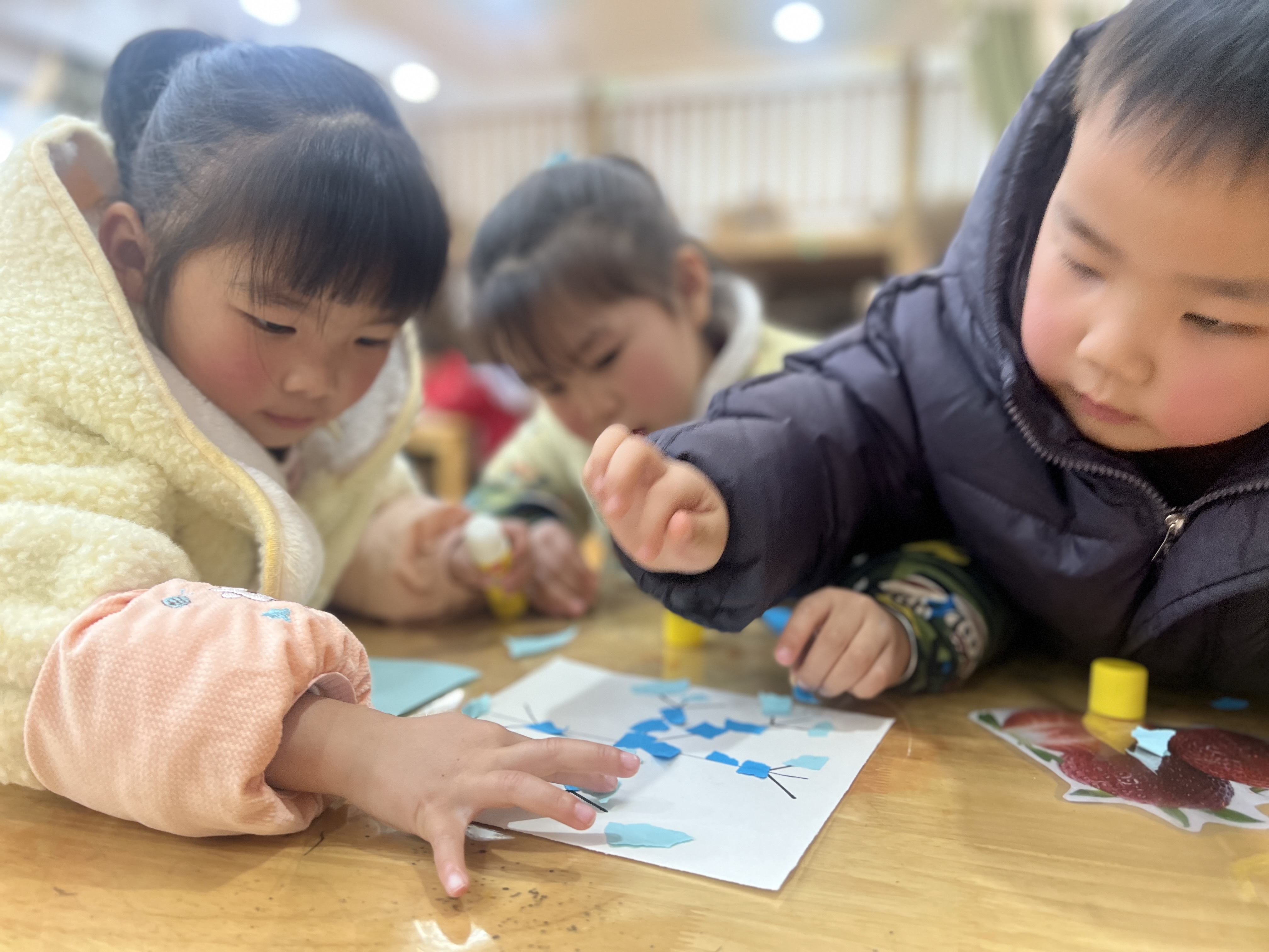 《“撕”出冬日浪漫:幼儿园小班雪花创意秀》 近日,绍兴市柯桥区兰亭街道阮江幼儿园小班的小朋友们在老师的带领下,开展了一场充满趣味的撕贴小雪花活动,在冬日里营造出了一片别样的浪漫雪景。 活动现场,老师首先通过生动有趣的故事和精美的图片,向小朋友们介绍了雪花的形状和特点,激发了孩子们对雪花的浓厚兴趣。随后,小朋友们迫不及待地拿起彩纸,开始创作自己心中的小雪花。虽然小班的孩子们年龄尚小,但他们的创造力和动手能力却令人惊叹。他们用稚嫩的小手小心翼翼地撕出一片片形状各异的“雪花”,有的大如手掌,有的小巧玲珑。孩子们还充分发挥想象力,用彩笔为雪花添上了各种独特的图案和色彩。 在整个活动过程中,小朋友们都沉浸在创作的快乐中,教室里充满了欢声笑语。此次活动不仅锻炼了孩子们的动手能力和想象力,还让他们在轻松愉快的氛围中感受到了冬日的美好。