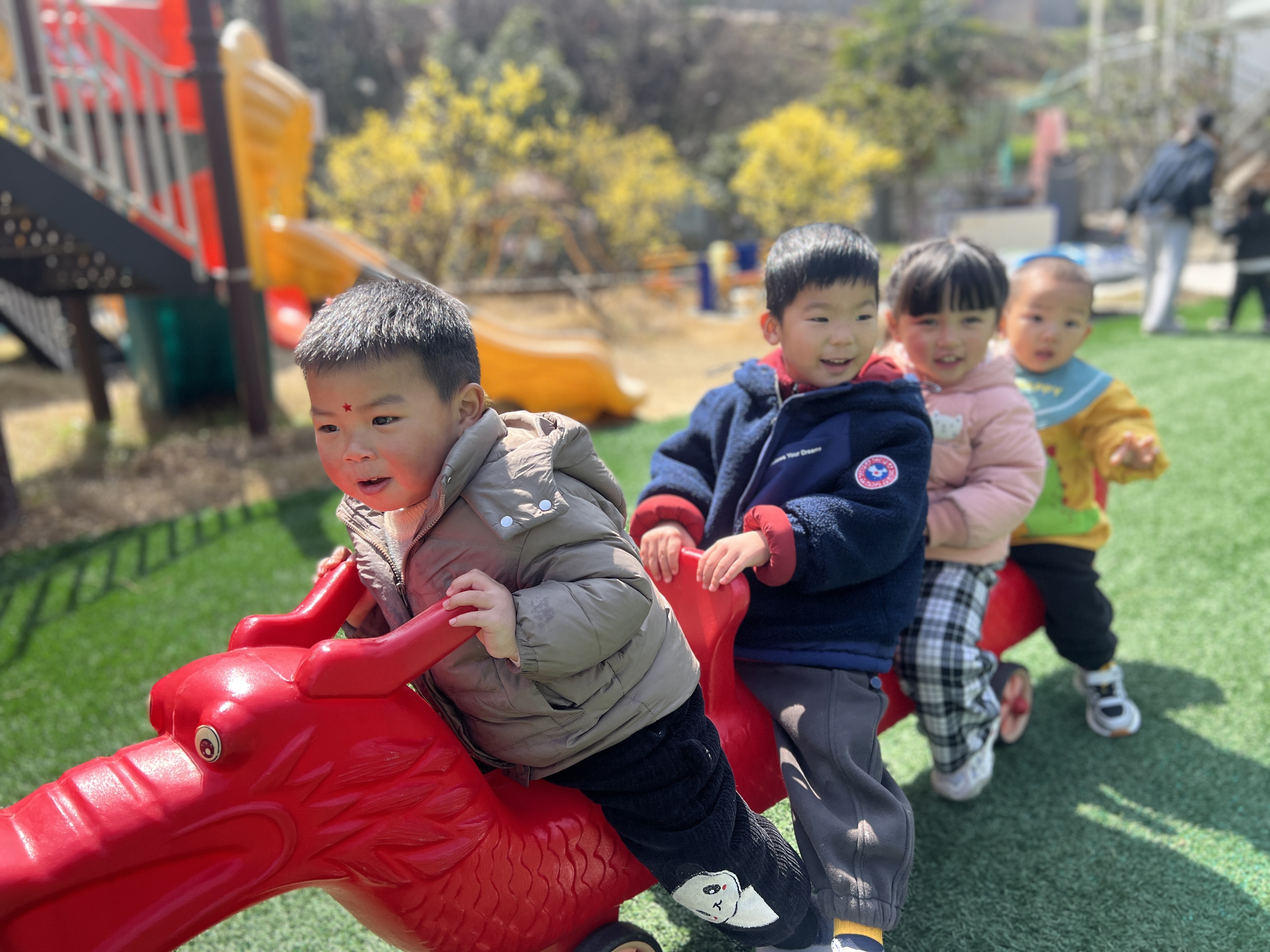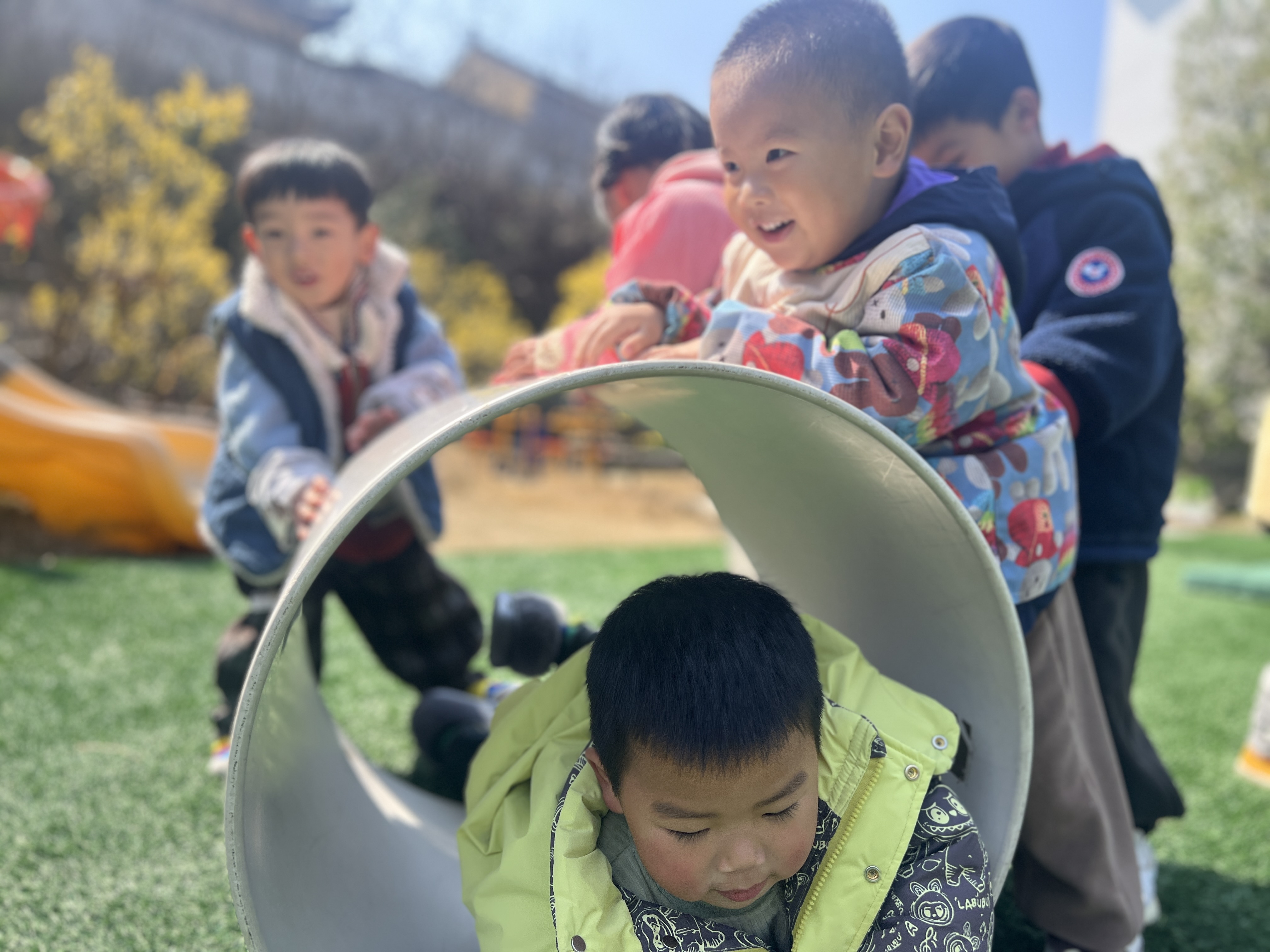 托班宝宝在游戏里爱上幼儿园 阳光明媚,微风轻拂。在兰亭中心幼儿园的户外草坪上,托班的宝宝们正排着队,井然有序地玩着钻管道游戏。只见一个穿着黄色外套的宝宝,小心翼翼地爬进管道,小眼神里透着好奇与探索的欲望。管道外,其他宝宝们则在耐心等待,时不时发出欢快的笑声和呼喊声,为正在钻管道的小伙伴加油鼓劲。老师们在一旁细心守护,适时给予鼓励和指导,让宝宝们感受到满满的安全感。除了钻管道游戏,幼儿园还精心准备了拼图、搭积木等室内游戏。搭积木的区域里,宝宝们充分发挥自己的想象力,搭建出各种各样的造型,有的是小小的城堡,有的是高高的楼房。 通过这些有趣的游戏,不仅能让宝宝们在轻松愉快的氛围中熟悉幼儿园的环境和老师、小伙伴,还能有效缓解他们的分离焦虑,帮助他们更好地适应集体生活。