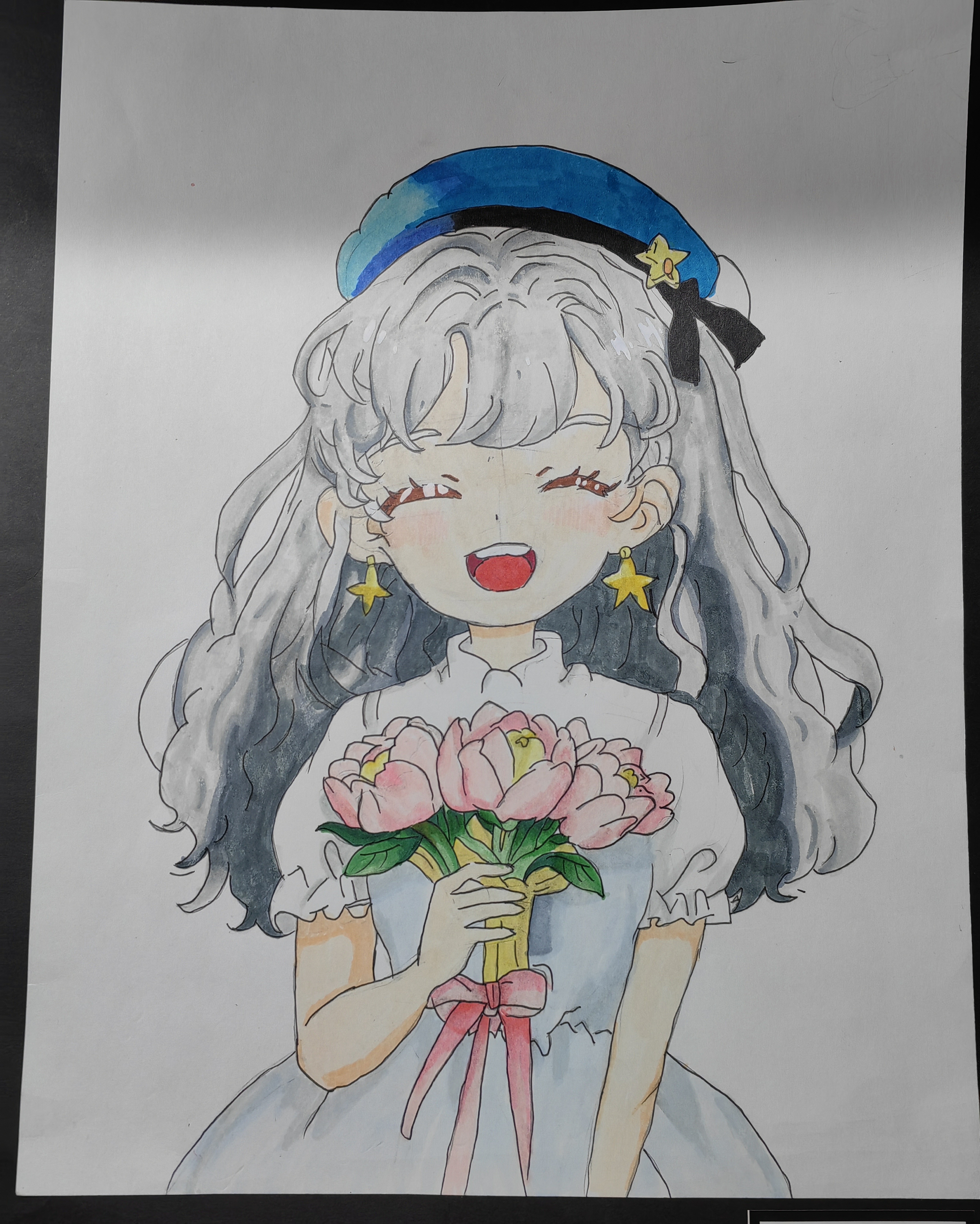 绍兴市柯桥区实验小学 四(5)班 陈思妍 银发少女的春日花束,水彩里的小确幸~闭眼欢笑,连风都是甜的!