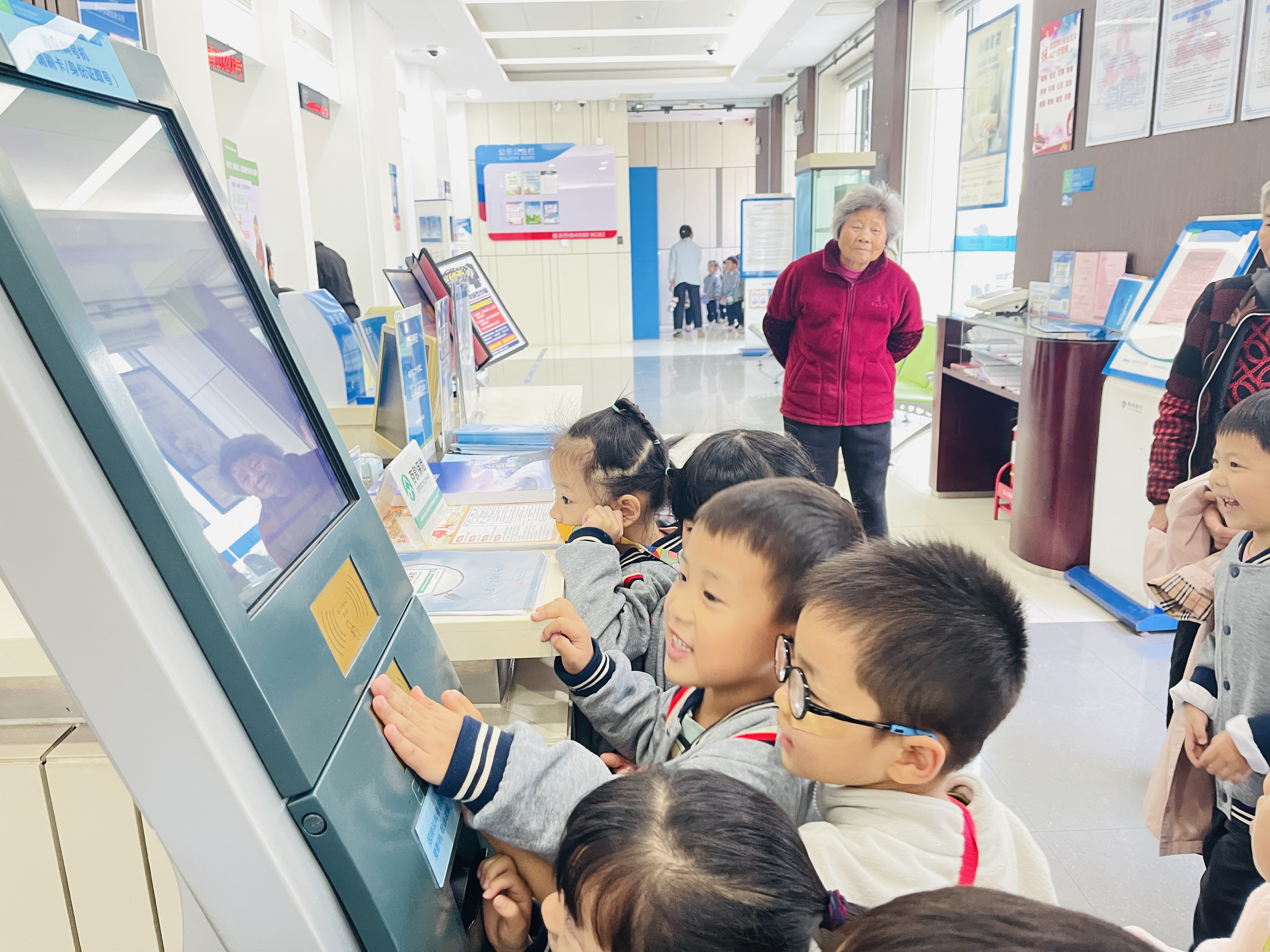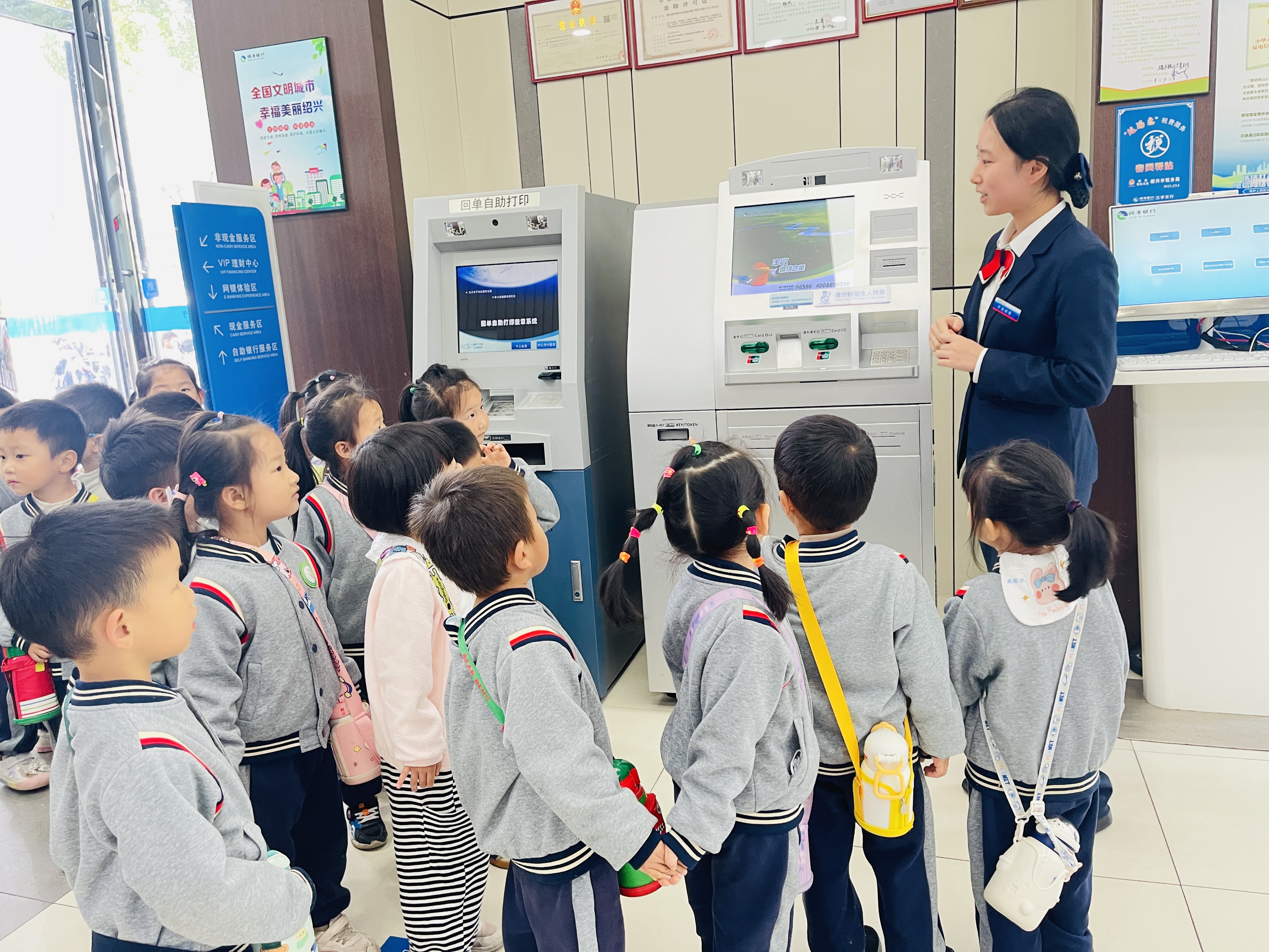 为拓宽幼儿视野、普及基础金融知识,近日,兰亭中心幼儿园中2班幼儿走进社区银行,开展了一场生动有趣的实地探索活动。 在银行工作人员的热情引导下,孩子们先后参观了业务办理区、自助柜员机等区域,认真聆听工作人员讲解银行的功能、货币的由来以及存钱、取钱的基本流程。互动环节中,孩子们化身“小小客户”,体验模拟存钱、识别不同面额人民币,在实践操作中感受金融服务的便捷。工作人员还通过趣味问答,帮助幼儿树立初步的金钱观和储蓄意识。