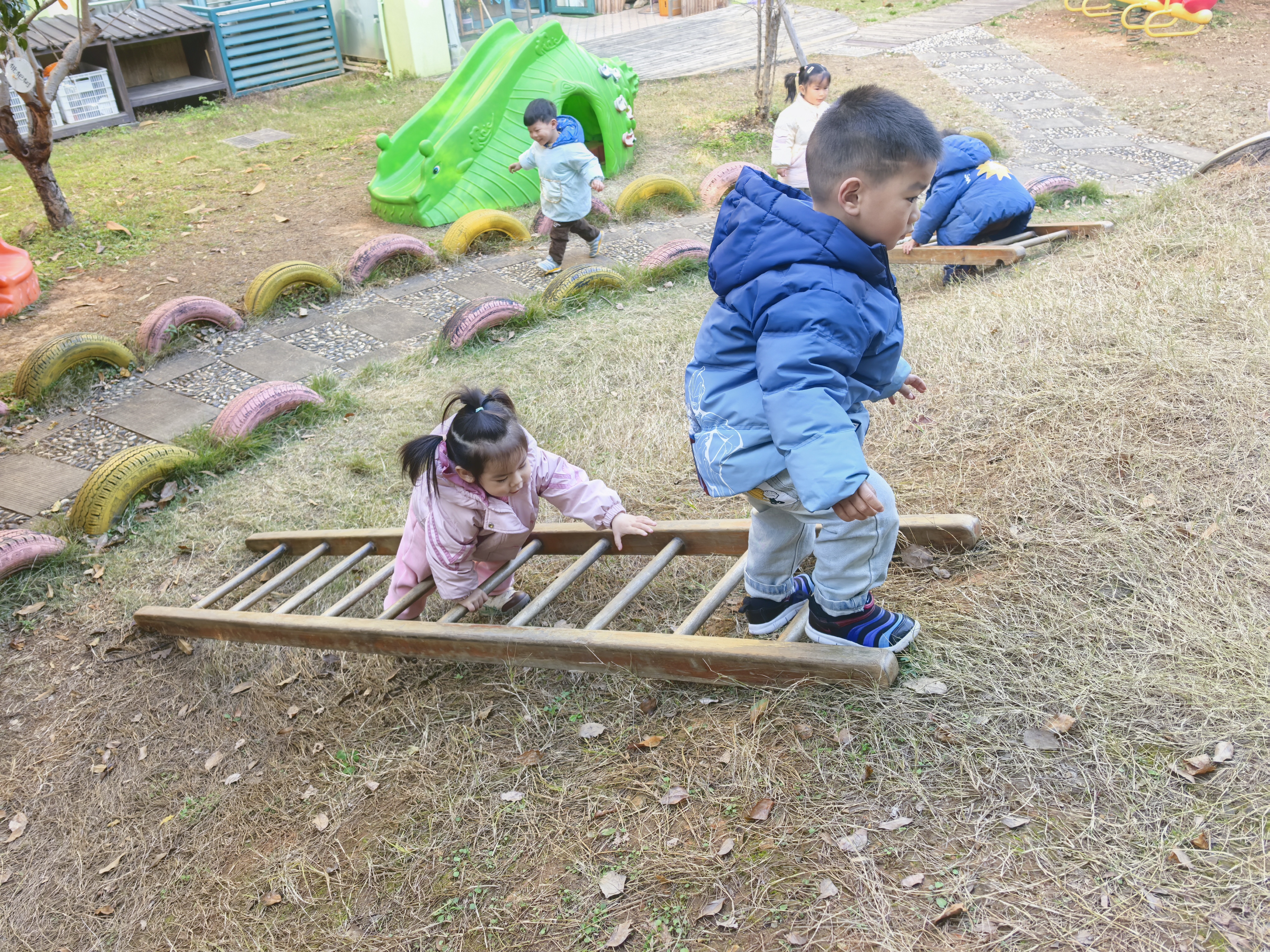 幼儿园户外场,萌娃们撒欢啦:木梯成“挑战台”,小女孩手脚并用地爬,男孩稳稳迈步;一旁轮胎小径、绿色滑梯候场,笑声裹着冬日暖阳,把户外时光酿成甜甜的快乐。