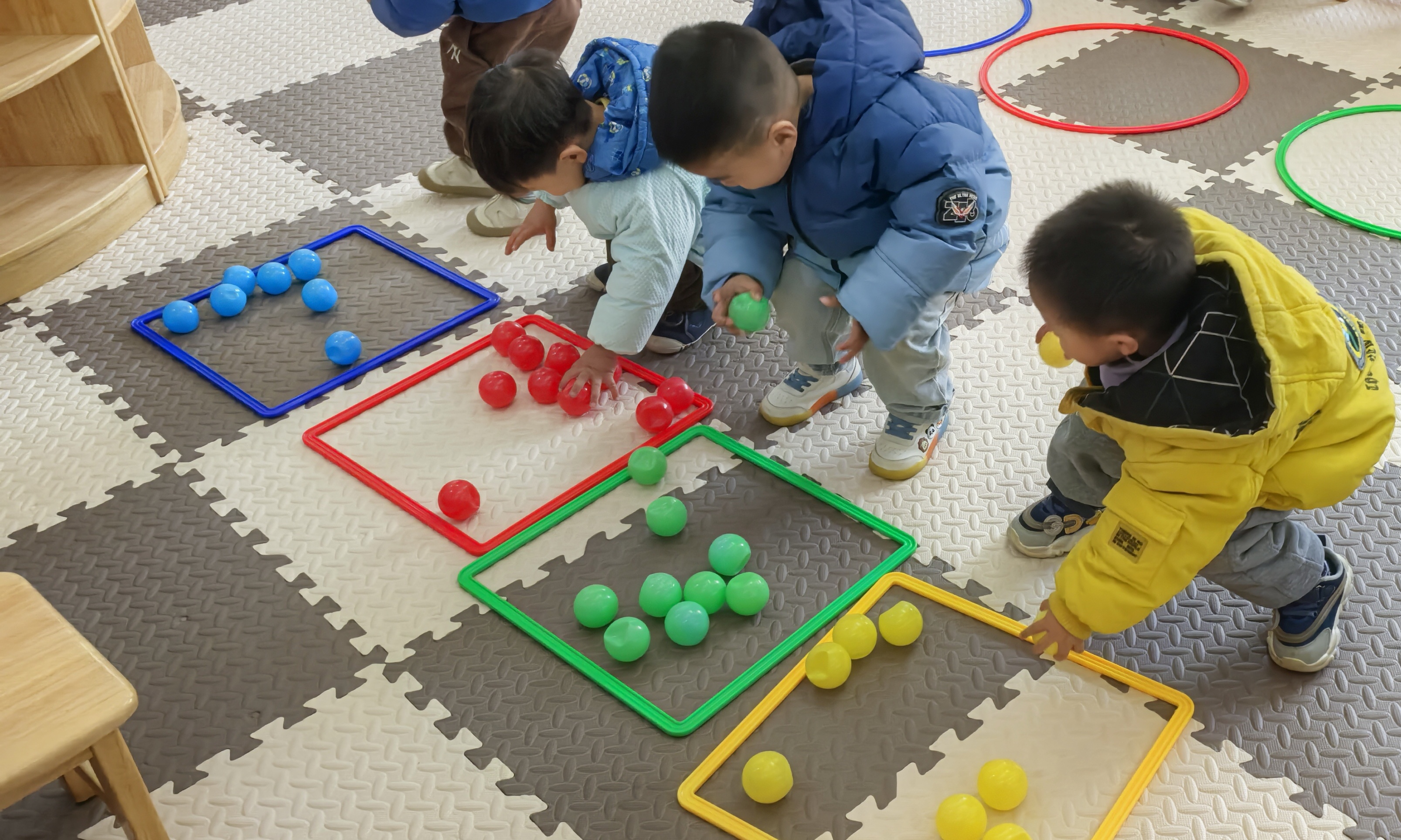 今日托班教室,几个萌娃正忙着给彩球“找家”:蓝框归蓝球、红框收红球……小手忙个不停,有的蹲身扒拉,有的举球瞄准,错放的彩球还会被同伴“纠正”,软糯的动作里满是认真,把色彩分类玩成了热闹的小游戏。