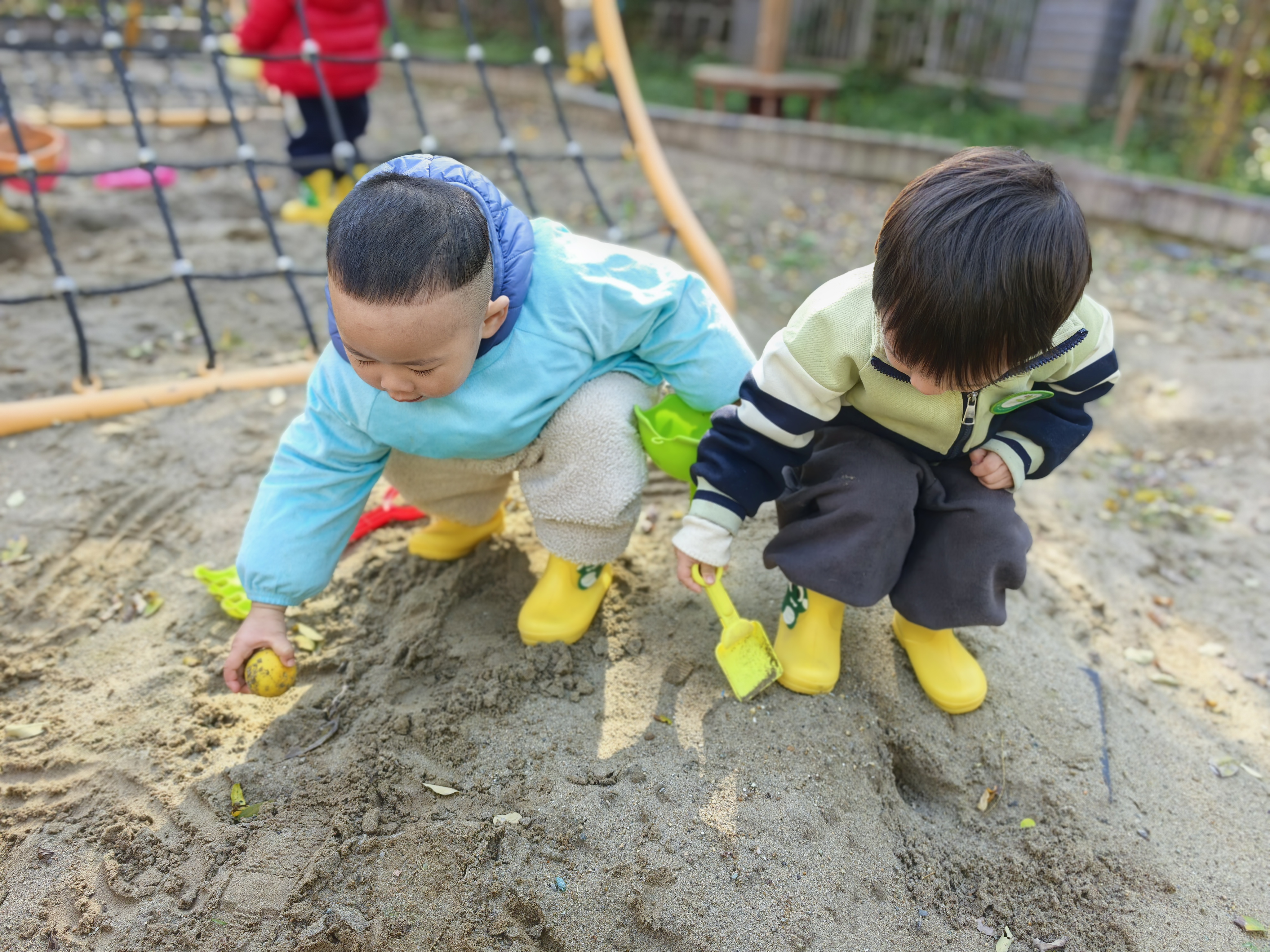 12月8日,兰亭中心幼儿园沙坑区里,两名豆豆班小朋友正专注“藏橘子”:瑞瑞攥着黄橘子埋进沙堆,同伴举小铲帮忙掩土,黄雨靴沾满细沙也不在意。阳光里,简单游戏漾开孩童的纯粹快乐,成了园里冬日最暖的小风景。