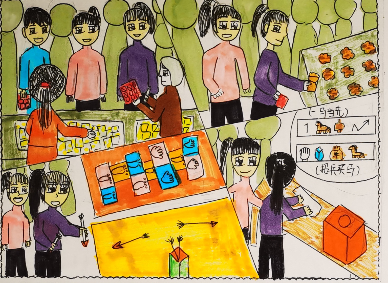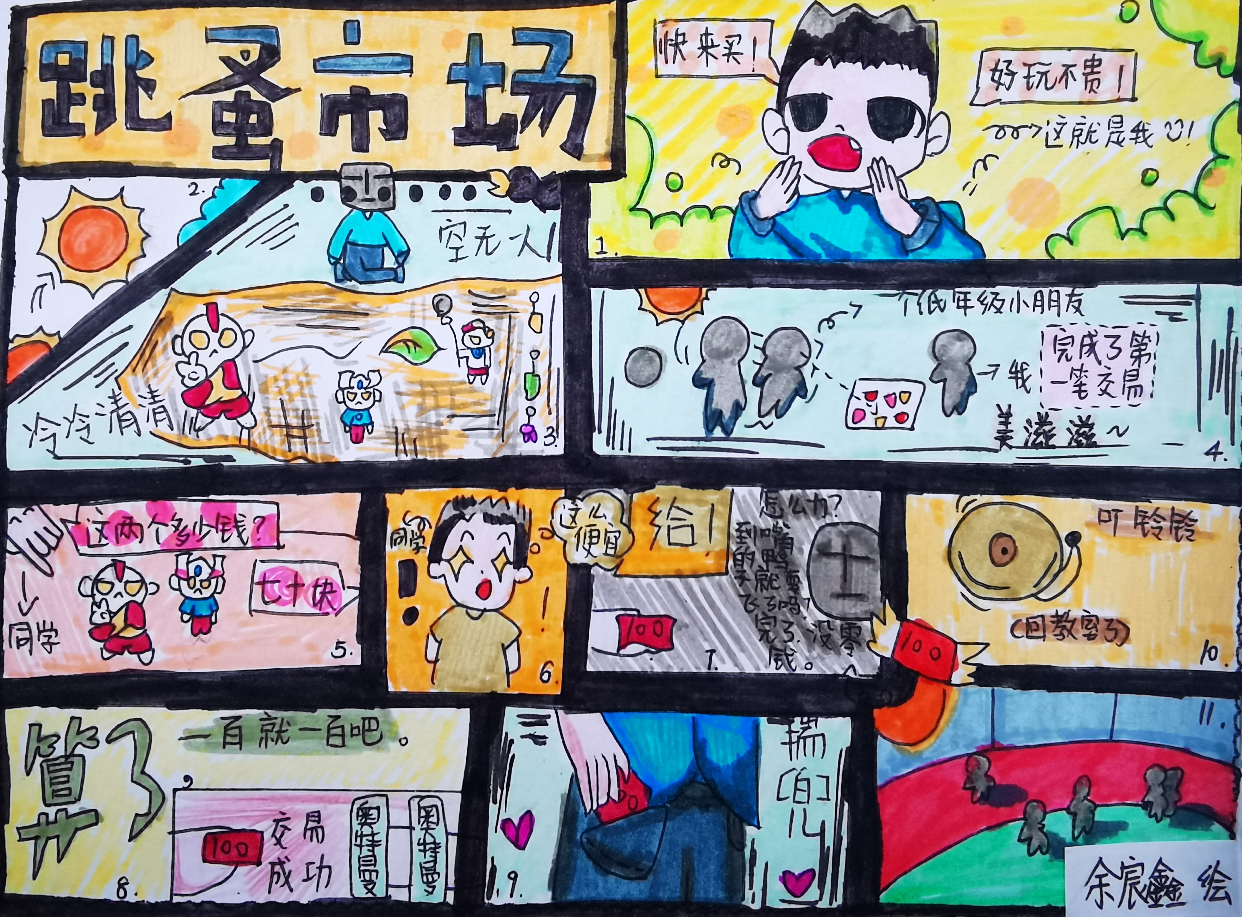 "飞了"的生意又回来了 建德市明镜小学603班 陈宇伦 指导老师 张晓玲 今天是我们期待己久的校园“跳蚤市场”活动日。一大早,同学们就各个拎着鼓鼓囊囊的袋子,里面装满了要售卖的小玩意儿,叽叽喳喳的讨论声里,全是对下午活动的期待。 我扒着窗户,盼啊盼,盼啊盼,终于盼到了下午的活动时间。我们排着队飞快来到操场上,在指定位置手忙脚乱地摆开摊子。我把玩具、小摆件一一摆好,就扯开嗓子大声吆喝起来。可喊了半天,摆位前还是冷冷清的。我心里直打鼓。就在我快要泄气的时候,一个低年级的小同学慢悠悠走到我的摊位前,蹲下身子在盒子里翻来翻去,最后拿起一个奥特最人偶,问:“这个多少钱?”我心里一盘算,脱口而出:“三十块。”小同学瞪大了眼睛:“啊?三十,太贵啦!”说着一蹦一跳就要走,我赶紧拉住他:“二十!二十你要不要?”他愣了一下,立马掏出二十元钱给我,像捡到宝贝似的,抓起人偶就蹦跳着走了。我捏着这“第一桶金”,小心翼翼地塞进口袋,心里乐开了花儿,又赶紧继续吆喝起来。 可好运好像一下子溜走了,接下来好半天,都没有人再光顾我的摊位。我扭头一看,李忠缘和郑俊骐合开的小摊挤得水泄不通,李忠缘正低着头数着他一笔袋的钱,郑俊骐的盒子也装得满满当当,羡慕得我直发呆。突然,徐文博拍了拍我的肩膀:“陈宇伦,你摊前有人啦!”我猛然回过神,只见一个同学正拿着一个隐藏款人偶和一个封面款的,抬头问我:“这两个多少钱?”我快速一算,说:“七十卖给你。”他一听,大喜过望,我心里也暗喜:这肯定是个懂行的,这下我也算发财了! 谁知他掏出一张100元递给我,我瞬间傻了眼,我身上压根没准备多少零钱。我只得硬着头皮说:"我……我没散钱找你。"他叹了口气,转身便走,我看着他的背影,心里别提多懊恼了,感觉到嘴的鸭子飞走了。 就在我沮丧不已时,那个同学竟然又折了回来,摆摆手说:“算了,一百就一百吧,不用找了。”说完把钱塞给我,拿起两个人偶就走了。我赶紧把钱揣进兜里,心怦怦直跳,激动得差点跳起来。 没过多久,“跳蚤市场”结束的广播声就响了,这次特别的体验,让我尝到了做小老板的酸甜,也成了我校园生活里一次超难忘的回忆。
