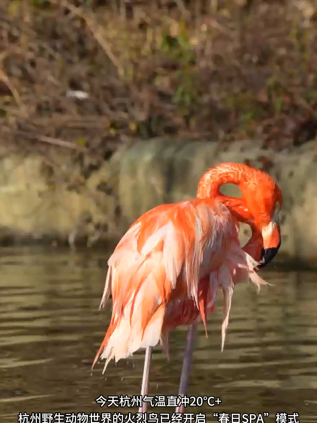 【#杭州冬天一秒入春#?火烈鸟先洗为敬!】 今天杭州气温直冲20℃+,杭州野生动物世界的火烈鸟已经开启“春日SPA”模式! 梳羽、戏水、阳光下闪闪发光…这画面也太治愈了!谁说冬天只有萧瑟?生命的热烈从未缺席。#杭州身边事 #治愈系动物 #冬日暖阳的奇遇 #杭州的冬天被开除啦