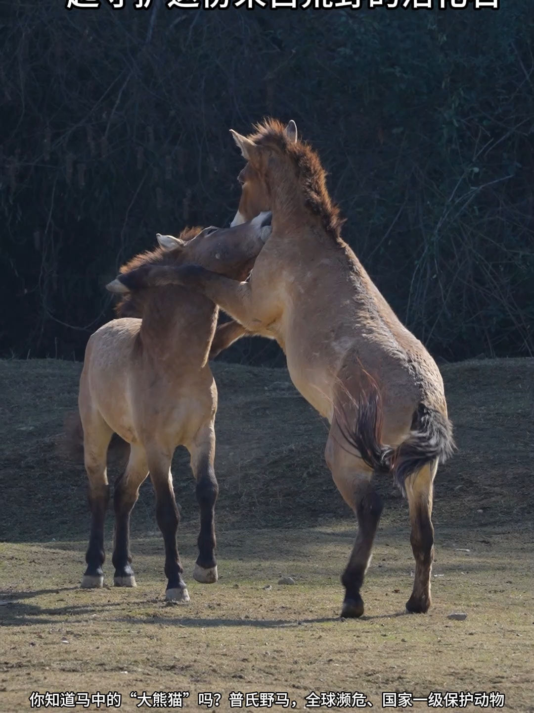 【#荒野活化石打起架来这么帅!】 你知道马中的“大熊猫”吗?普氏野马,全球濒危、国家一级保护动物,地球上现存唯一的野生马种!这段罕见视频来自杭州野生动物世界,两匹普氏野马嬉戏打闹,展现6000万年不变的原始野性。它们曾在中国消失,又因“野马返乡计划”奇迹归来。2026年正值该园引进普氏野马25周年,一起守护这份来自荒野的活化石!#保护生物多样性 #动物世界真奇妙