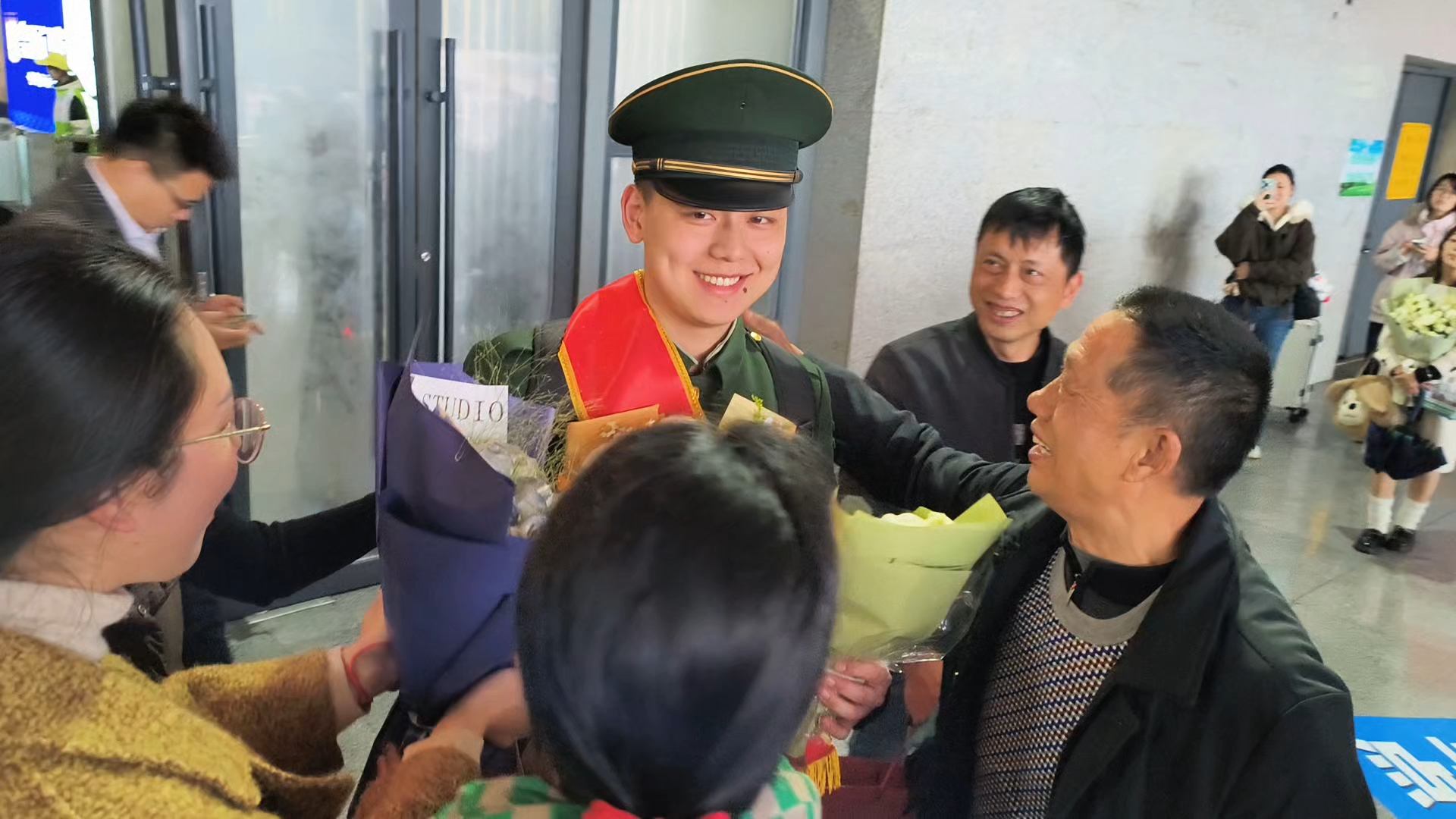 热血男儿荣归故里 全家欢聚温情满站 3月1日,服役两年的江西省抚州市临川区籍战士光荣退伍返乡。抚州火车站出站口,外公、父母、表姐等家人早早地在出站口手捧鲜花等候,满怀期待与激动。亲人相见,热泪盈眶,紧紧相拥,欢声笑语中满是思念与牵挂,温馨场面令人动容。