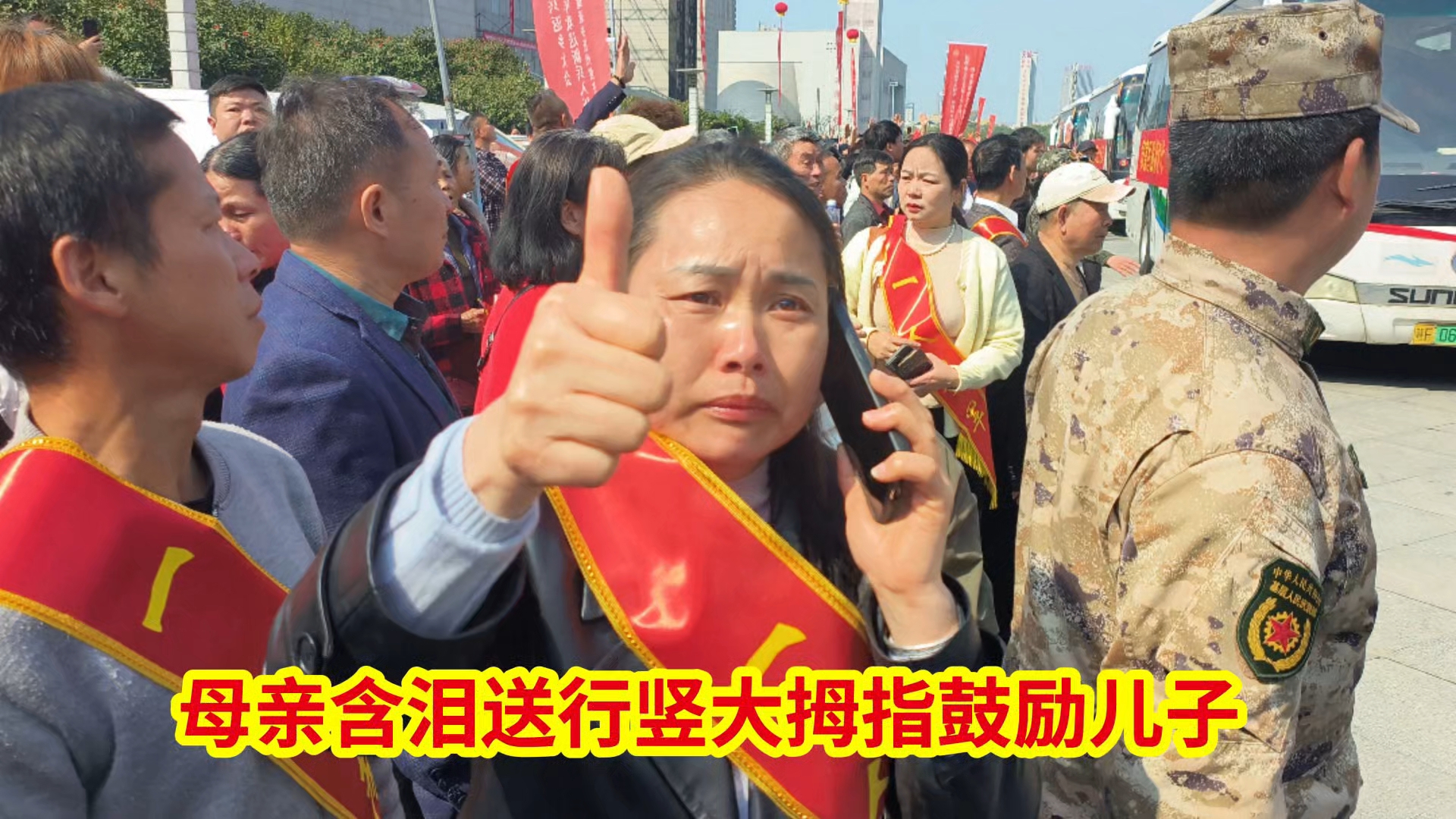 母亲含泪送行竖大拇指鼓励儿子 3月15日,江西省抚州市汤显祖大剧院送兵现场出现感人至深一幕。临别一刻,泪水划过脸庞,母亲却未发一言,只是坚定地对着儿子竖起大拇指。这轻轻的一竖,汇聚了千言万语的嘱托与期望。儿子身着戎装,含泪点头回应。这“无声胜有声”的一幕,把母爱与家国大义诠释得淋漓尽致,瞬间温暖了全场。致敬这份深沉的牵挂!